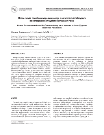 Medycyna Środowiskowa - Environmental Medicine 2013, Vol. 16, No. 2, 14-22 www.environmental-medicine-journal.eu www.medycynasrodowiskowa.pl Ocena ryzyka nowotworowego związanego z narażeniem inhalacyjnym na benzo(a)piren w wybranych miastach Polski Cancer risk assessment resulting from respiratory tracts exposure to benzo(a)pyrene in selected Polish cities Marzena Trojanowska (a, b, c), Ryszard Świetlik (a, c) Uniwersytet Technologiczno-Humanistyczny im. Kazimierza Pułaskiego, Katedra Ochrony Środowiska, Zakład Chemii Analitycznej Kierownik Zakładu Chemii Analitycznej: dr hab. R. Świetlik, prof. UTH Rad. Kierownik Katedry Ochrony Środowiska: dr hab. R. Świetlik, prof. UTH Rad. (a) opracowanie koncepcji i założeń (b) zabranie i opracowanie materiału do badań (c) opracowanie tekstu i piśmiennictwa STRESZCZENIE ABSTRACT Wstęp: W pracy dokonano oceny ryzyka nowotworowego mieszkańców wybranych miast Polski wynikającego z narażenia inhalacyjnego na benzo(a)piren obecny w powietrzu atmosferycznym. Uwagę skoncentrowano na ocenie całożyciowego narażenia osoby dorosłej oraz dziecka. Materiał i metody: Analizowano narażenie mieszkańców dużych aglomeracji i wybranych miast średniej wielkości. Zastosowano metodologię zalecaną przez amerykańską Agencję Ochrony Środowiska (US EPA). Wyniki: Wyznaczone wartości ryzyka nowotworowego dla przyjętego scenariusza narażenia mieszkańca na B(a)P drogą inhalacyjną są od kilku do kilkudziesięciu razy wyższe od wartości wyznaczonych dla tła środowiskowego. Wnioski: Spośród badanych populacji najbardziej narażone są dzieci, dla których wyznaczone ryzyko nowotworowe przyjmuje wartości największe. Słowa kluczowe: narażenie inhalacyjne, WWA, benzo(a)piren, ryzyko nowotworowe Introduction: The paper assesses the benzo(a)pyrene respiratory cancer risk in the residents of selected Polish cities. Attention focused on the evaluation of lifetime benzo(a)pyrene exposure for adults and children. Material and methods: The exposure, of selected large and mediumsize city residents, was surveyed. Methodology has been recommended by the US Environmental Protection Agency. Results: Cancer risk values for the assumed scenario of B(a)P respiratory exposure are from several to about thirty times higher in comparison to values set for environmental background. Conclusion: Among the studied residents children are mainly at cancer risk. Key words: respiratory exposure, PAH, benzo(a)pyrene, cancer risk WSTĘP zaliczane do tzw. trwałych związków organicznych charakteryzujących się długim czasem przebywania w środowisku, zdolnością do bioakumulacji oraz wywoływaniem szkodliwych efektów dla zdrowia ludzkiego i środowiska naturalnego. Mają opinię jednych z najbardziej niebezpiecznych zanieczyszczeń powietrza i głównie z tego powodu są nadal w centrum zainteresowania badaczy [1–3]. Najbardziej znanym związkiem z grupy WWA i monitorowanym w powietrzu atmosferycznym Polski jest benzo(a)piren (B[a]P) [4, 5]. Dynamiczny rozwój przemysłu, energetyki i sektora transportu jest źródłem emisji wielu substancji wpływających negatywnie na zdrowie człowieka i stan środowiska naturalnego. Do szeroko rozpowszechnionych i niebezpiecznych związków należy zaliczyć wielopierścieniowe węglowodory aromatyczne (WWA). WWA stanowią liczną grupę związków zbudowanych z 2–8 skondensowanych pierścieni aromatycznych. WWA są Nadesłano: 1.03.2013 Zatwierdzono do druku: 29.03.2013 Medycyna Środowiskowa - Environmental Medicine 2013, Vol. 16, No. 2 Marzena Trojanowska, Ryszard Świetlik: Ocena ryzyka nowotworowego związanego z narażeniem inhalacyjnym na benzo(a)piren… Głównym źródłem emisji WWA do atmosfery jest proces spalania paliw kopalnych (przede wszystkim węgla) oraz drewna i odpadów. Za emisję WWA odpowiedzialny jest także przemysł i transport drogowy [4–8]. Związki WWA są również składnikiem dymu tytoniowego. Mogą być także obecne w żywności w wyniku poddawania jej obróbce termicznej podczas procesów takich jak wędzenie, grillowanie, smażenie czy pieczenie [9]. Globalna emisja WWA do powietrza, która obejmuje źródła naturalne i antropogeniczne jest oceniana w skali roku na 520 Gg. Rozkład emisji nie jest równomierny, dominują kraje azjatyckie – 55% globalnej emisji. Na drugim miejscu jest Afryka – 19% (spalanie biomasy), na trzecim Europa – 10%. Udziały pozostałych kontynentów nie przekraczają kilku procent: Ameryka Północna – 8%. Ameryka Południowa – 6% i Oceania – 1,5% [10, 11]. W Polsce, podobnie jak w innych krajach UE, prowadzona jest stała inwentaryzacja emisji zanieczyszczeń powietrza, w tym również WWA [7]. Wielkość emisji WWA do powietrza jest określana na podstawie oceny emisji czterech związków wskaźnikowych: benzo(a)pirenu, benzo(b)fluorantenu, benzo(k)fluorantenu i indeno(1,2,3-cd)pirenu. W Polsce w 2009 roku emisję WWA oceniono na 132,3 Mg. Emisje benzo(a)pirenu, benzo(b)fluorantenu i indeno(1,2,3cd)pirenu miały poziom zbliżony (ok. 40 Mg/rok), natomiast emisja benzo(k)fluorantenu była trzykrotnie niższa [7]. Decydujący wpływ na wielkość emisji WWA w Polsce mają procesy spalania poza przemysłem (sektor komunalny i mieszkaniowy, rolnictwo, leśnictwo) – 87,5%, znacznie mniejszy udział mają procesy produkcyjne (produkcja koksu i aluminium) – 9,5% [7]. Udział transportu drogowego nie osiąga nawet dwóch procent. W tym ostatnim przypadku za emisję WWA odpowiedzialne jest nie tylko spalanie paliw (głównie oleju napędowego w silnikach Diesla), ale także ścieranie bieżnika opon samochodowych. Całkowita emisja krajowa WWA w 2009 r. stanowiła ok. 94,9% emisji z roku poprzedzającego. Zauważalny spadek emisji dotyczył głównie procesów spalania poza przemysłem i procesów produkcyjnych [7]. WWA są silnie toksyczne dla ludzi. Niektóre związki z grupy WWA wykazują działanie kancerogenne i mutagenne [9, 12, 