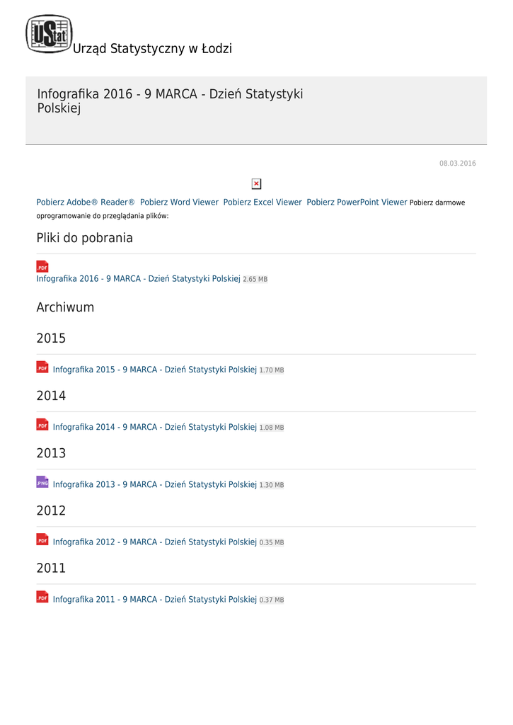 Urząd Statystyczny w Łodzi Infografika 2016 - 9 MARCA - Dzień Statystyki Polskiej 08.03.2016 Pobierz Adobe® Reader® Pobierz Word Viewer Pobierz Excel Viewer Pobierz PowerPoint Viewer Pobierz darmowe oprogramowanie do przeglądania plików: Pliki do pobrania Infografika 2016 - 9 MARCA - Dzień Statystyki Polskiej 2.65 MB Archiwum 2015 Infografika 2015 - 9 MARCA - Dzień Statystyki Polskiej 1.70 MB 2014 Infografika 2014 - 9 MARCA - Dzień Statystyki Polskiej 1.08 MB 2013 Infografika 2013 - 9 MARCA - Dzień Statystyki Polskiej 1.30 MB 2012 Infografika 2012 - 9 MARCA - Dzień Statystyki Polskiej 0.35 MB 2011 Infografika 2011 - 9 MARCA - Dzień Statystyki Polskiej 0.37 MB