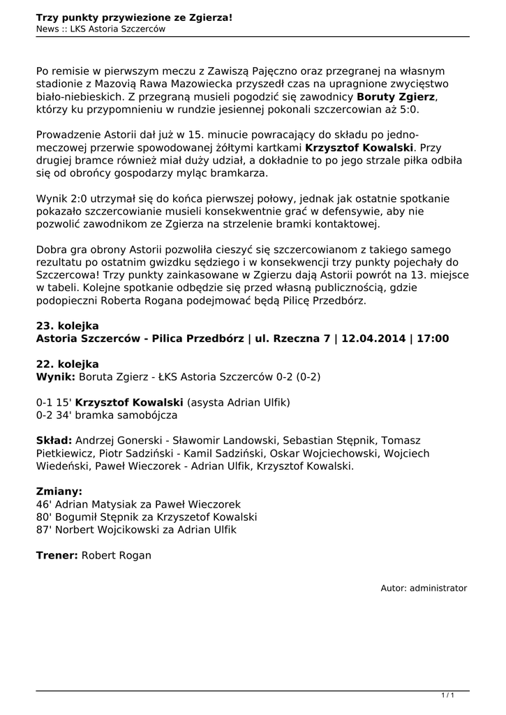 Trzy punkty przywiezione ze Zgierza! News :: LKS Astoria Szczerców Po remisie w pierwszym meczu z Zawiszą Pajęczno oraz przegranej na własnym stadionie z Mazovią Rawa Mazowiecka przyszedł czas na upragnione zwycięstwo biało-niebieskich. Z przegraną musieli pogodzić się zawodnicy Boruty Zgierz, którzy ku przypomnieniu w rundzie jesiennej pokonali szczercowian aż 5:0. Prowadzenie Astorii dał już w 15. minucie powracający do składu po jednomeczowej przerwie spowodowanej żółtymi kartkami Krzysztof Kowalski. Przy drugiej bramce również miał duży udział, a dokładnie to po jego strzale piłka odbiła się od obrońcy gospodarzy myląc bramkarza. Wynik 2:0 utrzymał się do końca pierwszej połowy, jednak jak ostatnie spotkanie pokazało szczercowianie musieli konsekwentnie grać w defensywie, aby nie pozwolić zawodnikom ze Zgierza na strzelenie bramki kontaktowej. Dobra gra obrony Astorii pozwoliła cieszyć się szczercowianom z takiego samego rezultatu po ostatnim gwizdku sędziego i w konsekwencji trzy punkty pojechały do Szczercowa! Trzy punkty zainkasowane w Zgierzu dają Astorii powrót na 13. miejsce w tabeli. Kolejne spotkanie odbędzie się przed własną publicznością, gdzie podopieczni Roberta Rogana podejmować będą Pilicę Przedbórz. 23. kolejka Astoria Szczerców - Pilica Przedbórz | ul. Rzeczna 7 | 12.04.2014 | 17:00 22. kolejka Wynik: Boruta Zgierz - ŁKS Astoria Szczerców 0-2 (0-2) 0-1 15' Krzysztof Kowalski (asysta Adrian Ulfik) 0-2 34' bramka samobójcza Skład: Andrzej Gonerski - Sławomir Landowski, Sebastian Stępnik, Tomasz Pietkiewicz, Piotr Sadziński - Kamil Sadziński, Oskar Wojciechowski, Wojciech Wiedeński, Paweł Wieczorek - Adrian Ulfik, Krzysztof Kowalski. Zmiany: 46' Adrian Matysiak za Paweł Wieczorek 80' Bogumił Stępnik za Krzyszetof Kowalski 87' Norbert Wojcikowski za Adrian Ulfik Trener: Robert Rogan Autor: administrator 1/1 Powered by TCPDF (www.tcpdf.org)