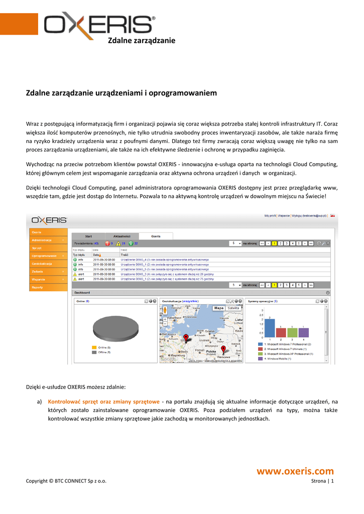 Zdalne zarządzanie Zdalne zarządzanie urządzeniami i oprogramowaniem Wraz z postępującą informatyzacją firm i organizacji pojawia się coraz większa potrzeba stałej kontroli infrastruktury IT. Coraz większa ilość komputerów przenośnych, nie tylko utrudnia swobodny proces inwentaryzacji zasobów, ale także naraża firmę na ryzyko kradzieży urządzenia wraz z poufnymi danymi. Dlatego też firmy zwracają coraz większą uwagę nie tylko na sam proces zarządzania urządzeniami, ale także na ich efektywne śledzenie i ochronę w przypadku zaginięcia. Wychodząc na przeciw potrzebom klientów powstał OXERIS - innowacyjna e-usługa oparta na technologii Cloud Computing, której głównym celem jest wspomaganie zarządzania oraz aktywna ochrona urządzeń i danych w organizacji. Dzięki technologii Cloud Computing, panel administratora oprogramowania OXERIS dostępny jest przez przeglądarkę www, wszędzie tam, gdzie jest dostąp do Internetu. Pozwala to na aktywną kontrolę urządzeń w dowolnym miejscu na Świecie! Dzięki e-usłudze OXERIS możesz zdalnie: a) Kontrolować sprzęt oraz zmiany sprzętowe - na portalu znajdują się aktualne informacje dotyczące urządzeń, na których zostało zainstalowane oprogramowanie OXERIS. Poza podziałem urządzeń na typy, można także kontrolować wszystkie zmiany sprzętowe jakie zachodzą w monitorowanych jednostkach. www.oxeris.com Copyright © BTC CONNECT Sp z o.o. Strona | 1 Zdalne zarządzanie b) Kontrolować na bieżąco stan oprogramowania – w zakładce oprogramowanie można na bieżąco monitorować stan zainstalowanego na urządzeniach oprogramowania. System pozwala także śledzić zmiany w oprogramowaniu w zakładce „Historia zmian”. c) Geolokalizować urządzenia – w zakładce geolokalizacja znajdują się wszystkie aktualne informacje dotyczące położenia monitorowanych komputerów i telefonów komórkowych. Urządzenia geolokalizowane są za pomocą GPS, GSM, IP, Wi-Fi, Bluetooth i Traceroute. d) Aktywnie chronić sprzęt i dane w przypadku zaginięcia – Po aktywowaniu trybu zaginięcia, przez przeglądarkę www, można szybko podjąć działania mające na celu odzyskanie utraconego urządzenia wraz z zawartymi na nim danymi. OXERIS umożliwia zdalne skopiowanie lub skasowanie danych z urządzenia, pobranie zdjęcia z kamery, lokalizację komputera za pomocą mapy cyfrowej a także w jego dezaktywację. e) Drukować zawsze aktualne raporty - OXERIS pozwala na wygenerowanie szczegółowych raportów, oraz ich wyeksportowanie do różnych formatów. Dzięki temu Administrator, będący w danej chwili poza siedzibą firmy, może w przeciągu kilku minut dostarczyć wymagane zestawienie drogą mailową. Z przykładowymi raportami generowanymi za pomocą OXERIS można zapoznać się na stronie www.oxeris.com w zakładce „Do pobrania”. OXERIS to e-usługa która nie tylko pozwoli zwiększyć efektywność pracy w dziale IT, ale także umożliwi ochronę urządzeń mobilnych wraz z danymi nawet w przypadku ich zaginięcia. Dzięki outsourcingowi serwerów do siedziby dostawcy usługi firma pomniejsza koszty związane z hostowaniem i utrzymaniem usługi. www.oxeris.com Copyright © BTC CONNECT Sp z o.o. Strona | 2