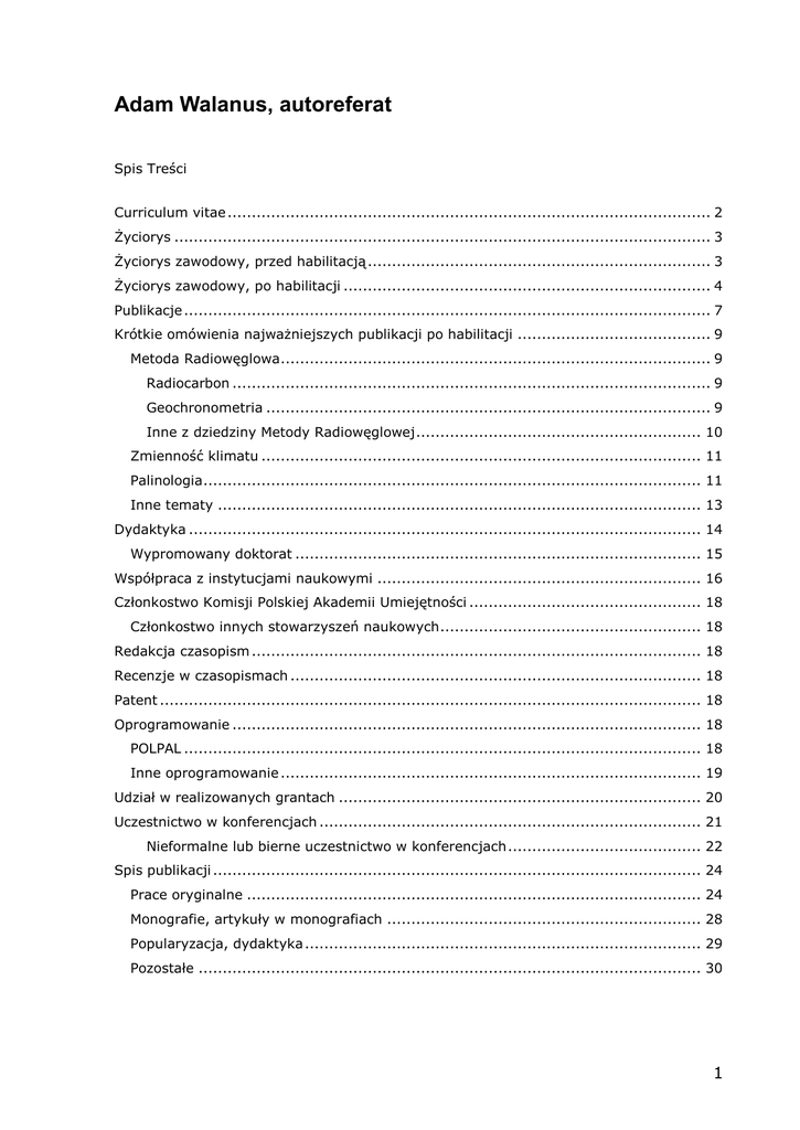 Adam Walanus, autoreferat Spis Treści Curriculum vitae .................................................................................................... 2 Życiorys ............................................................................................................... 3 Życiorys zawodowy, przed habilitacją ....................................................................... 3 Życiorys zawodowy, po habilitacji ............................................................................ 4 Publikacje ............................................................................................................. 7 Krótkie omówienia najważniejszych publikacji po habilitacji ........................................ 9 Metoda Radiowęglowa ......................................................................................... 9 Radiocarbon ................................................................................................... 9 Geochronometria ............................................................................................ 9 Inne z dziedziny Metody Radiowęglowej ........................................................... 10 Zmienność klimatu ........................................................................................... 11 Palinologia ....................................................................................................... 11 Inne tematy .................................................................................................... 13 Dydaktyka .......................................................................................................... 14 Wypromowany doktorat .................................................................................... 15 Współpraca z instytucjami naukowymi ................................................................... 16 Członkostwo Komisji Polskiej Akademii Umiejętności ................................................ 18 Członkostwo innych stowarzyszeń naukowych ...................................................... 18 Redakcja czasopism ............................................................................................. 18 Recenzje w czasopismach ..................................................................................... 18 Patent ................................................................................................................ 18 Oprogramowanie ................................................................................................. 18 POLPAL ........................................................................................................... 18 Inne oprogramowanie ....................................................................................... 19 Udział w realizowanych grantach ........................................................................... 20 Uczestnictwo w konferencjach ............................................................................... 21 Nieformalne lub bierne uczestnictwo w konferencjach ........................................ 22 Spis publikacji ..................................................................................................... 24 Prace oryginalne .............................................................................................. 24 Monografie, artykuły w monografiach ................................................................. 28 Popularyzacja, dydaktyka .................................................................................. 29 Pozostałe ........................................................................................................ 30 1 Curriculum vitae Nazwisko: Adam Walanus Data urodzenia: 6.04.1952 Stan: żonaty, dwóch synów (1978 i 1985) Wykształcenie: 1967 - Szkoła Podstawowa, Tarnowskie Góry 1971 - Liceum Ogólnokształcące, Tarnowskie Góry 1976 - Politechnika Śląska, Wydział Matematyczno-Fizyczny, Gliwice Kwalifikacje: 1976 – magisterium z fizyki technicznej, z wyróżnieniem, Rozkład prawdopodobieństwa ilorazu zliczeń mionów w liczniku proporcjonalnym, 1983 - doktorat z nauk technicznych, w Instytucie Fizyki i Techniki Jądrowej AGH, Obiektywizacja pomiaru w datowaniach metodą 14C, 2002 - habilitacja z nauk o Ziemi w zakresie geologii, specjalność: geologia podstawowa, na Wydziale Geologii Geofizyki i Ochrony Środowiska AGH, Istotność statystyczna wniosków z analiz ilościowych na przykładzie badań górnego czwartorzędu. Praca: 1976-1998 - Politechnika Śląska, Instytut Fizyki, Zakład Zastosowań Radioizotopów; asystent, od 1984 adiunkt, 1986-1989 - 1/2 etatu w Instytucie Botaniki PAN, Kraków, na stanowisku konsultanta i później starszego specjalisty, 1996 - 1/2 etatu w Junisoftex Sp. z o.o., Gliwice, analityk-projektant w zakresie oprogramowania pomiarowego i statystycznego sterowania jakością, 1990-1998 - samodzielna działalność gospodarcza, usługi komputerowe, wykonywanie oprogramowania i analiza danych, głównie dla instytucji naukowych, 1999/2000 - wykłady ze statystyki i obsługi komputera w policealnej Szkole Bankowości i Finansów w Krakowie, 1998-2002 - StatSoft Polska Sp. z o.o. Kraków, konsultant w dziale technicznym, 2003-2006 - Uniwersytet Rzeszowski, profesor nadzwyczajny, do 2004 Instytut Archeologii, następnie Instytut Techniki Wydziału Matematyczno-Przyrodniczego, 2007 - AGH, Wydział Geologii Geofizyki i Ochrony Środowiska, profesor nadzwyczajny. Dyscyplina KBN: geologia; specjalność: statystyczna analiza danych Hobby: fotografia (www.adamwalanus.pl) 2 Życiorys Urodziłem się 6 kwietnia 1952 roku w Tarnowskich Górach, gdzie w 1971 roku zdałem maturę w Liceum Ogólnokształcącym, z bardzo dobrymi ocenami z matematyki i fizyki. W okresie liceum zajmowałem się fotografią (nagroda na II Biennale Krajobrazu Polskiego) i trenowałem kajakarstwo. Studiowałem na Politechnice Śląskiej w latach 1971-1976, gdzie, po studiach podjąłem pracę w Instytuc