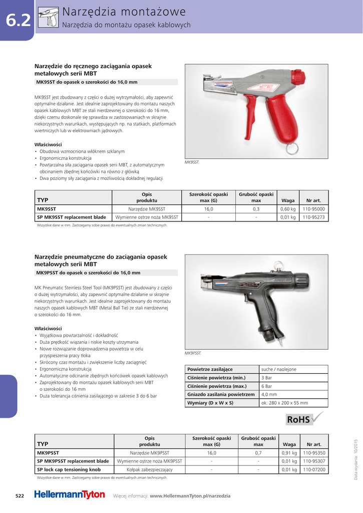 Narzędzia montażowe 6.2 Narzędzia do montażu opasek kablowych Narzędzie do ręcznego zaciągania opasek metalowych serii MBT MK9SST do opasek o szerokości do 16,0 mm MK9SST jest zbudowany z części o dużej wytrzymałości, aby zapewnić optymalne działanie. Jest idealnie zaprojektowany do montażu naszych opasek kablowych MBT ze stali nierdzewnej o szerokości do 16 mm, dzięki czemu doskonale się sprawdza w zastosowaniach w skrajnie niekorzystnych warunkach, występujących np. na statkach, platformach wiertniczych lub w elektrowniach jądrowych. Właściwości • Obudowa wzmocniona włóknem szklanym • Ergonomiczna konstrukcja • Powtarzalna siła zaciągania opasek serii MBT, z automatycznym obcinaniem zbędnej końcówki na równo z główką • Dwa poziomy siły zaciągania z możliwością dokładnej regulacji TYP MK9SST SP MK9SST replacement blade MK9SST. Opis produktu Szerokość opaski max (G) Grubość opaski max Narzędzie MK9SST 16,0 0,3 0,60 kg 110-95000 Wymienne ostrze noża MK9SST - - 0,01 kg 110-95273 Waga Nr art. Wszystkie dane w mm. Zastrzegamy sobie prawo do ewentualnych zmian technicznych. Narzędzie pneumatyczne do zaciągania opasek metalowych serii MBT MK9PSST do opasek o szerokości do 16,0 mm MK Pneumatic Steinless Steel Tool (MK9PSST) jest zbudowany z części o dużej wytrzymałości, aby zapewnić optymalne działanie w skrajnie niekorzystnych warunkach. Jest idealnie zaprojektowany do montażu naszych opasek kablowych MBT (Metal Ball Tie) ze stali nierdzewnej o szerokości do 16 mm. TYP MK9PSST SP MK9PSST replacement blade SP lock cap tensioning knob MK9PSST. Powietrze zasilające suche / naolejone Ciśnienie powietrza (min.) 3 Bar Ciśnienie powietrza (max.) 6 Bar Gniazdo zasilania powietrzem 4,0 mm Wymiary (D x W x S) ok. 280 x 200 x 55 mm Opis produktu Szerokość opaski max (G) Grubość opaski max Waga Nr art. Narzędzie MK9PSST 16,0 0,7 0,91 kg 110-95350 Wymienne ostrze noża MK9PSST - - 0,01 kg 110-95307 Kołpak zabezpieczający - - 0,01 kg 110-07200 Wszystkie dane w mm. Zastrzegamy sobie prawo do ewentualnych zmian technicznych. 522 Więcej informacji: www.HellermannTyton.pl/narzedzia Data wydania: 10/2015 Właściwości • Wyjątkowa powtarzalność i dokładność • Duża prędkość wiązania i niskie koszty utrzymania • Nowe rozwiązanie doprowadzenia powietrza w celu przyspieszenia pracy tłoka • Skrócony czas montażu i zwiększenie liczby zaciągnięć • Ergonomiczna konstrukcja • Automatyczne odcinanie zbędnych końcówek opasek kablowych • Zaprojektowany do montażu opasek kablowych serii MBT o szerokości do 16 mm • Duża tolerancja ciśnienia zasilającego w zakresie 3 do 6 bar