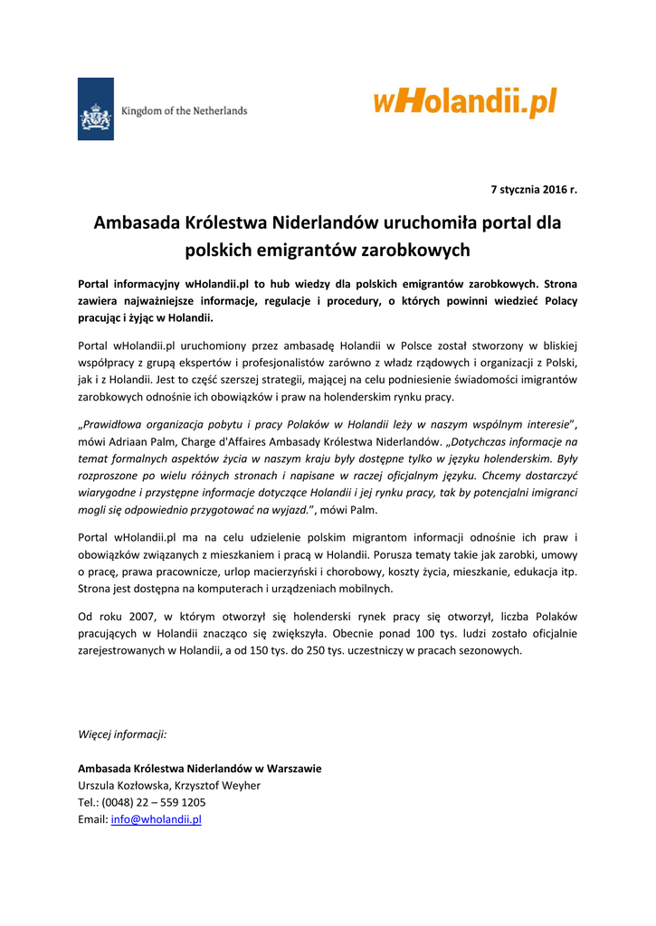 7 stycznia 2016 r. Ambasada Królestwa Niderlandów uruchomiła portal dla polskich emigrantów zarobkowych Portal informacyjny wHolandii.pl to hub wiedzy dla polskich emigrantów zarobkowych. Strona zawiera najważniejsze informacje, regulacje i procedury, o których powinni wiedzieć Polacy pracując i żyjąc w Holandii. Portal wHolandii.pl uruchomiony przez ambasadę Holandii w Polsce został stworzony w bliskiej współpracy z grupą ekspertów i profesjonalistów zarówno z władz rządowych i organizacji z Polski, jak i z Holandii. Jest to część szerszej strategii, mającej na celu podniesienie świadomości imigrantów zarobkowych odnośnie ich obowiązków i praw na holenderskim rynku pracy. „Prawidłowa organizacja pobytu i pracy Polaków w Holandii leży w naszym wspólnym interesie”, mówi Adriaan Palm, Charge d'Affaires Ambasady Królestwa Niderlandów. „Dotychczas informacje na temat formalnych aspektów życia w naszym kraju były dostępne tylko w języku holenderskim. Były rozproszone po wielu różnych stronach i napisane w raczej oficjalnym języku. Chcemy dostarczyć wiarygodne i przystępne informacje dotyczące Holandii i jej rynku pracy, tak by potencjalni imigranci mogli się odpowiednio przygotować na wyjazd.”, mówi Palm. Portal wHolandii.pl ma na celu udzielenie polskim migrantom informacji odnośnie ich praw i obowiązków związanych z mieszkaniem i pracą w Holandii. Porusza tematy takie jak zarobki, umowy o pracę, prawa pracownicze, urlop macierzyński i chorobowy, koszty życia, mieszkanie, edukacja itp. Strona jest dostępna na komputerach i urządzeniach mobilnych. Od roku 2007, w którym otworzył się holenderski rynek pracy się otworzył, liczba Polaków pracujących w Holandii znacząco się zwiększyła. Obecnie ponad 100 tys. ludzi zostało oficjalnie zarejestrowanych w Holandii, a od 150 tys. do 250 tys. uczestniczy w pracach sezonowych. Więcej informacji: Ambasada Królestwa Niderlandów w Warszawie Urszula Kozłowska, Krzysztof Weyher Tel.: (0048) 22 – 559 1205 Email: [email protected]