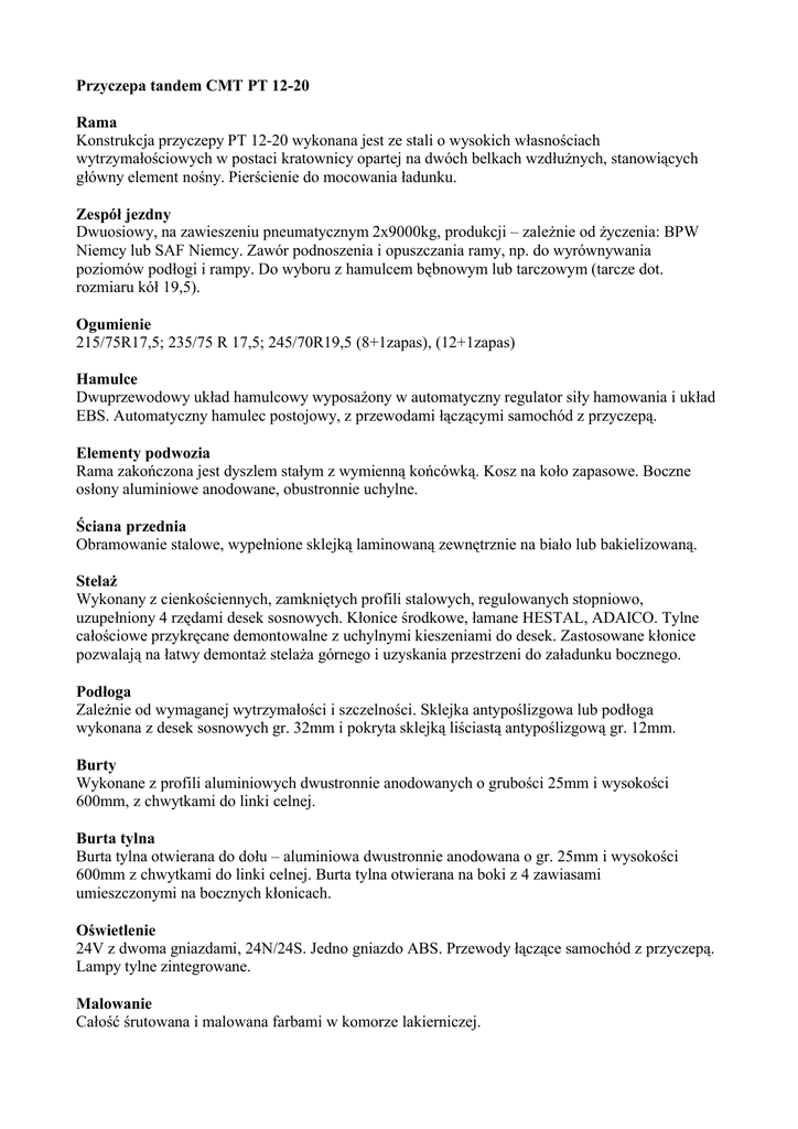 Przyczepa tandem CMT PT 12-20 Rama Konstrukcja przyczepy PT 12-20 wykonana jest ze stali o wysokich własnościach wytrzymałościowych w postaci kratownicy opartej na dwóch belkach wzdłużnych, stanowiących główny element nośny. Pierścienie do mocowania ładunku. Zespół jezdny Dwuosiowy, na zawieszeniu pneumatycznym 2x9000kg, produkcji – zależnie od życzenia: BPW Niemcy lub SAF Niemcy. Zawór podnoszenia i opuszczania ramy, np. do wyrównywania poziomów podłogi i rampy. Do wyboru z hamulcem bębnowym lub tarczowym (tarcze dot. rozmiaru kół 19,5). Ogumienie 215/75R17,5; 235/75 R 17,5; 245/70R19,5 (8+1zapas), (12+1zapas) Hamulce Dwuprzewodowy układ hamulcowy wyposażony w automatyczny regulator siły hamowania i układ EBS. Automatyczny hamulec postojowy, z przewodami łączącymi samochód z przyczepą. Elementy podwozia Rama zakończona jest dyszlem stałym z wymienną końcówką. Kosz na koło zapasowe. Boczne osłony aluminiowe anodowane, obustronnie uchylne. Ściana przednia Obramowanie stalowe, wypełnione sklejką laminowaną zewnętrznie na biało lub bakielizowaną. Stelaż Wykonany z cienkościennych, zamkniętych profili stalowych, regulowanych stopniowo, uzupełniony 4 rzędami desek sosnowych. Kłonice środkowe, łamane HESTAL, ADAICO. Tylne całościowe przykręcane demontowalne z uchylnymi kieszeniami do desek. Zastosowane kłonice pozwalają na łatwy demontaż stelaża górnego i uzyskania przestrzeni do załadunku bocznego. Podłoga Zależnie od wymaganej wytrzymałości i szczelności. Sklejka antypoślizgowa lub podłoga wykonana z desek sosnowych gr. 32mm i pokryta sklejką liściastą antypoślizgową gr. 12mm. Burty Wykonane z profili aluminiowych dwustronnie anodowanych o grubości 25mm i wysokości 600mm, z chwytkami do linki celnej. Burta tylna Burta tylna otwierana do dołu – aluminiowa dwustronnie anodowana o gr. 25mm i wysokości 600mm z chwytkami do linki celnej. Burta tylna otwierana na boki z 4 zawiasami umieszczonymi na bocznych kłonicach. Oświetlenie 24V z dwoma gniazdami, 24N/24S. Jedno gniazdo ABS. Przewody łączące samochód z przyczepą. Lampy tylne zintegrowane. Malowanie Całość śrutowana i malowana farbami w komorze lakierniczej. Plandeka Opończa wykonana jest z niekurczliwego materiału zachodnich producentów o gramaturze 660g/m2 (900g/m2-zasłonówka) o osnowie poliestrowej, pokrytego zewnętrzną warstwą PCV. Opończa wykonana techniką zgrzewania pozwala uzyskać wytrzymałą i szczelną powłokę. Wyposażenie 2 kliny do blokowania kół z mocowaniem, 2 pary ćwierćbłotników z tworzywa sztucznego, tylne standardowe z chlapaczami. Koło zapasowe. Skrzynka narzędziowa. Tablica wyróżniająca pojazd. Za dopłatą Dach rozsuwany; portal z dużymi drzwiami aluminiowymi; boczne gumowe odboje przeciw wózkom; kłonice i burty 800mm; zbiornik na wodę z tworzywa sztucznego; kozioł z zaczepem ROCKINGER lub RINGFEDER; nogi podporowe HAACON; dyszel o regulowanej długości WAP.