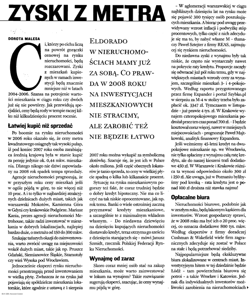 DOROTA MALESA i, którzy po cichu liczą na powrót gorączki cenowej na rynku nieruchomości, będą rozczarowani. Zyski z mieszkań kupionych w ramach inwestycji będą znacznie mniejsze niż w latach 2004-2006. Szansa na potrojenie wartości mieszkania w ciągu roku czy dwóch już się nie powtórzy. Jak przewidują specjaliści, ceny będą rosływtempie raczej kilku niż kilkudziesięciu procent rocznie. C Łatwiej kupić niż sprzedać Po boomie na rynku nieruchomości w 2006 roku okazało się, że ceny metra kwadratowego osiągnęły tak wysoki pułap, iż pod koniec 2007 roku osoba zarabiająca średnią krajową była w stanie kupić za pensję jedynie ok. 0,44 mkw. mieszkania. Dlatego nikogo nie dziwi zapowiadany na 2008 rok spadek tempa sprzedaży. Agencje nieruchomości prognozują, że w przyszłym roku ceny mieszkań jeśli w ogóle pójdą w górę, to nie więcej niż 10 proc. A i to tylko w najbardziej atrakcyjnych dzielnicach dużych miast, takich jak warszawski Mokotów, Kamienna Góra w Gdyni czy krakowskie Podgórze. Mariusz Kania, prezes agencji nieruchomości Metrohouse, także radzi inwestować w mieszkania w dobrych lokalizacjach, najlepiej bardzo duże, o metrażu od 150 do 300 mkw. Szukając tańszych okazji do zainwestowania, warto zwrócić uwagę na miejscowości wokół dużych miast, takie jak np. Pruszcz Gdański, Siemianowice Śląskie, Szamotuły czy wieś Wysoka pod Wrocławiem. Jednocześnie eksperci rynku nieruchomości przestrzegają przed inwestowaniem w wielką płytę. Zwłaszcza że na rynku już pojawiają się spółdzielcze mieszkania lokatorskie, które zgodnie z ustawą z l sierpnia ELDORADO W NIERUCHOMOŚCIACH MAMY JUŻ ZA SOBĄ. CO PRAWDA W 20O8 ROKU NA INWESTYCJACH MIESZKANIOWYCH NIE STRACIMY, ALE ZAROBIĆ TEŻ NIE BĘDZIE ŁATWO 2007 roku można wykupić za symboliczną złotówkę. Szacuje się, że jest ich w Polsce około miliona. Jeśli cześć obecnych lokatorów je tanio sprzeda, to ceny w wielkiej płycie spadną o kilka lub kilkanaście procent. Sytuację na rynku mieszkaniowym pogorsz)7 też fakt, że coraz trudniej będzie o dobry kredyt hipoteczny. Nie ma co liczyć na tak niskie oprocentowane, jak np. rok temu. Banki o wiele ostrożniej zaczną przyznawać kredyty mieszkaniowe, a szczególnie te z minimalnym wkładem własnym. - Do niedawna dziewięciu na dziesięciu kupujących nieruchomości dostawało kredyt, teraz otrzyma go sześciu z dziesięciu starających się - mówi Janusz Szmidt, rzecznik Polskiej Federacji Rynku Nieruchomości. Wynajmę od zaraz Skoro coraz mniej osób stać na zakup mieszkania, może warto zainwestować w lokum na wynajem? Takie rozwiązanie sugerują eksperci, szacując, że ceny wynajmu pójdą w górę. - W aglomeracji warszawskiej w ciągu najbliższych dziesięciu lat na rynku może się pojawić 300 tysięcy osób poszukujących mieszkania. A biorąc pod uwagę przewidywany wzrost inflacji i podwyżkę stóp procentowych, tylko cześć z nich zdecyduje się ma to, by nabyć własne M - tłumaczy Paweł Sztejter z firmy REAS, zajmującej się rynkiem nieruchomości. Do niedawna zyski z wynajmu były tak niskie, że często nie wystarczały nawet na pokrycie raty kredytu. Proporcje zaczęły się odwracać już pół roku temu, gdy w największych miastach wzrosły ceny za wynajem, szczególnie mieszkań 3- i 4-pokojowych. Według raportu przygotowanego przez firmę Expander i portal Szybko.pl w sierpniu za M-4 w stolicy trzeba było zapłacić ok. 3347 zł. Tymczasem w listopadzie - już prawie 4 tyś. zł. W Krakowie wynajem czteropokojowego mieszkania podrożał przez ten czas ponad 700 zł. -1 będzie kosztował coraz więcej, nawetwmniejszych miejscowościach - prognozuje Paweł Majtkowski, analityk finansowy Expandera. Jeśli weźmiemy 45-letni kredyt na dwupokojowe mieszkanie np. we Wrocławiu, nie tylko spłacimy z wynajmu całą ratę kredytu, ale do naszej kieszeni trafi dodatkowe 450 zł. W Warszawie i Krakowie różnica ta wynosi odpowiednio około 300 zł i 250 zł. Ale uwaga, już w Poznaniu bylibyśmy pod kreską - rata kredytu jest o ponad 100 zł droższa niż stawka najmu! Opłacalne biura Nieruchomości biurowe, podobnie jak w zeszłym roku, będą łakomym kąskiem dla inwestorów. Wzrost gospodarczy sprawi, że w 2008 roku ma być ich o 20 proc. więcej, co oznacza dodatkowe 800 tyś. mkw. Według ekspertów z firmy doradczej Cushman & Wakefield wiele firm zagranicznych zdecyduje się zostać w Polsce na stałe i będą potrzebować siedziby. Najpopularniejsze będą ekskluzywne biura zlokalizowane w centrach miast. Inwestycyjnym hitem w tej dziedzinie będzie Łódź - tam powierzchnia biurowa się potroi - a także Wrocław i Katowice. Jednak dla indywidualnych inwestorów możliwości zarobienia na nieruchomościach t biurowych ograniczają się do kupienia jednostek w funduszach zamkniętych, takich jak na przykład Arka Nieruchomości. Można też zainwestować w akcje deweloperów, którzy zajmują się budową biurowców. Grunt to inwestycja Jeszcze pół roku temu prognozowano, że ceny ziemi będą w najbliższych latach rosnąć tak szybko, jak do niedawna ceny mieszkań. Problem w tym, że niektóre miasta ten wzrost mają już za sobą. Choćby Warszawa, w której ceny najatrakcyjniejszych gruntów potroiły się. Analitycy twierdzą jednak, że wiosną grunty podrożeją jeszcze o 20 proc., a do końca roku - nawet o 40-50 proc. Najkorzystniejszy będzie zakup ziemi rolnej lub dużej działki budowlanej, którą można później podzielić na mniejsze części. W pierwszym przypadku ważne jest, by działka dała się odrolnić i przekształcić na budowlaną. Można to sprawdzić w planach zagospodarowania przestrzennego dostępnych wurzędzie gminy. - Odrolnianie trwa około roku, ale realny zysk z takiego przedsięwzięcia to 100 proc. lub więcej - dumaczy Paweł Urban, analityk Home Broker. Ceny działek budowlanych kształtują się na poziomie 300 