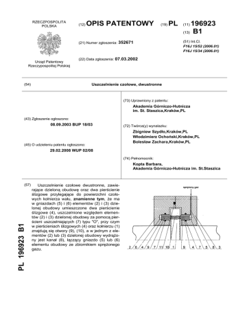 RZECZPOSPOLITA POLSKA (12) OPIS PATENTOWY (19) (21) Numer zgłoszenia: 352671 Urząd Patentowy Rzeczypospolitej Polskiej PL 196923 (13) B1 (11) (51) Int.Cl. F16J 15/52 (2006.01) F16J 15/34 (2006.01) (22) Data zgłoszenia: 07.03.2002 Uszczelnienie czołowe, dwustronne (54) (73) Uprawniony z patentu: Akademia Górniczo-Hutnicza im. St. Staszica,Kraków,PL (43) Zgłoszenie ogłoszono: 08.09.2003 BUP 18/03 (45) O udzieleniu patentu ogłoszono: (72) Twórca(y) wynalazku: Zbigniew Szydło,Kraków,PL Włodzimierz Ochoński,Kraków,PL Bolesław Zachara,Kraków,PL 29.02.2008 WUP 02/08 (74) Pełnomocnik: Kopta Barbara, Akademia Górniczo-Hutnicza im. St.Staszica PL 196923 B1 (57) Uszczelnienie czołowe dwustronne, zawierające dzieloną obudowę oraz dwa pierścienie ślizgowe przylegające do powierzchni czołowych kołnierza wału, znamienne tym, że ma w gniazdach (5) i (6) elementów (2) i (3) dzielonej obudowy umieszczone dwa pierścienie ślizgowe (4), uszczelnione względem elementów (2) i (3) dzielonej obudowy za pomocą pierścieni uszczelniających (7) typu "O", przy czym w pierścieniach ślizgowych (4) oraz kołnierzu (1) znajdują się otwory (9), (10), a w jednym z elementów (2) lub (3) dzielonej obudowy wydrążony jest kanał (8), łączący gniazdo (5) lub (6) elementu obudowy ze zbiornikiem sprężonego gazu. 2 PL 196 923 B1 Opis wynalazku Przedmiotem wynalazku jest uszczelnienie czołowe dwustronne znajdujące zastosowanie do uszczelniania elementów maszyn i urządzeń o ruchu obrotowym. Znane są czołowe uszczelnienia stosowane do uszczelniania elementów obrotowych, złożone z pierścienia ślizgowego osadzonego w ruchomej tulei obracającej się wraz z wałem i współpracującego z nim czołowo przeciwpierścienia, który jest osadzony w nieruchomej obudowie. Pierścień ślizgowy i przeciwpierścień dociśnięte są do siebie powierzchniami ślizgowymi za pomocą elementów sprężystych np. sprężyn śrubowych lub metalowych mieszków. Zadaniem tych elementów jest utrzymanie styku pierścieni ślizgowych, także przy braku ciśnienia roboczego. Z polskiego opisu patentowego nr 165 598 znane jest czołowe uszczelnienie mechaniczne obrotowych wałów, według którego w obrotowym zespole czołowego uszczelnienia kołnierzowego część przednia uszczelniająca mieszka połączona jest z ułożonym na obrotowym wale zaciskowym pierścieniem zarówno przez koszyk ze sprężynkami dociskowymi sprzężony z zaciskowym pierścieniem za pomocą kołka jak i poprzez sprzęgłową tulejkę ułożoną w cylindrycznym otworze koszyka, która z jednej strony na swej ściance posiada dwa promieniowe wypusty ułożone suwliwie poosiowo w dwóch wklęsłych promieniowo wybraniach na cylindrycznej powierzchni otworu koszyka, a z drugiej strony dwoma zagięciami swej ścianki ułożona jest w wybraniach kołnierzowej części przedniej mieszka. Przy tym na koszyk nałożona jest oporowa osłonka z podkładką pod sprężynki dociskowe, która swym wewnętrznym kołnierzem jest dociśnięta do kołnierza części przedniej mieszka i obejmuje cylindryczne obrzeże sprzęgłowej tulejki, zaś w otworach nieprzelotowych koszyka są podkładki pod każdą sprężynką dociskową. Z polskiego opisu patentowego (P 320282) znane jest ślizgowe uszczelnienie czołowe złożone z dwóch pierścieni ślizgowych z wbudowanymi w nich magnesami trwałymi. Pierścienie ślizgowe umieszczone są w wytoczeniach dzielonej obudowy uszczelnienia i przylegają wargami uszczelniającymi do płaskich powierzchni czołowych kołnierza na wale, na skutek działania siły pola magnetycznego wytworzonego przez magnesy trwałe. Uszczelnienie czołowe dwustronne, według wynalazku zawiera dwa pierścienie ślizgowe osadzone przesuwnie w gniazdach elementów dzielonej obudowy i uszczelnione względem nich za pomocą pierścieni uszczelniających typu „O". Pierścienie ślizgowe przylegają do powierzchni czołowych kołnierza na wale, przy czym w kołnierzu oraz w pierścieniach ślizgowych wykonane są otwory, zaś w jednym z elementów dzielonej obudowy wydrążony jest kanał, sprzęgający gniazdo jednego z elementów obudowy ze zbiornikiem sprężonego gazu. Zaletą uszczelnienia według wynalazku jest prosta budowa oraz możliwość regulowania docisku pierścieni ślizgowych do czołowych powierzchni kołnierza na wale, w zależności od ciśnienia czynnika uszczelnianego, a także możliwość uszczelniania dwóch różnych czynników roboczych o różnych ciśnieniach. Uszczelnienie według wynalazku uwidocznione jest w przykładzie wykonania na rysunku, który przedstawia uszczelnienie w przekroju osiowym. Kołnierz 1 wału obrotowego umieszczony jest w zamkniętej przestrzeni utworzonej przez wybrania wykonane w elementach 2 i 3 dzielonej obudowy uszczelnienia. Po obu stronach kołnierza 1, umieszczone są pierścienie ślizgowe 4, których powierzchnie ślizgowe przylegają do płaskich powierzchni czołowych kołnierza 1. Pierścienie ślizgowe 4, osadzone są przesuwnie w gniazdach 5 i 6, wykonanych w elementach 2 i 3 obudowy i uszczelnione względem nich za pomocą pierścieni uszczelniających 7 typu „O". W elemencie 3 wykonany jest kanał 8, który służy do doprowadzenia sprężonego gazu do gniazda 5, a następnie przez otwory 9, wykonane w pierścieniach ślizgowych 4 i otwór 10 wykonany w kołnierzu 1 do doprowadzenia sprężonego gazu do gniazda 6. Elementy 2 i 3 dzielonej obudowy są uszczelnione pierścieniem uszczelniającym 11 typu "O". W warunkach eksploatacji pierścienie ślizgowe 4 przylegają swymi powierzchniami ślizgowymi do płaskich powierzchni czołowych kołnierza 1, przy czym siła docisku pierścieni ślizgowych 4 regulowana jest ciśnieniem gazu doprowadzanego z zewnątrz poprzez kanał 8 wykonany w elemencie (3) obudowy uszczelnienia oraz otwory 9 w pierścieniach ślizgowych 4 i kołnierzu do gniazd 5 i 6 w elementach 2 i 3 obudowy uszczelnienia w zależności od 