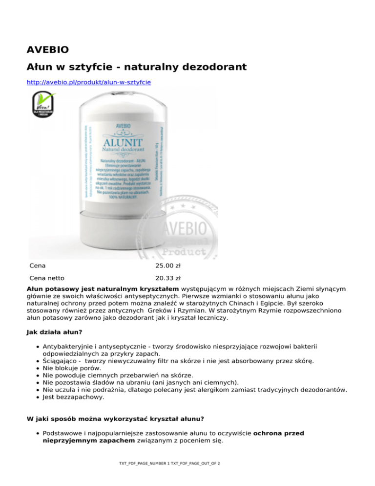AVEBIO Ałun w sztyfcie - naturalny dezodorant http://avebio.pl/produkt/alun-w-sztyfcie Cena 25.00 zł Cena netto 20.33 zł Ałun potasowy jest naturalnym kryształem występującym w różnych miejscach Ziemi słynącym głównie ze swoich właściwości antyseptycznych. Pierwsze wzmianki o stosowaniu ałunu jako naturalnej ochrony przed potem można znaleźć w starożytnych Chinach i Egipcie. Był szeroko stosowany również przez antycznych Greków i Rzymian. W starożytnym Rzymie rozpowszechniono ałun potasowy zarówno jako dezodorant jak i kryształ leczniczy. Jak działa ałun? Antybakteryjnie i antyseptycznie - tworzy środowisko niesprzyjające rozwojowi bakterii odpowiedzialnych za przykry zapach. Ściągająco - tworzy niewyczuwalny filtr na skórze i nie jest absorbowany przez skórę. Nie blokuje porów. Nie powoduje ciemnych przebarwień na skórze. Nie pozostawia śladów na ubraniu (ani jasnych ani ciemnych). Nie uczula i nie podrażnia, dlatego polecany jest alergikom zamiast tradycyjnych dezodorantów. Jest bezzapachowy. W jaki sposób można wykorzystać kryształ ałunu? Podstawowe i najpopularniejsze zastosowanie ałunu to oczywiście ochrona przed nieprzyjemnym zapachem związanym z poceniem się. TXT_PDF_PAGE_NUMBER 1 TXT_PDF_PAGE_OUT_OF 2 Można go również użyć w przypadku drobnych skaleczeń i zacięć przy goleniu. Tamuje krwawienie i przyśpiesza gojenie. Łagodzi podrażnienia skóry, dlatego polecany jest po depilacji lub goleniu, przy wrastajacych paznokciach, przy ukąszeniach owadów i przy opryszczce wargowej. Działa kojąco na poparzenia słoneczne. Wspomaga gojenie i zabliźnianie wyprysków. W jaki sposób używać ałun? Używanie ałunu jest bardzo proste i wygodne. Końcówkę kryształu zwilżamy letnią wodą i przecieramy kilkukrotnie wybrane miejsca (pachy, stopy, miejsca po depilacji, drobne zacięcia). Jak działa ałun i czy jest skuteczny? Trzeba pamiętać o tym, że ałun nie zablokuje porów i co za tym idzie nie spowoduje, że skóra będzie sucha. Pocenie się jest naturalnym procesem i ałun tego absolutnie nie zaburza. Środowisko wytworzone przez ałun spowoduje jednak, że niezależnie od intensywności pocenia się nie powstanie nieprzyjemny zapach. Użycie ałunu zabezpiecza nas przed nieprzyjemnym zapachem praktycznie na cały dzień. Jakiej wielkości jest kryształ ałunu? Oferujemy kryształ ałunu o wadze 60 gram. Jaka jest wydajność kryształu? Jest skuteczny i bardzo wydajny, gdyż starcza średnio na około rok stosowania (przy codziennym używaniu). Czy ałun jest w opakowaniu? Tak. Kryształ jest w plastikowym opakowaniu z zakrętką. Dzięki temu ma ochronę przed stłuczeniem. Jest łatwy w przechowywaniu. Jaki jest skład ałunu? Składniki: Potassium Alum. Nie zawiera parabenów, alkoholu, zapachów, barwników i konserwantów. Czy ałun ma termin przydatności? Tak. Jest to 12 miesięcy od pierwszego użycia. W praktyce jednak trudno mówić o "zepsuciu się" kryształu. TXT_PDF_PAGE_NUMBER 2 TXT_PDF_PAGE_OUT_OF 2