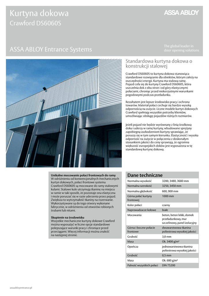 Kurtyna dokowa Crawford DS6060S The global leader in door opening solutions ASSA ABLOY Entrance Systems Standardowa kurtyna dokowa o konstrukcji stalowej Crawford DS6060S to kurtyna dokowa stanowiąca standardowe rozwiązanie dla obiektów, którym zależy na oszczędności energii. Kurtyna ma stalową ramę. Pojazd cofa się do kurtyny Crawford DS6060S, która uszczelnia dok z obu stron i od góry elastycznymi połaciami, chroniąc przed niekorzystnymi warunkami pogodowymi podczas przeładunku. Rezultatem jest lepsze środowisko pracy i ochrona towarów. Materiał połaci cechuje się bardzo wysoką odpornością na zużycie. Liczne modele kurtyn dokowych Crawford spełniają wszystkie potrzeby klientów, umożliwiając obsługę pojazdów różnych rozmiarów. Jeżeli pojazd nie będzie wyrównany z linią środkową doku i uderzy w ramę kurtyny, wbudowane sprężyny zapobiegną uszkodzeniom kurtyny sprawiając, że poruszy się w tym samym kierunku. Elastyczność i wysoka odporność na zużycie w połączeniu z doskonałym stosunkiem jakości do ceny sprawiają, że ogromna większość europejskich doków jest wyposażona w tę standardową kurtynę dokową. Unikalne mocowanie połaci frontowych do ramy W odróżnieniu od konwencjonalnych mechanicznych kurtyn dokowych, połaci frontowe systemu Crawford DS6060S są mocowane do ramy stalowymi kulami. Stalowe kule utrzymują tkaninę na miejscu w ramie w taki sposób, że pozostaje ona elastyczna i może poruszać się w razie uderzenia przez pojazd. Zwiększa to wytrzymałość tkaniny na rozerwanie. Wykorzystywane są do tego otwory wykonane fabrycznie, w odróżnieniu od otworów robionych śrubami lub nitami. Skupienie na środowisku Wszystkie mechaniczne kurtyny dokowe Crawford można wyposażyć w liczne opcje standardowe polepszające warunki pracy i chroniące przed przeciągami. Więcej informacji można znaleźć na następnej stronie. assaabloyentrance.pl Dane techniczne Normalna wysokość 3280, 3480, 3680 mm Normalna szerokość 3250, 3450 mm Normalna głębokość 600, 900 mm Górna połać kurtyny frontowej 1000 mm Kolor połaci czarny Naprowadzacze kołowe białe Mocowania beton, beton lekki, domek przeładunkowy, mur szczelinowy, panel izolacyjny Górna i boczne połacie frontowe dwuwarstwowa tkanina poliestrowa wysokiej jakości Grubość 3,0 mm Masa Ok. 3400 g/m² Opończa jednowarstwowa tkanina poliestrowa wysokiej jakości Grubość 0,5 mm Masa Ok. 680 g/m² Palność wszystkich połaci DIN 75200 Wymiary OP NH Skrót Wymiar Wartość (mm) NW Szerokość nominalna 3250, 3450 NH Wysokość nominalna 3280, 3480, 3680 OP Długość górnej połaci frontowej 1000, 1200, 1500 MH RH NB SP SP Szerokość bocznej połaci frontowej 600, 700 MH Wysokość montażu 4500 (zalecana) NT Głębokość nominalna 600, 900 RH Wysokość rampy NT A – Rynna deszczowa W środkową część dachu wbudowana jest unikalna rynna. • Kontrolowane odwadnianie dachu • Woda odprowadzana jest na lewo i na prawo, z dala od miejsca przeładunku B – Dzielona połać górna frontowa 4 nacięcia z podwójnymi, zachodzącymi na siebie warstwami materiału PCW w miejscu najbardziej narażonym na zużycie. • Dokładne uszczelnienie dzięki elastycznym osłonom tylnych górnych rogów zaparkowanego pojazdu • Mniej przeciągów w budynku E – Uszczelnienia narożne Trójkątne lub walcowe uszczelnienia z materiału PCW w dolnych narożnikach kurtyny dokowej. • Redukcja przeciągów od dołu podczas przeładunku F – Wycięcia po obu stronach Prostokątny fragment dolnego rogu przedniej połaci frontowej jest fabrycznie wycinany. • Zapobiega uszkodzeniom przedniej połaci w wyniku uderzeń pojazdu o odbój • Zaleca się w połączeniu z odbojami o głębokości min. 140 mm, np. RB, EBH, EBF lub stalowym odbojem sprężynowym Dane techniczne mogą ulec zmianie bez uprzedniego powiadomienia. C – Cyfry na górnej połaci kurtyny Litery lub cyfry o wysokości 300 mm, wydrukowane pośrodku górnej połaci kurtyny. • Indywidualne oznaczenie doków przeładunkowych D – Klapy ze wzmocnionej gumy Solidne gumowe klapy, umieszczone w lewym i prawym dolnym rogu, za połacią frontową. • Większy nacisk na karoserię zaparkowanego pojazdu gwarantuje lepsze uszczelnienie • Większa stabilność całej kurtyny przy silnym wietrze • Mniej przeciągów w budynku Mocowania Mur szczelinowy Ściana betonowa Ściana izolowana 1 Wkręt samogwintujący 2 Profil montażowy bramy 80 x 40 x 2 3 Blacha grubości 3 mm 4 Połać dachowa 5 Profil z tłoczonego aluminium – rama tylna 6 Śruba rozporowa 7 Rama montażowa kurtyny dokowej, 120 x 40 x 15 x 3 8 Śruba z nakrętką, podkładką i tuleją dystansową Cena montażowa nie obejmuje części 2, 3, 7 ASSA ABLOY, Besam, Crawford, Megadoor i Albany, jako słowa i logotypy, to przykłady znaków towarowych, będących własnością ASSA ABLOY Entrance Systems lub firm należących do ASSA ABLOY Group. assaabloyentrance.pl © ASSA ABLOY Entrance Systems AB Standardowe opcje polepszające warunki pracy i chroniące przed przeciągami. Q2.0-2014 Opis dostępnych opcji