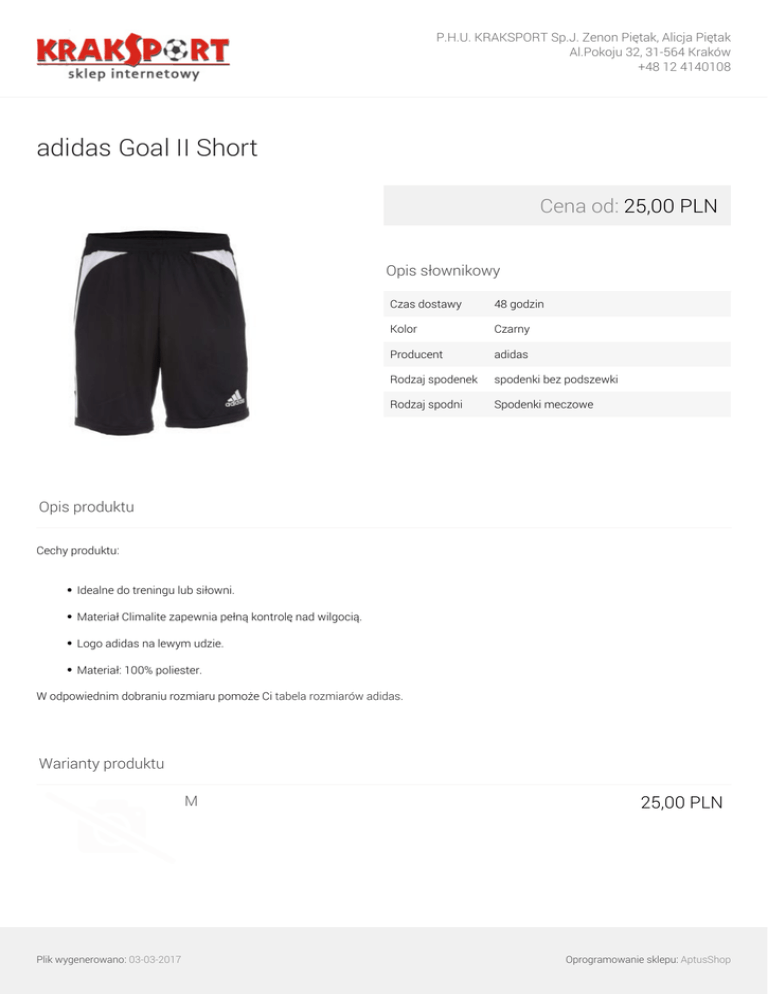 P.H.U. KRAKSPORT Sp.J. Zenon Piętak, Alicja Piętak Al.Pokoju 32, 31-564 Kraków +48 12 4140108 adidas Goal II Short Cena od: 25,00 PLN Opis słownikowy Czas dostawy 48 godzin Kolor Czarny Producent adidas Rodzaj spodenek spodenki bez podszewki Rodzaj spodni Spodenki meczowe Opis produktu Cechy produktu: Idealne do treningu lub siłowni. Materiał Climalite zapewnia pełną kontrolę nad wilgocią. Logo adidas na lewym udzie. Materiał: 100% poliester. W odpowiednim dobraniu rozmiaru pomoże Ci tabela rozmiarów adidas. Warianty produktu M Plik wygenerowano: 03-03-2017 25,00 PLN Oprogramowanie sklepu: AptusShop P.H.U. KRAKSPORT Sp.J. Zenon Piętak, Alicja Piętak Al.Pokoju 32, 31-564 Kraków +48 12 4140108 Galeria Plik wygenerowano: 03-03-2017 Powered by TCPDF (www.tcpdf.org) Oprogramowanie sklepu: AptusShop