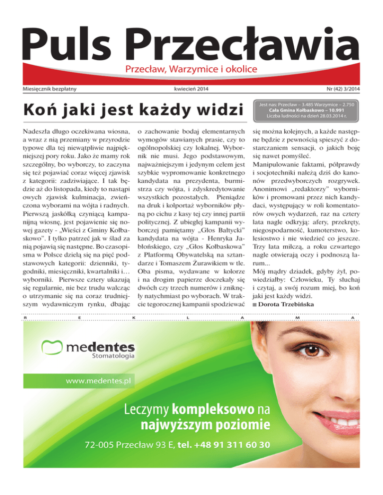 Puls Przecławia Przecław, Warzymice i okolice Miesięcznik bezpłatny kwiecień 2014 Nr (42) 3/2014 Koń jaki jest każdy widzi Nadeszła długo oczekiwana wiosna, a wraz z nią przemiany w przyrodzie typowe dla tej niewątpliwie najpiękniejszej pory roku. Jako że mamy rok szczególny, bo wyborczy, to zaczyna się też pojawiać coraz więcej zjawisk z kategorii: zadziwiające. I tak będzie aż do listopada, kiedy to nastąpi owych zjawisk kulminacja, zwieńczona wyborami na wójta i radnych. Pierwszą jaskółką czyniącą kampanijną wiosnę, jest pojawienie się nowej gazety - „Wieści z Gminy Kołbaskowo”. I tylko patrzeć jak w ślad za nią pojawią się następne. Bo czasopisma w Polsce dzielą się na pięć podstawowych kategorii: dzienniki, tygodniki, miesięczniki, kwartalniki i… wyborniki. Pierwsze cztery ukazują się regularnie, nie bez trudu walcząc o utrzymanie się na coraz trudniejszym wydawniczym rynku, dbając R E o zachowanie bodaj elementarnych wymogów stawianych prasie, czy to ogólnopolskiej czy lokalnej. Wybornik nie musi. Jego podstawowym, najważniejszym i jedynym celem jest szybkie wypromowanie konkretnego kandydata na prezydenta, burmistrza czy wójta, i zdyskredytowanie wszystkich pozostałych. Pieniądze na druk i kolportaż wyborników płyną po cichu z kasy tej czy innej partii politycznej. Z ubiegłej kampanii wyborczej pamiętamy „Głos Bałtycki” kandydata na wójta - Henryka Jabłońskiego, czy „Głos Kołbaskowa” z Platformą Obywatelską na sztandarze i Tomaszem Żurawikiem w tle. Oba pisma, wydawane w kolorze i na drogim papierze doczekały się dwóch czy trzech numerów i zniknęły natychmiast po wyborach. W trakcie tegorocznej kampanii spodziewać K L A Jest nas: Przecław – 3.485 Warzymice – 2.750 Cała Gmina Kołbaskowo – 10.991 Liczba ludności na dzień 28.03.2014 r. się można kolejnych, a każde następne będzie z pewnością spieszyć z dostarczaniem sensacji, o jakich boję się nawet pomyśleć. Manipulowanie faktami, półprawdy i socjotechniki należą dziś do kanonów przedwyborczych rozgrywek. Anonimowi „redaktorzy” wyborników i promowani przez nich kandydaci, występujący w roli komentatorów owych wydarzeń, raz na cztery lata nagle odkryją: afery, przekręty, niegospodarność, kumoterstwo, kolesiostwo i nie wiedzieć co jeszcze. Trzy lata milczą, a roku czwartego nagle otwierają oczy i podnoszą larum... Mój mądry dziadek, gdyby żył, powiedziałby: Człowieku, Ty słuchaj i czytaj, a swój rozum miej, bo koń jaki jest każdy widzi. Dorota Trzebińska M A Nr (42) 3/2014 kwiecień 2014 strona 3 Wielki Tydzień w Przecławiu Wielkanoc jest świętem ruchomym. Może wypadać pomiędzy 22 marca a 25 kwietnia. W tym roku świętować ją będziemy 20 kwietnia. WIELKANOC to najstarsze i najważniejsze święto chrześcijan. Upamiętnia ono zmartwychwstanie Jezusa Chrystusa. Tydzień poprzedzający wielkanocną niedzielę, nazywany Wielkim Tygodniem, to czas wspominania najważniejszych dla wiary chrześcijańskiej wydarzeń, a więc Mękę i Śmierć Chrystusa. Wielki Tydzień otwiera Niedziela Palmowa. Nazwa tego dnia pochodzi od wprowadzonego w XI w. zwyczaju święcenia palm - liturgia bowiem wspomina uroczysty wjazd Jezusa na osiołku do Jerozolimy, bezpośrednio poprzedzający Jego Mękę i Śmierć na Krzyżu. Palmy święci się na pamiątkę składania gałązek palmowych przed wjeżdżającym do Świętego Miasta Mesjaszem. Poniedziałek, wtorek i środa Wielkiego Tygodnia to dni poświęcone sakramentowi pojednania. Nie wyróżniają się niczym, jeśli chodzi o liturgię. Niegdyś w Wielką Środę kapłani w kościołach odprawiali „Jutrznię”. Dzisiaj uroczyste Jutrznie odprawia się w Wielki Czwartek, Piątek i Sobotę, szczególnie w katedrach. W Wielki Czwartek rozpoczyna się Święte Triduum Paschalne Męki i Zmartwychwstania Pańskiego. Obejmuje ono liturgię Mszy Wieczerzy Pańskiej, sprawowaną wieczorem w Wielki Czwartek, wielkopiątkową Liturgię Męki Pańskiej, (jest to jedyny dzień w roku, gdy w Kościele nie sprawuje się Eucharystii) oraz najbardziej uroczystą i najpiękniejszą ze wszystkich liturgii Kościoła – Wigilię Paschalną sprawowaną po zapadnięciu zmroku w Wielką Sobotę. Triduum kończy się procesją rezurekcyjną kończącą Liturgię Wielkiej Soboty. W niektórych kościołach w Polsce, pozostała jeszcze tradycja odprawiania procesji o świcie w Niedzielę Zmartwychwstania. Rezurekcja rozpoczyna świętowanie Niedzieli Zmartwychwstania, Wielkanocy. Wielki Tydzień w kościele w Przecławiu 13 kwietnia – NIEDZIELA PALMOWA MĘKI PAŃSKIEJ, WIELKI PONIEDZIAŁEK, WIELKI WTOREK, WIELKA ŚRODA (kolor szat, jak w całym Wielkim Poście, fioletowy - podkreślający pokutny charakter liturgii tego okresu) Msze św. o godz. 18.00 Spowiedź: od godz. 17.30 17 kwietnia – WIELKI CZWARTEK (kolor szat biały - na znak uroczystej proklamacji Sakramentów Kapłaństwa i Eucharystii. Jest to święto wszystkich kapłanów) MSZA WIECZERZY PAŃSKIEJ o godz. 19.00 Salon Nissan i KIA jeszcze w tym roku W Ustowie, w okolicach hotelu „Silver” rozpoczyna się budowa dwóch salonów samochodowych. Inwestorem jest „Polmotor”, a wykonawcą robót - firma „Probud” ze Szczecina. Obok istniejących już w tej okolicy sześciu salonów samochodowych - otworzą się kolejne dwa. I to jeszcze w tym roku. Inwestycja obejmuje budowę salonów KIA I Nissana - mówi Jan Przepłata z firmy Polmotor. Bedzie tam także serwis samochodwy, blacharnia, lakiernia oraz stacja diagnostyczna. Powierzchnia całkowita obiektu to dokładnie 2089 m.kw. Przewidujemy termin zakończenia budowy 30 listopada. Nowy salon firmy Polmotor to nowocześnie zaprojektowany obiekt posadowiony na działce o powierzchni 6000 m.kw. Bryła zbudowana jest głównie ze stali i szkła. Budynek będzie stał w górnej części działki. Inwestor pod koniec 2012 roku kupił od gminy Kołbas