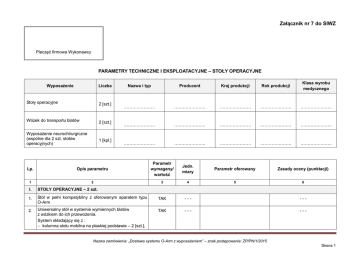 Załącznik nr 7 do SIWZ Pieczęć firmowa Wykonawcy PARAMETRY TECHNICZNE I EKSPLOATACYJNE – STOŁY OPERACYJNE Liczba Nazwa i typ Producent Kraj produkcji Rok produkcji Klasa wyrobu medycznego Stoły operacyjne 2 [szt.] …………………. …………………. …………………. …………………. …………………. Wózek do transportu blatów 2 [szt.] …………………. …………………. …………………. …………………. …………………. 1 [kpl.] …………………. …………………. …………………. …………………. …………………. Wyposażenie Wyposażenie neurochirurgiczne (wspólne dla 2 szt. stołów operacyjnych) Lp. Opis parametru Parametr wymagany/ wartość Jedn. miary Parametr oferowany Zasady oceny (punktacji) 1 2 3 4 5 6 I. STOŁY OPERACYJNE – 2 szt. 1. Stół w pełni kompatybilny z oferowanym aparatem typu O-Arm TAK --- --- 2. Uniwersalny stół w systemie wymiennych blatów z wózkiem do ich przewożenia. System składający się z : kolumna stołu mobilna na płaskiej podstawie – 2 [szt.], TAK --- --- Nazwa zamówienia: „Dostawa systemu O-Arm z wyposażeniem” – znak postępowania: ZP/PN/1/2015 Strona 1 blat jednosegmentowy pływający wykonany z włókna węglowego – 1 [szt.], blat neurochirurgiczny 5 segmentowy – 1 [szt.], wózek do blatów – 2 [szt.]. UWAGA: stół wyposażony w dźwiękowy system informacyjny wykonywanej czynności zmiany blatu. 3. Podstawa stołu płaska max. wysokość 25 [mm] w kształcie prostokąta pozwalającym na dobry dostęp do pacjenta bez jakichkolwiek dźwigni i elementów wystających, wyposażona w uszczelkę pod podstawą. TAK --- --- 4. Stół operacyjny z blatem min. 5 segmentowym: podgłówek, płyta plecowa górna, płyta plecowa dolna, płyta siedzeniowa, podnóżek dwuczęściowy. TAK --- --- 5. Napęd stołu w pełni elektromechaniczny. TAK --- --- 6. Blat przezierny dla promieniowania RTG na całej długości stołu, bez metalowych szyn poprzecznych TAK --- --- 7. Zasilanie akumulatorowe stołu, ładowarka wewnętrzna. TAK --- --- 8. Wymiary kolumny: 30 [cm] x 35 [cm] UWAGA: dopuszczalne odchylenie każdego z wymiarów +/- 3 [cm]. TAK [cm] --- 9. Kolumna stołu wyposażona w panel sterowania z wyborem i podświetleniem orientacji ułożenia pacjenta TAK --- --- 10. Stół wyposażony w pilota bezprzewodowego (pilot aktywowany poprzez ruch pilotem, a nie przyciskiem) TAK --- --- 11. Możliwość obsługi stołu z panelu sterującego umieszczonego na kolumnie stołu i pilota bezprzewodowego. Kolumna wyposażona w panel do awaryjnego sterowania stołem zlokalizowanym na bocznej (lewej lub prawej w stosunku do osi głównej stołu) powierzchni kolumny stołu. W celu aktywowania danej funkcji z panelu wymagana konieczność naciśnięcia dwóch przycisków jednocześnie dla uniknięcia przypadkowej aktywacji panelu. TAK --- --- 12. Podstawa i rama blatu stołu wykonane w całości ze stali nierdzewnej (ewentualnie z wyłączeniem elementów TAK --- --- Nazwa zamówienia: „Dostawa systemu O-Arm z wyposażeniem” – znak postępowania: ZP/PN/1/2015 Strona 2 przegubów osłoniętych tworzywem sztucznym) 13. Materac – bezszwowy, zdejmowany, przeciwodleżynowy, o grubości min. 5 [cm] 14. TAK --- --- Najniższe położenie kolumny bez blatu TAK =< 55 [cm] wartość wymagana – 1 pkt., niższa niż wymagana – 2 pkt. 15. Najwyższe położenie kolumny bez blatu TAK >= 102 [cm] wartość wymagana – 1 pkt., wyższa niż wymagana – 2 pkt. 16. Obsługa funkcji stołu za pomocą pilota bezprzewodowego przez układ elektromechaniczny: regulacja wysokości, przechyły boczne, Trendelennburga / Antytrendelennburga, pozycja flex/reflex, płyta nożna, płyta plecowa dolna, pozycja standardowa „0”, przesuw wzdłużny blatu, wyłączenie. TAK --- 17. Najniższe położenie kolumny z blatem jednosegmentowym pływającym z włókna węglowego TAK =< 78 [cm] wartość wymagana – 1 pkt., niższa niż wymagana – 2 pkt. 18. Najwyższe położenie kolumny z blatem jednosegmentowym pływającym TAK >= 120 [cm] wartość wymagana – 1 pkt., wyższa niż wymagana – 2 pkt. 19. Najniższe położenie kolumny z blatem 5-segmentowym TAK =< 65 [cm] wartość wymagana – 1 pkt., niższa niż wymagana – 2 pkt. 20. Najwyższe położenie kolumny z blatem 5-segmentowym TAK >= 110 [cm] wartość wymagana – 1 pkt., wyższa niż wymagana – 2 pkt. 21. Stół operacyjny wyposażony w funkcję reset realizowaną poprzez wciśnięcie zabezpieczonego osłoną przycisku umieszczonego na kolumnie stołu, na prawo od panelu sterowania. TAK --- 22. Regulacja segmentu nożnego góra/dół w minimalnym zakresie: + 90 [º] / - 90 [º] – realizowana TAK [º] --- --- zakres wymagany – 1 pkt., wyższy niż wymagany – 2 pkt. Nazwa zamówienia: „Dostawa systemu O-Arm z wyposażeniem” – znak postępowania: ZP/PN/1/2015 Strona 3 elektromechanicznie. Możliwość ustawienia stołu w konfiguracji realizowania zakresu ruchów podnóżkami manualnie w takim samym zakresie jak elektromechanicznie. Możliwość jednoczesnej i oddzielnej ruchomości podnóżków. 23. Przechyły boczne regulowane elektromechanicznie TAK min. 23 [º] zakres wymagany – 1 pkt., wyższy niż wymagany – 2 pkt. 24. Przechyły Trendelenburga regulowane elektromechanicznie TAK min. 40 [º] zakres wymagany – 1 pkt., wyższy niż wymagany – 2 pkt. 25. Przechyły Antytrendelenburga regulowane elektromechanicznie TAK min. 40 [º] zakres wymagany – 1 pkt., wyższy niż wymagany – 2 pkt. 26. Przesuw wzdłużny blatu regulowany elektromechanicznie TAK min. 35 [cm] zakres wymagany – 1 pkt., wyższy niż wymagany – 2 pkt. 27. Podgłówek regulowany TAK zakres min.: + 45 /- 45 [º] zakres wymagany – 1 pkt., wyższy niż wymagany – 2 pkt. 28. Podnóżek regulowany elektromechanicznie TAK zakres min.: + 90 /- 90 [º] zakres wymagany – 1 pkt., wyższy niż wymagany – 2 pkt. 29. Regu