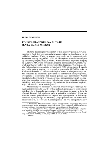 IRINA NIKULINA POLSKA DIASPORA NA AŁTAJU (LATA 60. XIX WIEKU) Historia poszczególnych diaspor, w tym diaspory polskiej, w wielonarodowej Rosji jest bez wątpienia tematem ciekawym i zasługującym na dokładne zbadanie. W dużym stopniu przyczyniło się do tego nawiązanie kontaktów między rosyjskimi i polskimi historykami w ramach współpracy kulturalnej między Rosją a Polską. Warto zauważyć, że polską diasporę na Syberii w XIX wieku wyróżniała znaczna liczba zesłańców, którzy wywarli pozytywny wpływ na prawie wszystkie dziedziny syberyjskiego życia. Polską diasporę na Ałtaju1 w latach 60. XIX wieku stanowili przede wszystkim polscy zesłańcy – uczestnicy powstania 1863-1864 roku w Królestwie Polskim. O nich właśnie będzie mowa w niniejszym artykule. Jak wiadomo po stłumieniu powstania car zatwierdził zasady wywózki, wysiedlania i oddawania pod nadzór policji jego uczestników. Wśród miast Zachodniej Syberii, wyznaczonych do zamieszkania w nich osób zesłanych z powodów politycznych, były również miasta Ałtajskiego Okręgu Górskiego, oficjalnie zamkniętego dla zesłańców jako własność rządowa, Bijsk, Kuznieck i Ust`-Kamienogorsk.2 Odnaleziony w zasobach Archiwum Państwowego Federacji Rosyjskiej (skrót rosyjski GARF) wykaz polskich przestępców politycznych osiedlonych w Barnaule, zawierający 54 nazwiska, świadczy o tym, że również Barnauł był miejscem pobytu polskich zesłańców.3 Część zesłańców została przydzielona w stopniu szeregowego do 10. liniowego batalionu syberyjskiego w Barnaule, „część przeniesiona do batalionów liniowych nr 12 i 14 w Ust`-Kamienogorsku i nr 7 w Semipałatyńsku”.4 1 Pod nazwą Ałtaj rozumiemy Ałtajski Okręg Górski, obejmujący terytorium współczesnego Kraju Ałtajskiego, Republiki Ałtaj, części obwodów nowosybirskiego, kiemierowskiego, omskiego i tomskiego oraz wschodnią część Kazachstanu. 2 G.S. Sapargalijew, W.A. Djakow, Obszczestwienno-politiczeskaja diejatielnost` ssylnych polakow w doriewolucionnom Kazachstanie, Ałma-Ata 1971, s. 16. 3 Archiwum Państwowe Federacji Rosyjskiej (Gosudarstwiennyj archiw Rossijskoj Fiedieracii – GARF), f. 109, eksp. 1864, d. 171, l. 80-82. 4 Ibidem. IRINA NIKULINA 4 Niestety nie ma szczegółowych informacji o życiu tych ludzi na Ałtaju. Z pewnością stawali przed problemem adaptacji do nowych warunków życia, do odmiennego środowiska socjokulturowego, co jest procesem dość skomplikowanym i długotrwałym. Wiadomo, że wszyscy byli objęci nadzorem policji. Jednak w raporcie naczelnika Ałtajskich Zakładów Górniczych z 21 września 1864 roku jest mowa o trudnościach w zorganizowaniu nadzoru i o tym, że „ludzi takiej kategorii do bieżącego roku nigdy do Barnaułu nie przysyłano i chociaż znajdują się pod nadzorem policji, to liczba policjantów w Barnaule jest tak mała, że nie ma żadnej możliwości dokładnego śledzenia sposobu życia tych ludzi”.5 Pewną informację o Polakach zesłanych na Ałtaj daje krótki szkic historyczny B. Gierasimowa. Na przykład wywodzący się ze szlachty Mikołaj Ignatiewicz Borowski za aktywny udział w oddziale powstańców został oddany pod sąd wojskowy, decyzją dowódcy wojsk okręgu wileńskiego pozbawiony wszystkich praw i przywilejów i zesłany na osiedlenie do guberni tomskiej. Początkowo przebywał w Barnaule, potem przeniesiono go do Ust`-Kamienogorska pod ścisły nadzór policyjny. Na zesłaniu Borowski otrzymywał zasiłek ze skarbu państwa: czasem wypłacano mu „diety” w wysokości 6 kopiejek, a czasem – 15 kopiejek. Na mocy manifestu z 16 kwietnia 1866 roku otrzymał prawo wyjazdu do europejskiej części Rosji i za zgodą generał-gubernatora Zachodniej Syberii wyjechał w 1866 roku do guberni kostromskiej.6 W artykule B. Gierasimowa są także informacje o innych osobach figurujących w spisie polskich zesłańców politycznych: Klemensie Winczu, Józefie Lenartowiczu, Szymonie Nowickim, Stanisławie Pietkiewiczu, Zygmuncie Pelisskim, Antonim Sokołowskim, Aleksandrze Sławińskim, Sulejmanie Smolskim, Józefie Turkowskim, Franciszku Ejbachu i innych.7 W słowniku biograficznym jest wzmianka o Wilhelmie Sokulskim, podająca, że urodził się w 1823 roku w guberni mińskiej w rodzinie szlacheckiej. Był emerytowanym rotmistrzem sztabowym wołyńskiego pułku ułanów. W czasie powstania 1863-1864 roku mieszkał w guberni witebskiej, nakłaniał chłopów do wstępowania w szeregi powstańców, za co został oddany pod sąd wojskowy i zesłany na Syberię.8 Przebywał w Barnaule, następnie w Ust`-Kamienogorsku pod ścisłym nadzorem policji. Otrzymywał od skarbu państwa zasiłek pieniężny w wysokości 6 lub 15 kopiejek dziennie. Później powrócił do kraju.9 5 Rosyjskie Państwowe Archiwum Historyczne (Rossijskij gosudarstwiennyj istoriczeskij archiw – dalej RGIA), f. 1286, op. 25, d. 1391, l. 13. 6 B. Gierasimow, Ssylnyje polaki w Siemipałatinskoj obłasti (Kratkij istoriczeskij oczerk) [w:] Zapiski Siemipałatinskogo podotdieła Zapadno-Sibirskogo otdieła Russkogo Gieograficzeskogo obszestwa, zeszyt 12, Siemipałatinsk 1918, s. 50. 7 Ibidem, s. 51, 52, 74, 77, 79, 81, 84-86, 91, 95, 99 i in. 8 W.A. Djakow, Diejatieli russkogo i polskogo oswoboditielnogo dwiżenija w carskoj armii 1856-1865 godow, Moskwa 1967, s. 167. 9 B. Gierasimow, Ssylnyje polaki..., s. 85. Polska diaspora na Ałtaju (lata 60. XIX wieku) 5 Wzmianki o zesłanych Polakach w Kuzniecku pojawiają się również we wspomnieniach znanego działacza ruchu rewolucyjnego, ekonomisty, socjologa, publicysty i pisarza W.W. Berwi-Florowskiego i jego żony. Berwi pisał o zbliżeniu z polskimi zesłańcami. Zaznaczał we swoich wspomnieniach, że „w czasie pobytu w Kuzniecku i w ogóle na Syberii (w 1866 roku) wysyłano tam wielu Polaków, mających związek z powstaniem”.10 We wspomnieniach jego żony są wzmianki o następujących zesłanych Polakach: braciach Landsberga