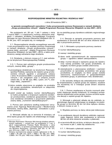 Dziennik Ustaw Nr 81 — 4979 — Poz. 550 550 ROZPORZÑDZENIE MINISTRA ROLNICTWA I ROZWOJU WSI1) z dnia 20 kwietnia 2007 r. w sprawie szczegó∏owych warunków i trybu przyznawania pomocy finansowej w ramach dzia∏ania „Grupy producentów rolnych” obj´tej Programem Rozwoju Obszarów Wiejskich na lata 2007—2013 Na podstawie art. 29 ust. 1 pkt 1 ustawy z dnia 7 marca 2007 r. o wspieraniu rozwoju obszarów wiejskich z udzia∏em Êrodków Europejskiego Funduszu Rolnego na rzecz Rozwoju Obszarów Wiejskich (Dz. U. Nr 64, poz. 427) zarzàdza si´, co nast´puje: § 1. Rozporzàdzenie okreÊla szczegó∏owe warunki i tryb przyznawania oraz wyp∏aty pomocy finansowej w ramach dzia∏ania „Grupy producentów rolnych”, zwanej dalej „pomocà”, obj´tej Programem Rozwoju Obszarów Wiejskich na lata 2007—2013, a tak˝e przestrzenny zasi´g wdra˝ania tego dzia∏ania. § 2. Dzia∏anie, o którym mowa w § 1, jest wdra˝ane na terytorium Rzeczypospolitej Polskiej. § 3. 1. Pomoc jest udzielana grupie producentów rolnych, zwanej dalej „grupà”: 1) prowadzàcej dzia∏alnoÊç na terytorium Rzeczypospolitej Polskiej, wpisanej do rejestru grup producentów rolnych zgodnie z przepisami ustawy z dnia 15 wrzeÊnia 2000 r. o grupach producentów rolnych i ich zwiàzkach oraz o zmianie innych ustaw (Dz. U. Nr 88, poz. 983, z póên. zm.2)), zwanego dalej „rejestrem”; 2) która zosta∏a utworzona ze wzgl´du na produkty lub grup´ produktów, okreÊlonych w za∏àczniku do rozporzàdzenia; 3) je˝eli zosta∏ jej nadany numer identyfikacyjny w trybie przepisów o krajowym systemie ewidencji producentów, ewidencji gospodarstw rolnych oraz ewidencji wniosków o przyznanie p∏atnoÊci, zwany dalej „numerem identyfikacyjnym”. 2. Pomoc jest udzielana wed∏ug kolejnoÊci otrzymania przez Agencj´ Restrukturyzacji i Modernizacji Rolnictwa, zwanà dalej „Agencjà”, wniosków o przyznanie pomocy. 3. Wniosek sk∏ada si´ w terminie 6 miesi´cy od dnia wpisu grupy do rejestru do w∏aÊciwego ze wzgl´——————— 1) 2) Minister Rolnictwa i Rozwoju Wsi kieruje dzia∏em administracji rzàdowej — rozwój wsi, na podstawie § 1 ust. 2 pkt 2 rozporzàdzenia Prezesa Rady Ministrów z dnia 18 lipca 2006 r. w sprawie szczegó∏owego zakresu dzia∏ania Ministra Rolnictwa i Rozwoju Wsi (Dz. U. Nr 131, poz. 915 oraz z 2007 r. Nr 38, poz. 244). Zmiany wymienionej ustawy zosta∏y og∏oszone w Dz. U. z 2003 r. Nr 229, poz. 2273, z 2004 r. Nr 162, poz. 1694, z 2005 r. Nr 175, poz. 1462 oraz z 2006 r. Nr 251, poz. 1847. du na siedzib´ grupy dyrektora oddzia∏u regionalnego Agencji. § 4. Decyzja w sprawie przyznania pomocy jest wydawana w terminie 60 dni od dnia z∏o˝enia wniosku o przyznanie pomocy. § 5. 1. Wniosek o przyznanie pomocy zawiera: 1) numer identyfikacyjny; 2) nazw´ i siedzib´ grupy; 3) dane osób upowa˝nionych do reprezentowania grupy — zgodnie z aktem za∏o˝ycielskim; 4) dat´ i numer decyzji o wpisaniu grupy do rejestru oraz nazw´ produktu lub grupy produktów, ze wzgl´du na które grupa zosta∏a utworzona; 5) oÊwiadczenie o planowanej wielkoÊci i wartoÊci przychodów ze sprzeda˝y produktów lub grupy produktów, ze wzgl´du na które grupa zosta∏a utworzona, wytworzonych w gospodarstwach cz∏onków grupy, w pierwszym roku dzia∏alnoÊci. 2. Do wniosku do∏àcza si´ zaÊwiadczenie marsza∏ka województwa o wpisie grupy do rejestru, wydane nie wczeÊniej ni˝ 3 miesiàce przed dniem z∏o˝enia wniosku. § 6. 1. Pomoc wyp∏acana w formie rocznych p∏atnoÊci obejmuje okresy kolejnych 12 miesi´cy prowadzenia dzia∏alnoÊci przez grup´, liczone od dnia wydania decyzji o wpisie grupy do rejestru. 2. Wniosek o p∏atnoÊç sk∏ada si´ do oddzia∏u regionalnego Agencji w∏aÊciwego ze wzgl´du na siedzib´ grupy w terminie 30 dni od dnia up∏ywu okresu, o którym mowa w ust. 1. 3. Wyp∏ata pomocy za dany okres jest dokonywana: 1) na podstawie decyzji dyrektora oddzia∏u regionalnego Agencji, która jest wydawana w terminie 60 dni od dnia z∏o˝enia wniosku o p∏atnoÊç; 2) w terminie 60 dni od dnia, w którym decyzja, o której mowa w pkt 1, sta∏a si´ ostateczna. § 7. 1. Wniosek o p∏atnoÊç zawiera: 1) numer identyfikacyjny; 2) nazw´ i siedzib´ grupy; Dziennik Ustaw Nr 81 — 4980 — 3) nazw´ produktu lub grupy produktów, ze wzgl´du na które grupa zosta∏a utworzona; 4) dane osób upowa˝nionych do reprezentowania grupy — zgodnie z aktem za∏o˝ycielskim; 5) wartoÊç przychodów netto ze sprzeda˝y produktów lub grupy produktów, ze wzgl´du na które grupa zosta∏a utworzona, wytworzonych w gospodarstwach cz∏onków grupy, za okres, którego dotyczy wniosek; 6) wartoÊç planowanych przychodów netto ze sprzeda˝y produktów lub grupy produktów, ze wzgl´du na które grupa zosta∏a utworzona, na kolejny rok prowadzenia dzia∏alnoÊci przez grup´; wymagania tego nie stosuje si´ do wniosku o p∏atnoÊç za ostatni rok, za który przys∏uguje pomoc. Poz. 550 2. Sposób obliczania oraz wysokoÊç maksymalnych dopuszczalnych kwot udzielanej pomocy sà okreÊlone w art. 35 rozporzàdzenia Rady (WE) nr 1698/2005 z dnia 20 wrzeÊnia 2005 r. w sprawie wsparcia rozwoju obszarów wiejskich przez Europejski Fundusz Rolny na rzecz Rozwoju Obszarów Wiejskich (EFRROW) (Dz. Urz. UE L 277 z 21.10.2005, str. 1, z póên. zm.). 3. Pomoc jest wyp∏acana w z∏otych, a jej przeliczenie nast´puje zgodnie z zasadami okreÊlonymi w art. 7 ust. 1 rozporzàdzenia Komisji (WE) nr 1913/2006 z dnia 20 grudnia 2006 r. ustanawiajàcego szczegó∏owe zasady stosowania agromonetarnego systemu dla euro w rolnictwie i zmieniajàcego niektóre rozporzàdzenia (Dz. Urz. UE L 365 z 21.12.2006, str. 52). § 9. Grupa, której przyznano pomoc: 2. Do wniosku do∏àcza si´: 1) wykazy faktur VAT i rachunków, uporzàdkowanych w uj´ciu chronologicznym, potwierdzajàcych: a) przychody netto grupy ze sprzeda˝y produktów lub grupy p