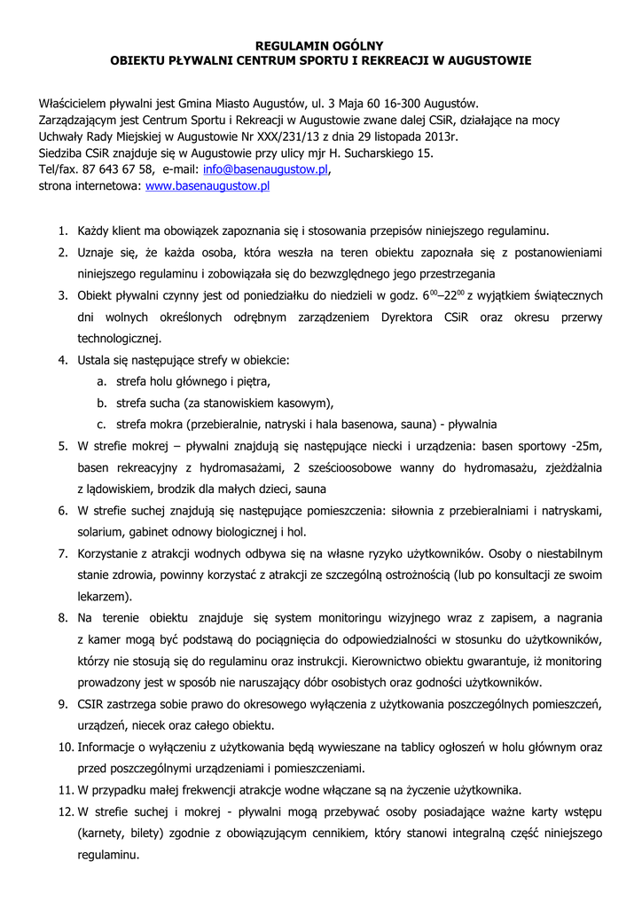 REGULAMIN OGÓLNY OBIEKTU PŁYWALNI CENTRUM SPORTU I REKREACJI W AUGUSTOWIE Właścicielem pływalni jest Gmina Miasto Augustów, ul. 3 Maja 60 16-300 Augustów. Zarządzającym jest Centrum Sportu i Rekreacji w Augustowie zwane dalej CSiR, działające na mocy Uchwały Rady Miejskiej w Augustowie Nr XXX/231/13 z dnia 29 listopada 2013r. Siedziba CSiR znajduje się w Augustowie przy ulicy mjr H. Sucharskiego 15. Tel/fax. 87 643 67 58, e-mail: [email protected], strona internetowa: www.basenaugustow.pl 1. Każdy klient ma obowiązek zapoznania się i stosowania przepisów niniejszego regulaminu. 2. Uznaje się, że każda osoba, która weszła na teren obiektu zapoznała się z postanowieniami niniejszego regulaminu i zobowiązała się do bezwzględnego jego przestrzegania 3. Obiekt pływalni czynny jest od poniedziałku do niedzieli w godz. 6 00–2200 z wyjątkiem świątecznych dni wolnych określonych odrębnym zarządzeniem Dyrektora CSiR oraz okresu przerwy technologicznej. 4. Ustala się następujące strefy w obiekcie: a. strefa holu głównego i piętra, b. strefa sucha (za stanowiskiem kasowym), c. strefa mokra (przebieralnie, natryski i hala basenowa, sauna) - pływalnia 5. W strefie mokrej – pływalni znajdują się następujące niecki i urządzenia: basen sportowy -25m, basen rekreacyjny z hydromasażami, 2 sześcioosobowe wanny do hydromasażu, zjeżdżalnia z lądowiskiem, brodzik dla małych dzieci, sauna 6. W strefie suchej znajdują się następujące pomieszczenia: siłownia z przebieralniami i natryskami, solarium, gabinet odnowy biologicznej i hol. 7. Korzystanie z atrakcji wodnych odbywa się na własne ryzyko użytkowników. Osoby o niestabilnym stanie zdrowia, powinny korzystać z atrakcji ze szczególną ostrożnością (lub po konsultacji ze swoim lekarzem). 8. Na terenie obiektu znajduje się system monitoringu wizyjnego wraz z zapisem, a nagrania z kamer mogą być podstawą do pociągnięcia do odpowiedzialności w stosunku do użytkowników, którzy nie stosują się do regulaminu oraz instrukcji. Kierownictwo obiektu gwarantuje, iż monitoring prowadzony jest w sposób nie naruszający dóbr osobistych oraz godności użytkowników. 9. CSIR zastrzega sobie prawo do okresowego wyłączenia z użytkowania poszczególnych pomieszczeń, urządzeń, niecek oraz całego obiektu. 10. Informacje o wyłączeniu z użytkowania będą wywieszane na tablicy ogłoszeń w holu głównym oraz przed poszczególnymi urządzeniami i pomieszczeniami. 11. W przypadku małej frekwencji atrakcje wodne włączane są na życzenie użytkownika. 12. W strefie suchej i mokrej - pływalni mogą przebywać osoby posiadające ważne karty wstępu (karnety, bilety) zgodnie z obowiązującym cennikiem, który stanowi integralną część niniejszego regulaminu. 13. Maksymalna dopuszczalna frekwencja w hali basenowej wynosi 147 osób na jednostkę czasową. W przypadku organizacji zawodów i imprez liczba ta może ulec zmianie. 14. Wstęp na halę basenową odbywa się po otrzymaniu transpondera Systemu Elektronicznej Obsługi Klienta, który uzyskuje się po wykupieniu usługi zgodnie z obowiązującym cennikiem usług. Transponder podlega rozliczeniu i zwrotowi przy wyjściu w kasie pływalni. 15. Każdy klient podczas pobytu w strefie mokrej i siłowni zobowiązany jest do noszenia paska – transpondera na przegubie dłoni lub stawu skokowego. 16. Naliczanie czasu pobytu w pływalni i siłowni rozpoczyna się po odczytaniu paska- transpondera na czytniku obrotowej bramki wejściowej. 17. W przypadku nie odczytania transpondera w ciągu 5 min, naliczanie czasu rozpocznie się od chwili wydania transpondera. 18. Zakończenie naliczania czasu następuje w chwili rozliczenia paska- transpondera w stanowisku kasowym. 19. W uzasadnionych przypadkach (np. kolejka przy kasie) istnieje możliwość zatrzymania czasu na 10 min. za pomocą czytnika znajdującego się w strefie suchej obiektu. Po zatrzymaniu czasu należy bezpośrednio udać się do kasy w celu rozliczenia. Klientom, którzy po zatrzymaniu czasu nie rozliczą się przy kasie w ciągu 10 min., czas ten będzie doliczony do czasu pobytu w pływalni i siłowni. 20. Zakupione karty abonamentowe nie podlegają zwrotowi. 21. Za niewykorzystane bilety wstępu oraz w przypadku wydalenia użytkownika z obiektu, uiszczone opłaty nie są zwracane. 22. Sprzedaż i wejście na bilety jednorazowe (1 godz.) do pływalni odbywa się do godz. 20:45 23. Sprzedaż i wejście na bilety jednorazowe (1,5 godz.) do siłowni odbywa się do godz. 20:15 24. Wszyscy klienci zobowiązani są do opuszczenia strefy suchej i mokrej do godz. 21 45 i wyjścia z obiektu do godz. 2200 25. Każda osoba przed wejściem do strefy suchej i mokrej ma obowiązek zmiany obuwia i pozostawienia odzieży wierzchniej w szatni holu głównego. 26. Każda osoba przed kąpielą w basenie powinna obowiązkowo umyć starannie całe swoje ciało. 27. Po skorzystaniu z WC w trakcie pobytu w pływalni należy bezwzględnie ponownie umyć całe ciało. 28. W strefie mokrej – hali basenowej obowiązuje czysty strój kąpielowy ściśle przylegający do ciała, własny ręcznik i wskazane jest poruszanie się boso lub używanie obuwia typu klapki sportowe. 29. Z basenu sportowego mogą korzystać wyłącznie osoby umiejące pływać. 30. Dzieci do lat 7 mogą korzystać indywidualnie z pływalni wyłącznie pod opieką osób pełnoletnich. Osoby te ponoszą pełną odpowiedzialność za powierzone ich opiece dzieci i odpowiadają za wszelkie szkody przez nie wyrządzone. Opiekun płaci za pobyt w pływalni według obowiązującego cennika. Jeden opiekun może mieć pod opieką maksymalnie dwoje dzieci do lat 7. 31. Dzieci do lat 2 korzystające z basenu muszą posiadać na sobie jednorazowe pielucho majtki do kąpieli. 32. Osoby niepełnosprawne wymagające bezpośredniej opieki zobowiązane są do przebywania w obiekcie wyłącznie z opiekunem. 33. Dopuszcza się używanie przez