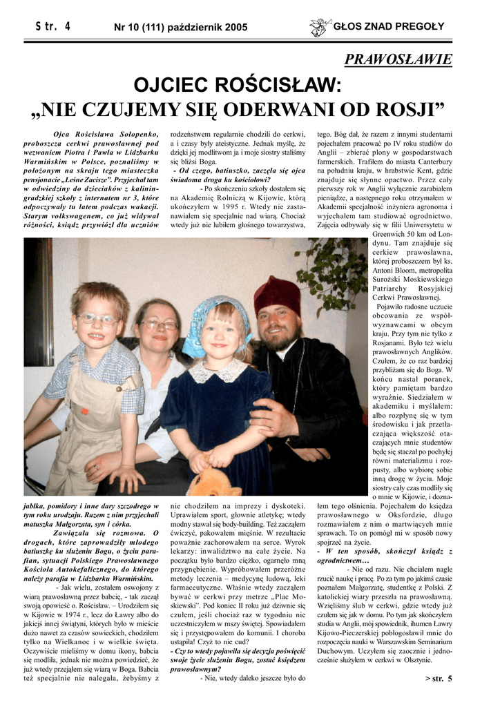 Str. 4 Nr 10 (111) październik 2005 GŁOS ZNAD PREGOŁY PRAWOSŁAWIE OJCIEC ROŚCISŁAW: „NIE CZUJEMY SIĘ ODERWANI OD ROSJI” Ojca Rościsława Sołopenko, proboszcza cerkwi prawosławnej pod wezwaniem Piotra i Pawła w Lidzbarku Warmińskim w Polsce, poznaliśmy w położonym na skraju tego miasteczka pensjonacie „Leśne Zacisze”. Przyjechał tam w odwiedziny do dzieciaków z kaliningradzkiej szkoły z internatem nr 3, które odpoczywały tu latem podczas wakacji. Starym volkswagenem, co już widywał różności, ksiądz przywiózł dla uczniów rodzeństwem regularnie chodzili do cerkwi, a i czasy były ateistyczne. Jednak myślę, że dzięki jej modlitwom ja i moje siostry staliśmy się bliżsi Boga. - Od czego, batiuszko, zaczęła się ojca świadoma droga ku kościołowi? - Po skończeniu szkoły dostałem się na Akademię Rolniczą w Kijowie, którą ukończyłem w 1995 r. Wtedy nie zastanawiałem się specjalnie nad wiarą. Chociaż wtedy już nie lubiłem głośnego towarzystwa, jabłka, pomidory i inne dary szczodrego w tym roku urodzaju. Razem z nim przyjechali matuszka Małgorzata, syn i córka. Zawiązała się rozmowa. O drogach, które zaprowadziły młodego batiuszkę ku służeniu Bogu, o życiu parafian, sytuacji Polskiego Prawosławnego Kościoła Autokefalicznego, do którego należy parafia w Lidzbarku Warmińskim. - Jak wielu, zostałem oswojony z wiarą prawosławną przez babcię, - tak zaczął swoją opowieść o. Rościsław. – Urodziłem się w Kijowie w 1974 r., lecz do Ławry albo do jakiejś innej świątyni, których było w mieście dużo nawet za czasów sowieckich, chodziłem tylko na Wielkanoc i w wielkie święta. Oczywiście mieliśmy w domu ikony, babcia się modliła, jednak nie można powiedzieć, że już wtedy przejąłem się wiarą w Boga. Babcia też specjalnie nie nalegała, żebyśmy z nie chodziłem na imprezy i dyskoteki. Uprawiałem sport, głownie atletykę; wtedy modny stawał się body-building. Też zacząłem ćwiczyć, pakowałem mięśnie. W rezultacie poważnie zachorowałem na serce. Wyrok lekarzy: inwalidztwo na całe życie. Na początku było bardzo ciężko, ogarnęło mną przygnębienie. Wypróbowałem przeróżne metody leczenia – medycynę ludową, leki farmaceutyczne. Właśnie wtedy zacząłem bywać w cerkwi przy metrze „Plac Moskiewski”. Pod koniec II roku już dziwnie się czułem, jeśli chociaż raz w tygodniu nie uczestniczyłem w mszy świętej. Spowiadałem się i przystępowałem do komunii. I choroba ustąpiła! Czyż to nie cud? - Czy to wtedy pojawiła się decyzja poświęcić swoje życie służeniu Bogu, zostać księdzem prawosławnym? - Nie, wtedy daleko jeszcze było do tego. Bóg dał, że razem z innymi studentami pojechałem pracować po IV roku studiów do Anglii – zbierać plony w gospodarstwach farmerskich. Trafiłem do miasta Canterbury na południu kraju, w hrabstwie Kent, gdzie znajduje się słynne opactwo. Przez cały pierwszy rok w Anglii wyłącznie zarabiałem pieniądze, a następnego roku otrzymałem w Akademii specjalność inżyniera agronoma i wyjechałem tam studiować ogrodnictwo. Zajęcia odbywały się w filii Uniwersytetu w Greenwich 50 km od Londynu. Tam znajduje się cerkiew prawosławna, której proboszczem był ks. Antoni Bloom, metropolita Surożski Moskiewskiego Patriarchy Rosyjskiej Cerkwi Prawosławnej. Pojawiło radosne uczucie obcowania ze współwyznawcami w obcym kraju. Przy tym nie tylko z Rosjanami. Było też wielu prawosławnych Anglików. Czułem, że co raz bardziej przybliżam się do Boga. W końcu nastał poranek, który pamiętam bardzo wyraźnie. Siedziałem w akademiku i myślałem: albo rozpłynę się w tym środowisku i jak przetłaczająca większość otaczających mnie studentów będę się staczał po pochyłej równi materializmu i rozpusty, albo wybiorę sobie inną drogę w życiu. Moje siostry cały czas modliły się o mnie w Kijowie, i doznałem tego olśnienia. Pojechałem do księdza prawosławnego w Oksfordzie, długo rozmawiałem z nim o martwiących mnie sprawach. To on pomógł mi w sposób nowy spojrzeć na życie. - W ten sposób, skończył ksiądz z ogrodnictwem… - Nie od razu. Nie chciałem nagle rzucić naukę i pracę. Po za tym po jakimś czasie poznałem Małgorzatę, studentkę z Polski. Z katolickiej wiary przeszła na prawosławną. Wzięliśmy ślub w cerkwi, gdzie wtedy już czułem się jak w domu. Po tym jak skończyłem studia w Anglii, mój spowiednik, ihumen Ławry Kijowo-Pieczerskiej pobłogosławił mnie do rozpoczęcia nauki w Warszawskim Seminarium Duchowym. Uczyłem się zaocznie i jednocześnie służyłem w cerkwi w Olsztynie. > str. 5
