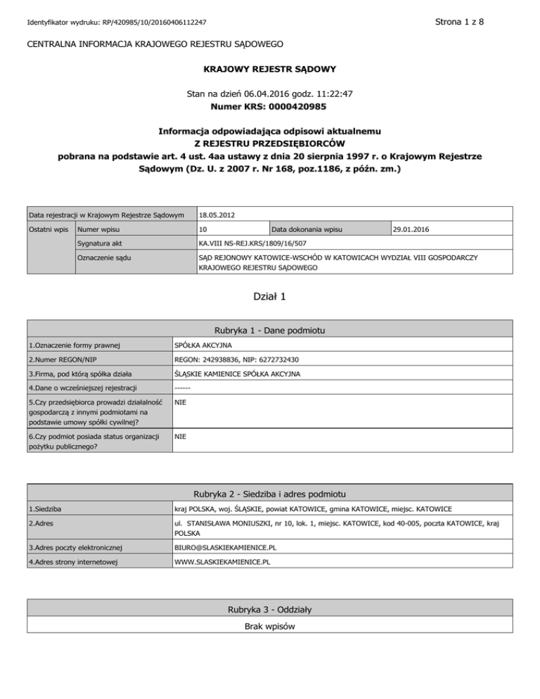 Strona 1 z 8 Identyfikator wydruku: RP/420985/10/20160406112247 CENTRALNA INFORMACJA KRAJOWEGO REJESTRU SĄDOWEGO KRAJOWY REJESTR SĄDOWY Stan na dzień 06.04.2016 godz. 11:22:47 Numer KRS: 0000420985 Informacja odpowiadająca odpisowi aktualnemu Z REJESTRU PRZEDSIĘBIORCÓW pobrana na podstawie art. 4 ust. 4aa ustawy z dnia 20 sierpnia 1997 r. o Krajowym Rejestrze Sądowym (Dz. U. z 2007 r. Nr 168, poz.1186, z późn. zm.) Data rejestracji w Krajowym Rejestrze Sądowym 18.05.2012 Ostatni wpis Numer wpisu 10 Sygnatura akt KA.VIII NS-REJ.KRS/1809/16/507 Oznaczenie sądu SĄD REJONOWY KATOWICE-WSCHÓD W KATOWICACH WYDZIAŁ VIII GOSPODARCZY KRAJOWEGO REJESTRU SĄDOWEGO Data dokonania wpisu 29.01.2016 Dział 1 Rubryka 1 - Dane podmiotu 1.Oznaczenie formy prawnej SPÓŁKA AKCYJNA 2.Numer REGON/NIP REGON: 242938836, NIP: 6272732430 3.Firma, pod którą spółka działa ŚLĄSKIE KAMIENICE SPÓŁKA AKCYJNA 4.Dane o wcześniejszej rejestracji ------ 5.Czy przedsiębiorca prowadzi działalność gospodarczą z innymi podmiotami na podstawie umowy spółki cywilnej? NIE 6.Czy podmiot posiada status organizacji pożytku publicznego? NIE Rubryka 2 - Siedziba i adres podmiotu 1.Siedziba kraj POLSKA, woj. ŚLĄSKIE, powiat KATOWICE, gmina KATOWICE, miejsc. KATOWICE 2.Adres ul. STANISŁAWA MONIUSZKI, nr 10, lok. 1, miejsc. KATOWICE, kod 40-005, poczta KATOWICE, kraj POLSKA 3.Adres poczty elektronicznej [email protected] 4.Adres strony internetowej WWW.SLASKIEKAMIENICE.PL Rubryka 3 - Oddziały Brak wpisów Strona 2 z 8 Identyfikator wydruku: RP/420985/10/20160406112247 Rubryka 4 - Informacje o statucie 1.Informacja o sporządzeniu lub zmianie statutu 1 20.04.2012R. NOTARIUSZ WOJCIECH KURZEJA, KANCELARIA NOTARIALNA W CHORZOWIE UL.G.H.DĄBROWSKIEGO 48/4, REP.A NR 1470/2012 2 19.02.2014R., AKT NOTARIALNY REPERTORIUM "A" NR 1146/2014, NOTARIUSZ RAFAŁ SZMAL, KANCELARIA NOTARIALNA W CZELADZI, ZMIENIONO § 7 UST.2 STATUTU. 3 AKT NOTARIALNY Z DNIA 15 GRUDNIA 2014R.,REPERTORIUM A NR 8306/2014 SPORZĄDZONY PRZEZ NOTARIUSZA RAFAŁA SZMALA Z KANCELARII NOTARIALNEJ NOTARIUSZ RAFAŁ SZMAL SIEDZIBĄ W CZELADZI PRZY ULICY 1 MAJA 18: -ZMIENIONO TREŚĆ PRAGRAFU:PAR 1 UST 3(PRAGRAF JEDEN USTĘP TRZY). 4 15.12.2014R., REP A NR 8306/2014 NOTARIUSZ RAFAŁ SZMAL, KANCELARIA NOTARIALNA NOTARIUSZ RAFAŁ SZMAL W CZELADZI UL. 1 MAJA 18. ZMIENIONO TREŚĆ §3. Rubryka 5 1.Czas, na jaki została utworzona spółka NIEOZNACZONY 2.Oznaczenie pisma innego niż Monitor Sądowy i Gospodarczy, przeznaczonego do ogłoszeń spółki ------ 4.Czy statut przyznaje uprawnienia osobiste określonym akcjonariuszom lub tytuły uczestnictwa w dochodach lub majątku spółki nie wynikających z akcji? NIE 5.Czy obligatoriusze mają prawo do udziału NIE w zysku? Rubryka 6 - Sposób powstania spółki Brak wpisów Rubryka 7 - Dane jedynego akcjonariusza Brak wpisów Rubryka 8 - Kapitał spółki 1.Wysokość kapitału zakładowego 890 400,00 ZŁ 2.Wysokość kapitału docelowego ------ 3.Liczba akcji wszystkich emisji 8904000 4.Wartość nominalna akcji 0,10 ZŁ 5.Kwotowe określenie części kapitału wpłaconego 890 400,00 ZŁ 6.Wartość nominalna warunkowego podwyższenia kapitału zakładowego ------ Podrubryka 1 Informacja o wniesieniu aportu 1.Określenie wartości akcji objętych za 1 400 000,00 ZŁ Strona 3 z 8 Identyfikator wydruku: RP/420985/10/20160406112247 aport Rubryka 9 - Emisja akcji 1 2 3 4 5 6 1.Nazwa serii akcji A 2.Liczba akcji w danej serii 2000000 3.Rodzaj uprzywilejowania i liczba akcji uprzywilejowanych lub informacja, że akcje nie są uprzywilejowane AKCJE NIE SĄ UPRZYWILEJOWANE 1.Nazwa serii akcji B 2.Liczba akcji w danej serii 4000000 3.Rodzaj uprzywilejowania i liczba akcji uprzywilejowanych lub informacja, że akcje nie są uprzywilejowane AKCJE NIE SĄ UPRZYWILEJOWANE 1.Nazwa serii akcji C 2.Liczba akcji w danej serii 1200000 3.Rodzaj uprzywilejowania i liczba akcji uprzywilejowanych lub informacja, że akcje nie są uprzywilejowane AKCJE NIE SĄ UPRZYWILEJOWANE 1.Nazwa serii akcji D 2.Liczba akcji w danej serii 204000 3.Rodzaj uprzywilejowania i liczba akcji uprzywilejowanych lub informacja, że akcje nie są uprzywilejowane AKCJE NIE SĄ UPRZYWILEJOWANE 1.Nazwa serii akcji E 2.Liczba akcji w danej serii 1000000 3.Rodzaj uprzywilejowania i liczba akcji uprzywilejowanych lub informacja, że akcje nie są uprzywilejowane AKCJE NIE SĄ UPRZYWILEJOWANE 1.Nazwa serii akcji F 2.Liczba akcji w danej serii 500000 3.Rodzaj uprzywilejowania i liczba akcji uprzywilejowanych lub informacja, że akcje nie są uprzywilejowane AKCJE NIE SĄ UPRZYWILEJOWANE Rubryka 10 - Wzmianka o podjęciu uchwały o emisjach obligacji zamiennych Brak wpisów Rubryka 11 Strona 4 z 8 Identyfikator wydruku: RP/420985/10/20160406112247 1.Czy zarząd lub rada administrująca są upoważnieni do emisji warrantów subskrypcyjnych? NIE Dział 2 Rubryka 1 - Organ uprawniony do reprezentacji podmiotu 1.Nazwa organu uprawnionego do reprezentowania podmiotu ZARZĄD 2.Sposób reprezentacji podmiotu KAŻDY CZŁONEK ZARZĄDU MA PRAWO DO SAMODZIELNEJ REPREZENTACJI SPÓŁKI. Podrubryka 1 Dane osób wchodzących w skład organu 1 2 1.Nazwisko / Nazwa lub firma PIECHNICZEK 2.Imiona OFKA JADWIGA 3.Numer PESEL/REGON 84080900544 4.Numer KRS **** 5.Funkcja w organie reprezentującym PREZES ZARZĄDU 6.Czy osoba wchodząca w skład zarządu została zawieszona w czynnościach? NIE 7.Data do jakiej została zawieszona ------ 1.Nazwisko / Nazwa lub firma KITA 2.Imiona KORNELIA 3.Numer PESEL/REGON 85092309929 4.Numer KRS **** 5.Funkcja w organie reprezentującym CZŁONEK ZARZĄDU 6.Czy osoba wchodząca w skład zarządu została zawieszona w czynnościach? NIE 7.Data do jakiej została zawieszona ------ Rubryka 2 - Organ nadzoru 1 1.Nazwa organu RADA NADZORCZA Podrubryka 1 Dane osób wchodzących w skład organu 1 2 3 1.Nazwisko KICZKA 2.Imiona KAROLINA 3.Numer PESEL 89101602247 1.Nazwisko PODLIŃSKA 2.Imiona EMILIA 3.Numer PESEL 90092702481 1.Nazwisko ROSIŃSKI 2.Imiona