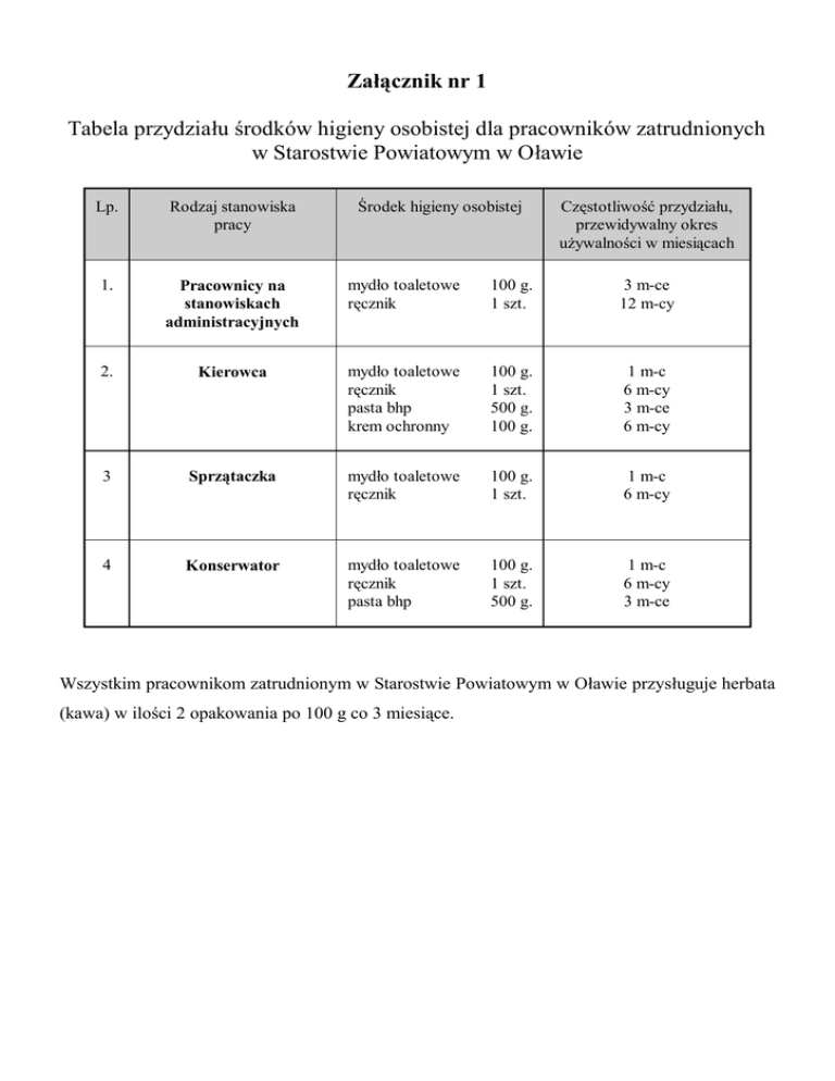 Załącznik nr 1 Tabela przydziału środków higieny osobistej dla