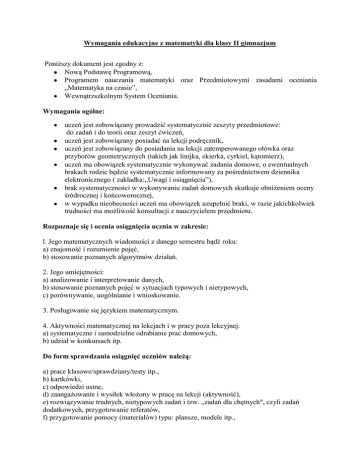 Wymagania edukacyjne z matematyki dla klasy II gimnazjum Poniższy dokument jest zgodny z: Nową Podstawę Programową, Programem nauczania matematyki oraz Przedmiotowymi zasadami oceniania „Matematyka na czasie”, Wewnątrzszkolnym System Oceniania. Wymagania ogólne: uczeń jest zobowiązany prowadzić systematycznie zeszyty przedmiotowe: do zadań i do teorii oraz zeszyt ćwiczeń, uczeń jest zobowiązany posiadać na lekcji podręcznik, uczeń jest zobowiązany do posiadania na lekcji zatemperowanego ołówka oraz przyborów geometrycznych (takich jak linijka, ekierka, cyrkiel, kątomierz), uczeń ma obowiązek systematycznie wykonywać zadania domowe, o ewentualnych brakach rodzic będzie systematycznie informowany za pośrednictwem dziennika elektronicznego ( zakładka:„Uwagi i osiągnięcia”), brak systematyczności w wykonywaniu zadań domowych skutkuje obniżeniem oceny śródrocznej i końcoworocznej, w wypadku nieobecności uczeń ma obowiązek uzupełnić braki, w razie jakichkolwiek trudności ma możliwość konsultacji z nauczycielem przedmiotu. Rozpoznaje się i ocenia osiągnięcia ucznia w zakresie: l. Jego matematycznych wiadomości z danego semestru bądź roku: a) znajomość i rozumienie pojęć, b) stosowanie poznanych algorytmów działań. 2. Jego umiejętności: a) analizowanie i interpretowanie danych, b) stosowanie poznanych pojęć w sytuacjach typowych i nietypowych, c) porównywanie, uogólnianie i wnioskowanie. 3. Posługiwanie się językiem matematycznym. 4. Aktywności matematycznej na lekcjach i w pracy poza lekcyjnej: a) systematyczne i samodzielne odrabianie prac domowych, b) udział w konkursach itp. Do form sprawdzania osiągnięć uczniów należą: a) prace klasowe/sprawdziany/testy itp., b) kartkówki, c) odpowiedzi ustne, d) zaangażowanie i wysiłek włożony w pracę na lekcji (aktywność), e) rozwiązywanie trudnych, nietypowych zadań i tzw. „zadań dla chętnych", czyli zadań dodatkowych, przygotowanie referatów, f) przygotowanie pomocy (materiałów) typu: plansze, modele itp., g) prace domowe, h) udział w konkursach. Ad. a) Prace klasowe/sprawdziany/testy itp. obejmują szerszy materiał, są zapowiadane z tygodniowym wyprzedzeniem. Prace klasowe/sprawdziany/testy mogą zawierać zadania dodatkowe. Prace klasowe/sprawdziany/testy są obowiązkowe dla ucznia. Zatrzymanie pracy klasowej/sprawdzianu/testu przez ucznia (nie oddanie jej) jest równoznaczne z otrzymaniem oceny niedostatecznej. Uczeń ma prawo przystąpić do jednej poprawy każdej pracy klasowej/sprawdzianu/testu, jeżeli otrzymał ocenę niedostateczną. Termin i zasady poprawy w porozumieniu z uczniem ustala nauczyciel. Do dziennika wpisuje się każdą ocenę. Uczeń, który z przyczyn nieusprawiedliwionych nie pisze pracy klasowej/sprawdzianu/testu z całą klasą - traci prawo do poprawy. Ad. b) Kartkówka a) obejmuje krótsze partie materiału, jeśli nie jest zapowiedziana jest to najwyżej materiał z pięciu ostatnich lekcji, b) termin kartkówki nie musi być uczniom znany, c) kartkówka nie musi być poprawiana ani pisana w innym terminie przez nieobecnych uczniów. Oceny ustala się w skali procentowej przełożonej na stopnie według następującego klucza: p -procent punktów uzyskanych przez ucznia Ocena 100% plus prawidłowo rozwiązane zadanie dodatkowe* celująca* 90% ≤ p≤ 100% bardzo dobra 75% ≤ p < 90% dobra 55% ≤ p < 75% dostateczna 40% ≤ p < 55% dopuszczająca p < 40% niedostateczna * Uczeń otrzymuje ocenę celującą o ile w pracy pisemnej jest zawarte zadanie na ocenę dodatkową (celującą), w pozostałych przypadkach (gdy prace pisemne nie zawierają takiego zadania) maksymalna ocena, jaką uczeń może dostać to stopień bardzo dobry. Osoba, która w czasie pisania pracy klasowej/sprawdzianu/testu/kartkówki nie pracuje samodzielnie może: otrzymać ocenę niedostateczną, ocena może być obniżona o stopień lub ćwiczenia wykonane do tego momentu będą unieważnione. Ad. h) Konkursy mają na celu motywowanie ucznia do dalszego rozwoju i stwarzają warunki do samodzielnej pracy. Uczniowie mogą brać udział w konkursach: a) wewnątrz szkolnych laureaci (I,II,III miejsce) otrzymują cząstkową ocenę celującą. b) zewnątrz szkolnych -finalista konkursu z matematyki- etap wojewódzki- otrzymuje ocenę celującą na koniec roku. -finalista etapu okręgowego- otrzymuje cząstkową ocenę celującą. Ocenianie na lekcjach: 1. Ocenie podlegają różnorodne formy pracy ucznia, ze względu na takie czynniki jak: stopień trudności, pracochłonność, zakres materiału itp., oceny mają różną wagę i wartość. Każdy sposób sprawdzenia wiedzy może być oceniony na odpowiednią ocenę. 2. Za pięć plusów uczeń otrzymuje ocenę bardzo dobrą (np. zad. dodatkowe, aktywność na lekcji, itp.), za 4 plusy , jeden minus ocenę dobrą , 3 plusy i 2 minusy -ocenę dostateczną, 2 plusy i 3 minusy -ocene dopuszczającą za 4 minusy ocenę niedostateczną. 3. Za samodzielnie rozwiązane zadania o podwyższonym stopniu trudności uczeń może otrzymać cząstkową ocenę celującą. Nauczyciel przedmiotu, podczas oceny pracy ucznia respektuje opinie i orzeczenia Poradni Psychologiczno-Pedagogicznej. Informowanie o postępach i trudnościach w nauce ucznia: a) uczeń: l) oceny, 2) rozmowy, 3) pochwały, nagany ustne, 4) uwagi wpisane do dziennika elektronicznego; b) rodzic/opiekun prawny: 1) na bieżąco (oceny i uwagi są wpisywane do dziennika elektronicznego, do którego wgląd ma rodzic/opiekun prawny) 2) podczas rozmowy w dniu otwartym. Wgląd do prac jest możliwy dla ucznia podczas lekcji, dla rodzica podczas dni otwartych. Wszystkie oceny są jawne zarówno dla ucznia jak i rodzica. 5. Ocena śródroczna jest ustalona ze wszystkich ocen cząstkowych z uwzględnieniem preferencji ocen z prac klasowych/sprawdzianów/testów oraz kartkówek. 6. Ocena roczna uwzględnia ocenę za pierwszy semestr. Wymagania programowe z ma