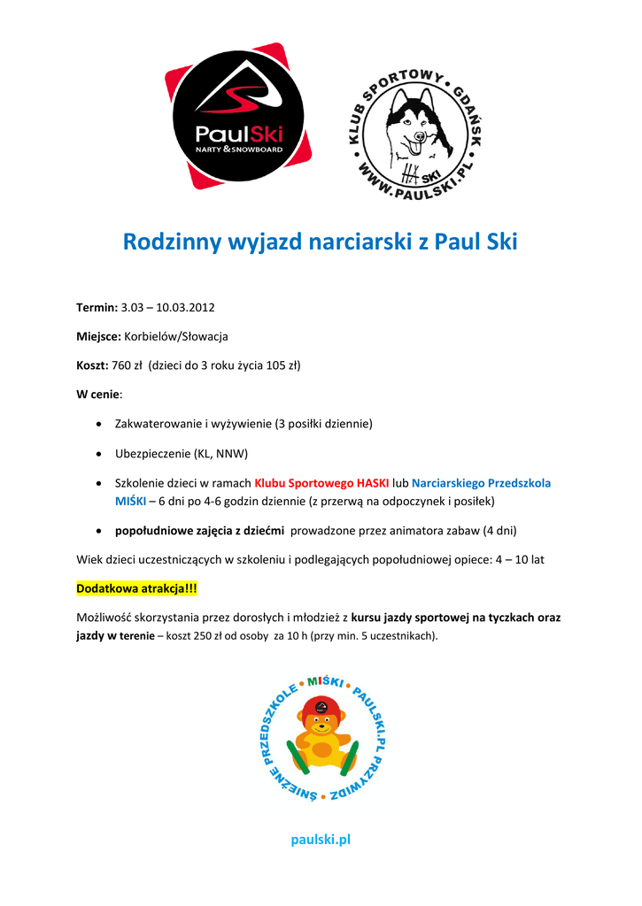 Rodzinny wyjazd narciarski z Paul Ski Termin: 3.03 – 10.03.2012 Miejsce: Korbielów/Słowacja Koszt: 760 zł (dzieci do 3 roku życia 105 zł) W cenie: Zakwaterowanie i wyżywienie (3 posiłki dziennie) Ubezpieczenie (KL, NNW) Szkolenie dzieci w ramach Klubu Sportowego HASKI lub Narciarskiego Przedszkola MIŚKI – 6 dni po 4-6 godzin dziennie (z przerwą na odpoczynek i posiłek) popołudniowe zajęcia z dziećmi prowadzone przez animatora zabaw (4 dni) Wiek dzieci uczestniczących w szkoleniu i podlegających popołudniowej opiece: 4 – 10 lat Dodatkowa atrakcja!!! Możliwośd skorzystania przez dorosłych i młodzież z kursu jazdy sportowej na tyczkach oraz jazdy w terenie – koszt 250 zł od osoby za 10 h (przy min. 5 uczestnikach). paulski.pl Tereny narciarskie: Pilsko i Sihelne Gruniky (Słowacja) www.ski-gruniky.sk Ośrodek Narciarski "PILSKO" to jeden z trzech największych kompleksów narciarskich w Polsce położony jest w Beskidzie Żywieckim, w masywie Pilska (1557 m n.p.m.) najwyżej, po Kasprowym Wierchu, narciarskiej górze w kraju. W obrębie nartostrad ośrodka (blisko 20 km tras) funkcjonuje 10 wyciągów orczykowych oraz 1 wyciąg krzesełkowy. Najbardziej godną polecenia jest trasa zjazdowa nr 5, liczy ona blisko 4 500 m długości i należy do dwóch najdłuższych w Polsce. SKI GRUNIKY to oddalona zaledwie o kilka kilometrów od Korbielowa prywatna stacja narciarska na Słowacji. Gruniky mają już spore grono wielbicieli. Dlaczego jeżdżą na narty właśnie tutaj? Trzy wyciągi orczykowe, sztuczne naśnieżanie, zadbane, regularnie przygotowywane nowoczesnymi ratrakami szerokie trasy, przytulny barek z ciepłą strawę, duże, bezpłatne parkingi ... i czuwająca nad wszystkim miła, sprawna, profesjonalna obsługa. A do tego atrakcje nadprogramowenarciarskie wieczory z pochodniami, ogniska z myśliwskim poczęstunkiem, karnetowe promocje z losowaniem nagród. W organizacji SKI GRUNIKÓW widad rękę dobrego gospodarza! Zakwaterowanie: Ośrodek/ Dom rekolekcyjny Ojców Dominikanów w Korbielowie; kilkuosobowe pokoje, w większości z pełnym węzłem sanitarnym, sala jadalna, świetlica, sala konferencyjna, kaplica. Zapisy: [email protected] kontakt tel: 509 989 822 przedpłaty 200 zł do 10 stycznia na konto: m Bank 97 1140 2004 0000 3002 4994 6374 PAUL Podróże z Duszą Paweł Jodczyk Ul. Meissnera 9 80 – 462 Gdaosk zapraszam: Paweł Jodczyk – kierownik SN Paul SKI paulski.pl