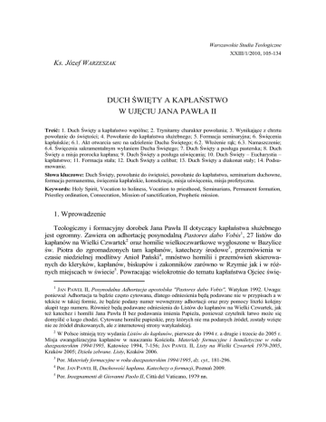 Warszawskie Studia Teologiczne XXIII/1/2010, 105-134 Ks. Józef WARZESZAK DUCH ŚWIĘTY A KAPŁAŃSTWO W UJĘCIU JANA PAWŁA II Treść: 1. Duch Święty a kapłaństwo wspólne; 2. Trynitarny charakter powołania; 3. Wynikające z chrztu powołanie do świętości; 4. Powołanie do kapłaństwa słuŜebnego; 5. Formacja seminaryjna; 6. Święcenia kapłańskie; 6.1. Akt otwarcia serc na udzielenie Ducha Świętego; 6.2. WłoŜenie rąk; 6.3. Namaszczenie; 6.4. Święcenia sakramentalnym wylaniem Ducha Świętego; 7. Duch Święty a posługa pasterska; 8. Duch Święty a misja prorocka kapłana; 9. Duch Święty a posługa uświęcania; 10. Duch Święty – Eucharystia – kapłaństwo; 11. Formacja stała; 12. Duch Święty a celibat; 13. Duch Święty a diakonat stały; 14. Podsumowanie. Słowa kluczowe: Duch Święty, powołanie do świętości, powołanie do kapłaństwa, seminarium duchowne, formacja permanentna, święcenia kapłańskie, konsekracja, misja uświęcenia, misja profetyczna. Keywords: Holy Spirit, Vocation to holiness, Vocation to priesthood, Seminarians, Permanent formation, Priestley ordination, Consecration, Mission of sanctification, Prophetic mission. 1. Wprowadzenie Teologiczny i formacyjny dorobek Jana Pawła II dotyczący kapłaństwa słuŜebnego jest ogromny. Zawiera on adhortację posynodalną Pastores dabo Vobis1, 27 listów do kapłanów na Wielki Czwartek2 oraz homilie wielkoczwartkowe wygłoszone w Bazylice św. Piotra do zgromadzonych tam kapłanów, katechezy środowe3, przemówienia w czasie niedzielnej modlitwy Anioł Pański4, mnóstwo homilii i przemówień skierowanych do kleryków, kapłanów, biskupów i zakonników zarówno w Rzymie jak i w róŜnych miejscach w świecie5. Powracając wielokrotnie do tematu kapłaństwa Ojciec świę1 JAN PAWEŁ II, Posynodalna Adhortacja apostolska "Pastores dabo Vobis", Watykan 1992. Uwaga: poniewaŜ Adhortacja ta będzie często cytowana, dlatego odniesienia będą podawane nie w przypisach a w tekście w takiej formie, Ŝe będzie podany numer wewnętrzny adhortacji oraz przy pomocy literki kolejny akapit tego numeru. RównieŜ będą podawane odniesienia do Listów do kapłanów na Wielki Czwartek, jak teŜ katechez i homilii Jana Pawła II bez podawania imienia PapieŜa, poniewaŜ czytelnik łatwo moŜe się domyślić o kogo chodzi. Cytowane homilie papieskie, przy których nie ma podanych źródeł, zostały wzięte nie ze źródeł drukowanych, ale z internetowej strony watykańskiej. 2 W Polsce istnieją trzy wydania Listów do kapłanów, pierwsze do 1994 r. a drugie i trzecie do 2005 r. Misja ewangelizacyjna kapłanów w nauczaniu Kościoła. Materiały formacyjne i homiletyczne w roku duszpasterskim 1994/1995, Katowice 1994, 7-156; JAN PAWEŁ II, Listy na Wielki Czwartek 1979-2005, Kraków 2005; Dzieła zebrane. Listy, Kraków 2006. 3 Por. Materiały formacyjne w roku duszpasterskim 1994/1995, dz. cyt., 181-296. 4 Por. JAN PAWEŁ II, Duchowość kapłana. Katechezy o formacji, Poznań 2009. 5 Por. Insegnamenti di Giovanni Paolo II, Città del Vaticano, 1979 nn. 106 KS. JÓZEF WARZESZAK ty ukazuje je w niezwykle głęboki i róŜnorodny sposób. Nie ma zagadnienia, któremu by nie poświęcił większej czy mniejszej uwagi. Ten potęŜny dorobek jest nieustannie studiowany przez kapłanów, teologów i ludzi odpowiedzialnych za formację kapłańską. Powstało wiele opracowań, takŜe w Polsce, których tu nie sposób wyliczyć. W niniejszym artykule chcę się skupić na jednym bardzo waŜnym aspekcie kapłaństwa słuŜebnego, jakim jest jego odniesienie do Ducha Świętego. RównieŜ i tym zagadnieniem zajmowali się teologowie polscy. WyróŜniłbym tu przede wszystkim ks. bpa T. Wilskiego6 i ks. prof. Waleriana Słomkę, który stara się nadać naleŜyte miejsce wymiarowi pneumatologicznemu w całościowym ujęciu duchowości kapłańskiej7. Pomimo iŜ zajmowano się tym zagadnieniem, to jednak muszę stwierdzić, Ŝe zdarza się, iŜ w opracowaniach całościowych teologii kapłaństwa, jakie ukazały się w ostatnich latach nie uwzględniono wcale, lub w niewielkim stopniu – nie chcę tu wymieniać tych publikacji – aspektu pneumatologicznego kapłaństwa. Jest to temat tak fascynujący, Ŝe warto nad nim wciąŜ na nowo podejmować refleksję. A nie chodzi tylko o sam sakrament kapłaństwa, lecz o ukazanie działania Parakleta poczynając od kapłaństwa chrzcielnego – wspólnego, poprzez powołanie, formację seminaryjną, permanentną, poprzez święcenia, udział w potrójnej misji Chrystusa, jaką jest misja pasterska, nauczycielska i uświęcania aŜ po celibat, diakonat stały. Podstawowym źródłem dla niniejszego opracowania jest Adhortacja Pastores dabo Vobis oraz dwa listy do kapłanów, które Jan Paweł II poświęcił relacji pomiędzy Duchem Świętym a kapłaństwem słuŜebnym: w 1990 r. przed synodem biskupów zajmującym się formacją do kapłaństwa i w 1998 r. – w Roku Ducha Świętego – czasu przygotowania do Jubileuszu Dwutysiąclecia chrześcijaństwa. Ponadto zostały wykorzystane katechezy i homilie papieskie, w których spotkano aluzje do interesującego nas tematu. JuŜ w tym miejscu moŜna powiedzieć, Ŝe Jan Paweł II napisał tyle o odniesieniu Ducha Świętego do kapłaństwa słuŜebnego, Ŝe próŜno by szukać kogoś zarówno pośród papieŜy, biskupów, jak i teologów, który by mu w tym dorównał. 1. Duch Święty a kapłaństwo wspólne Poprzez chrzest św., sakrament odrodzenia, wszyscy wierzący otrzymują Ducha Pańskiego, który ich konsekruje, otrzymują udział w powszechnym kapłaństwie, dzięki któremu jako nowy Lud BoŜy tworzą duchową świątynię, w której oddają chwałę Bogu i głoszą dzieła potęgi Zbawiciela, który ich wyzwolił od ciemności grzechu do przedziwnego swojego światła (por. 2 P 2, 4-10). Jak Duch Święty spoczywał na Mesjaszu, tak teŜ spoczywa na ludzie mesjańskim, na całym Ludzie BoŜym. Z