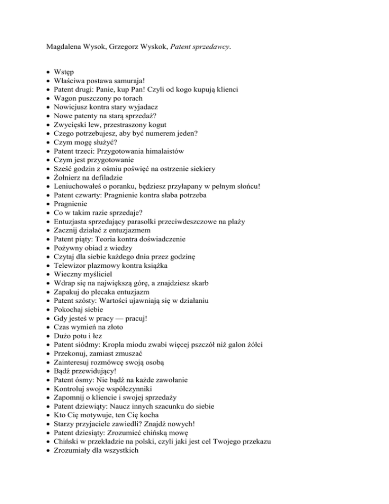 Magdalena Wysok, Grzegorz Wyskok, Patent sprzedawcy. Wstęp Właściwa postawa samuraja! Patent drugi: Panie, kup Pan! Czyli od kogo kupują klienci Wagon puszczony po torach Nowicjusz kontra stary wyjadacz Nowe patenty na starą sprzedaż? Zwycięski lew, przestraszony kogut Czego potrzebujesz, aby być numerem jeden? Czym mogę służyć? Patent trzeci: Przygotowania himalaistów Czym jest przygotowanie Sześć godzin z ośmiu poświęć na ostrzenie siekiery Żołnierz na defiladzie Leniuchowałeś o poranku, będziesz przyłapany w pełnym słońcu! Patent czwarty: Pragnienie kontra słaba potrzeba Pragnienie Co w takim razie sprzedaje? Entuzjasta sprzedający parasolki przeciwdeszczowe na plaży Zacznij działać z entuzjazmem Patent piąty: Teoria kontra doświadczenie Pożywny obiad z wiedzy Czytaj dla siebie każdego dnia przez godzinę Telewizor plazmowy kontra książka Wieczny myśliciel Wdrap się na największą górę, a znajdziesz skarb Zapakuj do plecaka entuzjazm Patent szósty: Wartości ujawniają się w działaniu Pokochaj siebie Gdy jesteś w pracy — pracuj! Czas wymień na złoto Dużo potu i łez Patent siódmy: Kropla miodu zwabi więcej pszczół niż galon żółci Przekonuj, zamiast zmuszać Zainteresuj rozmówcę swoją osobą Bądź przewidujący! Patent ósmy: Nie bądź na każde zawołanie Kontroluj swoje współczynniki Zapomnij o kliencie i swojej sprzedaży Patent dziewiąty: Naucz innych szacunku do siebie Kto Cię motywuje, ten Cię kocha Starzy przyjaciele zawiedli? Znajdź nowych! Patent dziesiąty: Zrozumieć chińską mowę Chiński w przekładzie na polski, czyli jaki jest cel Twojego przekazu Zrozumiały dla wszystkich Dlaczego nikt Cię nie rozumie To, co mówisz Ty, inni muszą widzieć, a nie jedynie słyszeć Papuga, która powtarza Ilustracja, ilustracja i jeszcze raz ilustracja Patent jedenasty: Sztuka współżycia z ludźmi Pozwól klientowi kupować Wyróżniaj się i zawsze doradzaj z elegancją Patent dwunasty: Doskonały rozmówca Definicja doskonałego rozmówcy Patent trzynasty: Zdobądź nowych klientów Network marketing w sprzedaży Prezentacja oferty Jak się przygotować Następny i najważniejszy krok Co dalej List tradycyjny Jak kompletować listę Podsumowanie Lektury obowiązkowe Łączny czas nagrania: 03:01:00