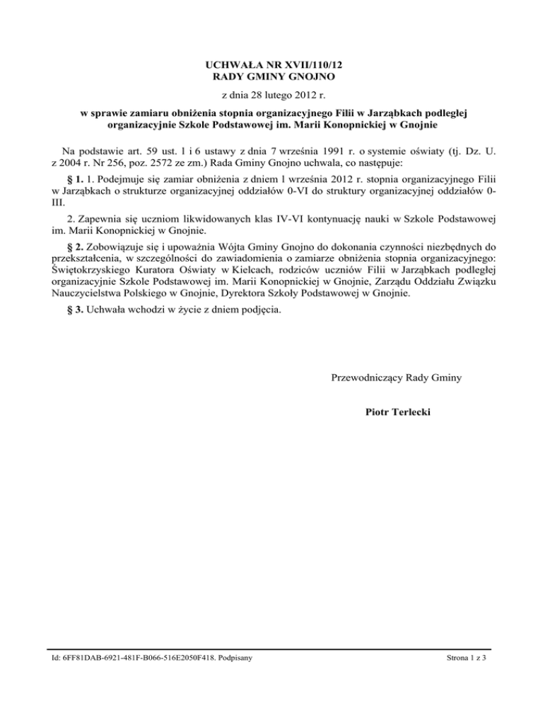 UCHWAŁA NR XVII/110/12 RADY GMINY GNOJNO z dnia 28 lutego 2012 r. w sprawie zamiaru obniżenia stopnia organizacyjnego Filii w Jarząbkach podległej organizacyjnie Szkole Podstawowej im. Marii Konopnickiej w Gnojnie Na podstawie art. 59 ust. l i 6 ustawy z dnia 7 września 1991 r. o systemie oświaty (tj. Dz. U. z 2004 r. Nr 256, poz. 2572 ze zm.) Rada Gminy Gnojno uchwala, co następuje: § 1. 1. Podejmuje się zamiar obniżenia z dniem l września 2012 r. stopnia organizacyjnego Filii w Jarząbkach o strukturze organizacyjnej oddziałów 0-VI do struktury organizacyjnej oddziałów 0III. 2. Zapewnia się uczniom likwidowanych klas IV-VI kontynuację nauki w Szkole Podstawowej im. Marii Konopnickiej w Gnojnie. § 2. Zobowiązuje się i upoważnia Wójta Gminy Gnojno do dokonania czynności niezbędnych do przekształcenia, w szczególności do zawiadomienia o zamiarze obniżenia stopnia organizacyjnego: Świętokrzyskiego Kuratora Oświaty w Kielcach, rodziców uczniów Filii w Jarząbkach podległej organizacyjnie Szkole Podstawowej im. Marii Konopnickiej w Gnojnie, Zarządu Oddziału Związku Nauczycielstwa Polskiego w Gnojnie, Dyrektora Szkoły Podstawowej w Gnojnie. § 3. Uchwała wchodzi w życie z dniem podjęcia. Przewodniczący Rady Gminy Piotr Terlecki Id: 6FF81DAB-6921-481F-B066-516E2050F418. Podpisany Strona 1 z 3 UZASADNIENIE Główną przyczyną przeprowadzenia zmian w sieci szkół podstawowych prowadzonych przez Gminę Gnojno jest konieczność racjonalizacji wydatków oświatowych wymuszona przez warunki demograficzne i sytuację finansową. Z tego powodu w roku 2011 przekształcono trzy szkoły podstawowe w punkty filialne Szkoły Podstawowej w Gnojnie. W tym roku zdecydowano się na kolejny etap dostosowujący sieć szkół do możliwości i potrzeb gminy, z uwzględnieniem czynników demograficznych i ekonomicznych. Ustawa o systemie oświaty w art. 61 ust. 2 stanowi, że szkoły obejmujące część klas szkoły podstawowej, w tym także szkoły filialne, mogą być tworzone w przypadkach uzasadnionych miejscowymi warunkami. Zgodnie z danymi zawartymi w sprawozdaniu SIO według stanu na dzień 30 września 2011 r. do Filii w Jarząbkach uczęszcza 38 uczniów klas I-VI, w tym: klasa I - 9, klasa II - 8, klasa III - 4, klasa IV - 9 , klasa V - 5, klasa VI - 3. Oddział przedszkolny liczy 8 dzieci. Nauka odbywa się w klasach łączonych. W następnych latach szkolnych liczba dzieci w obwodzie szkolnym nie ulegnie radykalnej zmianie. Koszty funkcjonowania szkoły znacznie przewyższają wysokość subwencji oświatowej, odpowiadającej liczbie uczniów uczęszczających do tej szkoły. Po dokonaniu przekształcenia, w roku szkolnym 2012/2013 w filii uczyć się będzie 23 uczniów w klasach I-III oraz 9 dzieci w oddziale przedszkolnym. Dowozem do Szkoły Podstawowej w Gnojnie objętych zostanie 18 dzieci z klas IV-VI. Warunki lokalowe w Szkole Podstawowej w Gnojnie są bardzo dobre. Budynek szkoły został zmodernizowany Szkoła dysponuje dobrze wyposażonymi salami lekcyjnymi, biblioteką, pracownią komputerową i salą gimnastyczną. Lekcje odbywają się na jedną zmianę. Włączenie oddziałów IV-VI z Filii w Jarząbkach nie spowoduje uruchomienia drugiej zmiany, a liczebność oddziałów przedstawiać się będzie następująco: klasa IV - 22, klasa V - 21, klasa VI - 22. Dowóz dzieci z klas IV-VI planuje się zorganizować w ten sposób, by - w miarę możliwości po zakończeniu lekcji i zajęć dodatkowych miały zapewniony powrót do domu. Uczniowie oczekujący na odjazd będą mieli zapewnioną opiekę w świetlicy szkolnej. Zajęcia świetlicowe mogą być prowadzone na świetlicy, w pracowni komputerowej, na placu zabaw lub na boisku szkolnym. W autobusie będzie zapewniona opieka. W Filii w Jarząbkach w roku szkolnym 2011/2012 zatrudnionych jest 7 nauczycieli realizujących łącznie 5,78 etatu, w tym 5 zatrudnionych na czas nieokreślony, 2 na czas określony. Po zmianie stopnia organizacyjnego szkoły zostanie zatrudnionych najwyżej 3 nauczycieli. Nauczyciele, którzy nie otrzymają propozycji dalszego zatrudnienia, dostaną wypowiedzenia stosunku pracy i należną sześciomiesięczną odprawę bądź przeniesienie na ich wniosek w stan nieczynny na okres 6 miesięcy. Zatrudnienie pracowników obsługi może również ulec zmniejszeniu. Ograniczenie stopnia organizacyjnego Filii w Jarząbkach do klas I-III wraz z oddziałem przedszkolnym jest kompromisem między możliwościami finansowymi, warunkami demograficznymi, a oczekiwaniami społecznymi. Z jednej strony pozwoli na bardziej racjonalne wykorzystanie środków publicznych i zmniejszenie dysproporcji pomiędzy ponoszonymi wydatkami a subwencją oświatową, z drugiej zaś strony będzie optymalne ze względów społecznych - pozostanie szkoła, w której najmłodsze dzieci nadal będą korzystać z edukacji w miejscu swego zamieszkania lub w niewielkiej od niego odległości. Zgodnie z art. 5c pkt 1 ustawy o systemie oświaty wyrażenie zamiaru przekształcenia szkoły należy do uprawnień rady gminy – w tym przypadku Rady Gminy Gnojno. Id: 6FF81DAB-6921-481F-B066-516E2050F418. Podpisany Strona 2 z 3 Podjęcie uchwały wpłynie na zracjonalizowanie wydatków finansowych ponoszonych na oświatę i tym samym pozwoli na lepsze wydatkowanie zaoszczędzonych środków. np. na poprawienie wyposażenia dydaktycznego szkół. W związku z powyższym podjęcie niniejszej uchwały należy uznać za zasadne. Id: 6FF81DAB-6921-481F-B066-516E2050F418. Podpisany Strona 3 z 3