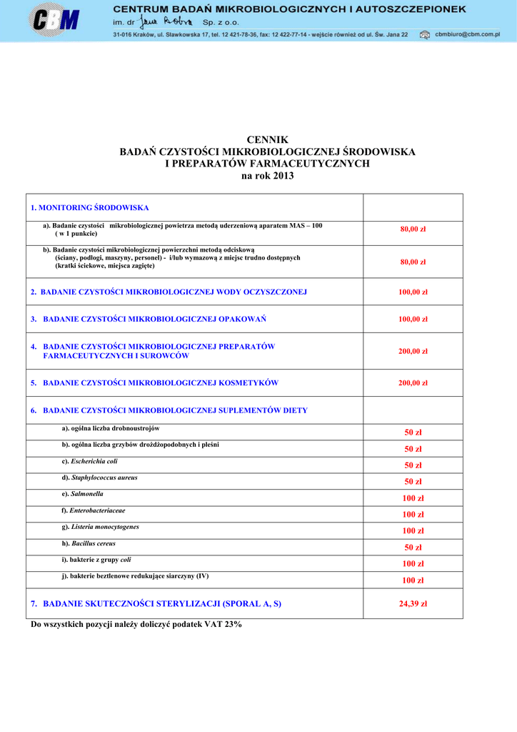 CENNIK BADAŃ CZYSTOŚCI MIKROBIOLOGICZNEJ ŚRODOWISKA I PREPARATÓW FARMACEUTYCZNYCH na rok 2013 1. MONITORING ŚRODOWISKA a). Badanie czystości mikrobiologicznej powietrza metodą uderzeniową aparatem MAS – 100 ( w 1 punkcie) b). Badanie czystości mikrobiologicznej powierzchni metodą odciskową (ściany, podłogi, maszyny, personel) - i/lub wymazową z miejsc trudno dostępnych (kratki ściekowe, miejsca zagięte) 80,00 zł 80,00 zł 2. BADANIE CZYSTOŚCI MIKROBIOLOGICZNEJ WODY OCZYSZCZONEJ 100,00 zł 3. BADANIE CZYSTOŚCI MIKROBIOLOGICZNEJ OPAKOWAŃ 100,00 zł 4. BADANIE CZYSTOŚCI MIKROBIOLOGICZNEJ PREPARATÓW FARMACEUTYCZNYCH I SUROWCÓW 200,00 zł 5. BADANIE CZYSTOŚCI MIKROBIOLOGICZNEJ KOSMETYKÓW 200,00 zł 6. BADANIE CZYSTOŚCI MIKROBIOLOGICZNEJ SUPLEMENTÓW DIETY a). ogólna liczba drobnoustrojów b). ogólna liczba grzybów drożdżopodobnych i pleśni c). Escherichia coli d). Staphylococcus aureus e). Salmonella f). Enterobacteriaceae g). Listeria monocytogenes h). Bacillus cereus i). bakterie z grupy coli j). bakterie beztlenowe redukujące siarczyny (IV) 7. BADANIE SKUTECZNOŚCI STERYLIZACJI (SPORAL A, S) Do wszystkich pozycji należy doliczyć podatek VAT 23% 50 zł 50 zł 50 zł 50 zł 100 zł 100 zł 100 zł 50 zł 100 zł 100 zł 24,39 zł