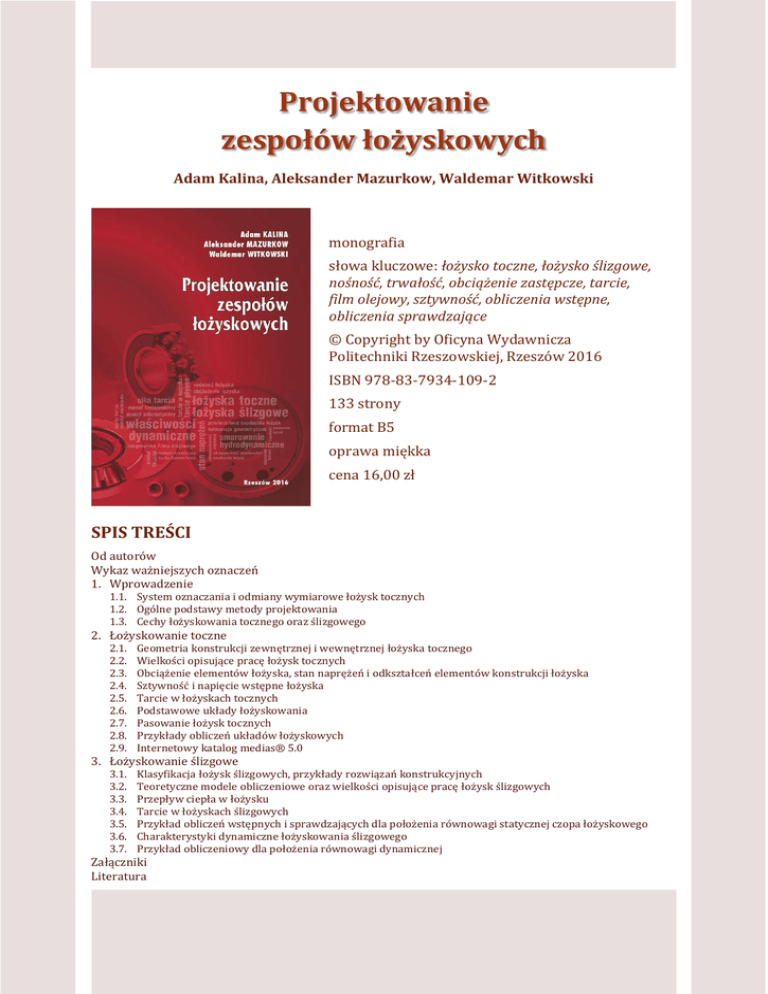 Projektowanie zespołów łożyskowych Adam Kalina, Aleksander Mazurkow, Waldemar Witkowski monografia słowa kluczowe: łożysko toczne, łożysko ślizgowe, nośność, trwałość, obciążenie zastępcze, tarcie, film olejowy, sztywność, obliczenia wstępne, obliczenia sprawdzające © Copyright by Oficyna Wydawnicza Politechniki Rzeszowskiej, Rzeszów 2016 ISBN 978-83-7934-109-2 133 strony format B5 oprawa miękka cena 16,00 zł SPIS TREŚCI Od autorów Wykaz ważniejszych oznaczeń 1. Wprowadzenie 1.1. System oznaczania i odmiany wymiarowe łożysk tocznych 1.2. Ogólne podstawy metody projektowania 1.3. Cechy łożyskowania tocznego oraz ślizgowego 2. Łożyskowanie toczne 2.1. 2.2. 2.3. 2.4. 2.5. 2.6. 2.7. 2.8. 2.9. Geometria konstrukcji zewnętrznej i wewnętrznej łożyska tocznego Wielkości opisujące pracę łożysk tocznych Obciążenie elementów łożyska, stan naprężeń i odkształceń elementów konstrukcji łożyska Sztywność i napięcie wstępne łożyska Tarcie w łożyskach tocznych Podstawowe układy łożyskowania Pasowanie łożysk tocznych Przykłady obliczeń układów łożyskowych Internetowy katalog medias® 5.0 3. Łożyskowanie ślizgowe 3.1. 3.2. 3.3. 3.4. 3.5. 3.6. 3.7. Klasyfikacja łożysk ślizgowych, przykłady rozwiązań konstrukcyjnych Teoretyczne modele obliczeniowe oraz wielkości opisujące pracę łożysk ślizgowych Przepływ ciepła w łożysku Tarcie w łożyskach ślizgowych Przykład obliczeń wstępnych i sprawdzających dla położenia równowagi statycznej czopa łożyskowego Charakterystyki dynamiczne łożyskowania ślizgowego Przykład obliczeniowy dla położenia równowagi dynamicznej Załączniki Literatura