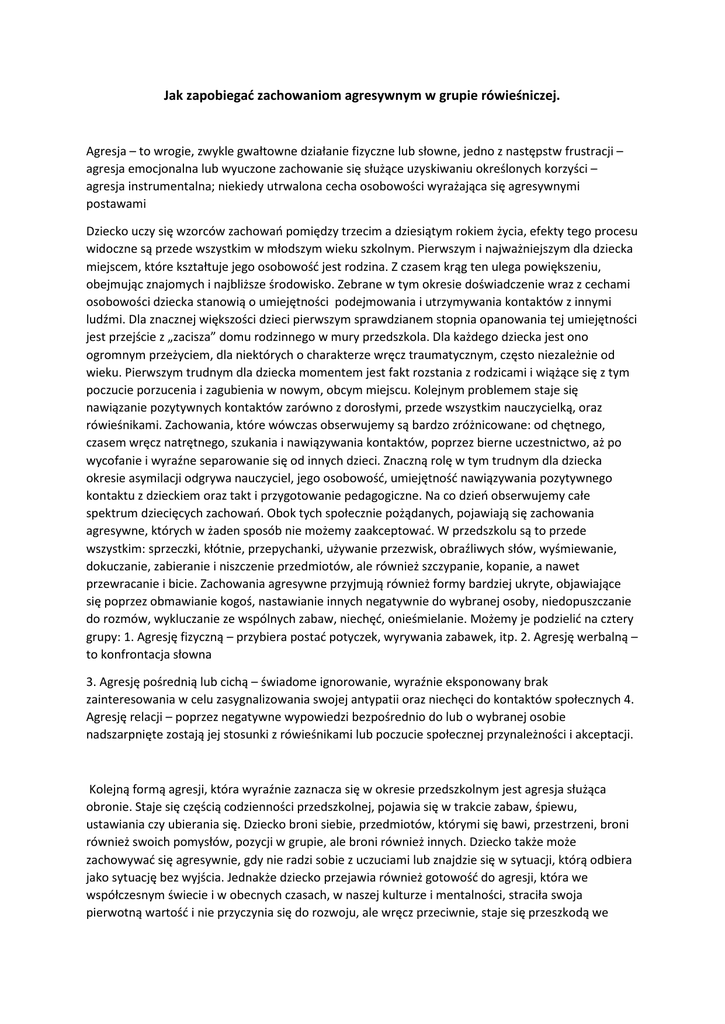 Jak zapobiegać zachowaniom agresywnym w grupie rówieśniczej. Agresja – to wrogie, zwykle gwałtowne działanie fizyczne lub słowne, jedno z następstw frustracji – agresja emocjonalna lub wyuczone zachowanie się służące uzyskiwaniu określonych korzyści – agresja instrumentalna; niekiedy utrwalona cecha osobowości wyrażająca się agresywnymi postawami Dziecko uczy się wzorców zachowań pomiędzy trzecim a dziesiątym rokiem życia, efekty tego procesu widoczne są przede wszystkim w młodszym wieku szkolnym. Pierwszym i najważniejszym dla dziecka miejscem, które kształtuje jego osobowość jest rodzina. Z czasem krąg ten ulega powiększeniu, obejmując znajomych i najbliższe środowisko. Zebrane w tym okresie doświadczenie wraz z cechami osobowości dziecka stanowią o umiejętności podejmowania i utrzymywania kontaktów z innymi ludźmi. Dla znacznej większości dzieci pierwszym sprawdzianem stopnia opanowania tej umiejętności jest przejście z „zacisza” domu rodzinnego w mury przedszkola. Dla każdego dziecka jest ono ogromnym przeżyciem, dla niektórych o charakterze wręcz traumatycznym, często niezależnie od wieku. Pierwszym trudnym dla dziecka momentem jest fakt rozstania z rodzicami i wiążące się z tym poczucie porzucenia i zagubienia w nowym, obcym miejscu. Kolejnym problemem staje się nawiązanie pozytywnych kontaktów zarówno z dorosłymi, przede wszystkim nauczycielką, oraz rówieśnikami. Zachowania, które wówczas obserwujemy są bardzo zróżnicowane: od chętnego, czasem wręcz natrętnego, szukania i nawiązywania kontaktów, poprzez bierne uczestnictwo, aż po wycofanie i wyraźne separowanie się od innych dzieci. Znaczną rolę w tym trudnym dla dziecka okresie asymilacji odgrywa nauczyciel, jego osobowość, umiejętność nawiązywania pozytywnego kontaktu z dzieckiem oraz takt i przygotowanie pedagogiczne. Na co dzień obserwujemy całe spektrum dziecięcych zachowań. Obok tych społecznie pożądanych, pojawiają się zachowania agresywne, których w żaden sposób nie możemy zaakceptować. W przedszkolu są to przede wszystkim: sprzeczki, kłótnie, przepychanki, używanie przezwisk, obraźliwych słów, wyśmiewanie, dokuczanie, zabieranie i niszczenie przedmiotów, ale również szczypanie, kopanie, a nawet przewracanie i bicie. Zachowania agresywne przyjmują również formy bardziej ukryte, objawiające się poprzez obmawianie kogoś, nastawianie innych negatywnie do wybranej osoby, niedopuszczanie do rozmów, wykluczanie ze wspólnych zabaw, niechęć, onieśmielanie. Możemy je podzielić na cztery grupy: 1. Agresję fizyczną – przybiera postać potyczek, wyrywania zabawek, itp. 2. Agresję werbalną – to konfrontacja słowna 3. Agresję pośrednią lub cichą – świadome ignorowanie, wyraźnie eksponowany brak zainteresowania w celu zasygnalizowania swojej antypatii oraz niechęci do kontaktów społecznych 4. Agresję relacji – poprzez negatywne wypowiedzi bezpośrednio do lub o wybranej osobie nadszarpnięte zostają jej stosunki z rówieśnikami lub poczucie społecznej przynależności i akceptacji. Kolejną formą agresji, która wyraźnie zaznacza się w okresie przedszkolnym jest agresja służąca obronie. Staje się częścią codzienności przedszkolnej, pojawia się w trakcie zabaw, śpiewu, ustawiania czy ubierania się. Dziecko broni siebie, przedmiotów, którymi się bawi, przestrzeni, broni również swoich pomysłów, pozycji w grupie, ale broni również innych. Dziecko także może zachowywać się agresywnie, gdy nie radzi sobie z uczuciami lub znajdzie się w sytuacji, którą odbiera jako sytuację bez wyjścia. Jednakże dziecko przejawia również gotowość do agresji, która we współczesnym świecie i w obecnych czasach, w naszej kulturze i mentalności, straciła swoja pierwotną wartość i nie przyczynia się do rozwoju, ale wręcz przeciwnie, staje się przeszkodą we współżyciu między ludźmi. Objawia się ona w tworzeniu grup, świadomym odgraniczaniu się od innych, źle pojętej solidarności wyrażającej się w agresywnym wychodzeniu poza obręb swojej grupy, w postawie „ze swoimi przeciw obcym”. Agresja grupowa może się objawiać na dwa sposoby: 1. Jako agresja jednej grupy przeciw innej grupie, 2. Jako agresja grupowa wobec jednostki – wówczas, gdy dochodzi do aktów przemocy przez kilku członków grupy wobec wybranego dziecka, które staje się „kozłem ofiarnym”. Na podstawie systematycznie prowadzonej obserwacji zabaw, technik dramowych i rozmów z dziećmi można stwierdzić, iż większe skłonności do rozwiązywania konfliktów poprzez agresję fizyczną wykazują chłopcy. Dziewczynki do postawienia na swoim chętniej posługują się agresją słowną, agresja pośrednią oraz w znacznie mniejszym stopniu agresją fizyczną. Zarówno w przypadku dziewczyn, jak i chłopców możemy mieć do czynienia z agresją o charakterze incydentalnym, ale również z zachowaniami, które mogą trwać wiele tygodni i miesięcy, póki się ich w porę nie rozpozna. Tę negatywną formę agresji trzeba szybko rozpoznawać i nauczyć przezwyciężać już w okresie przedszkolnym. Kolejnym czynnikiem jest telewizja. Na wpływ mediów narażone są już małe dzieci. Odbywa się to na dwa sposoby: bierny oraz czynny. O odbiorze biernym mówimy, gdy do dziecka dociera przekaz nie adresowany bezpośrednio do niego (np. kiedy matka jednocześnie zajmuje się dzieckiem i ogląda telewizję), a mimo to oddziałujący na dziecko. Odbiór czynny jest działaniem przemyślanym i ma na celu przyciągnięcie uwagi dziecka. Istotnym czynnikiem w absorbowaniu uwagi małych dzieci jest zrozumiałość przekazu. Według przeprowadzonych badań dzieci zaczynają świadomie odbierać telewizję w wieku 12 miesięcy i są w stanie naśladować to, co w niej widzą , ale nie traktują telewizji jako części świata rzeczywistego. Zmiana w odbieraniu świata kreowanego prz