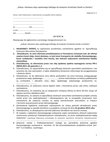 „Zakup i dostawa oleju opałowego lekkiego do budynku Grodziska Owidz w Owidzu” Załącznik nr 1 Nazwa i adres Wykonawcy / wykonawców w przypadku oferty wspólnej ……………………………….……….……….…………. ……………………………….………………….………… ……………………………………………………..……… tel. ……………………..…. faks ……………………… e-mail ……………………………………………………. NIP …………………REGON ………………………… OFERTA Nawiązując do ogłoszenia o przetargu nieograniczonym na: „Zakup i dostawa oleju opałowego lekkiego do budynku Grodziska Owidz w Owidzu” 1. SKŁADAM/Y OFERTĘ na wykonanie przedmiotu zamówienia zgodnie ze Specyfikacją Istotnych Warunków Zamówienia. 2. Oświadczam, że cena ofertowa przedstawiona w Formularzu cenowym (zał. do oferty) zawiera koszt oleju, koszt dostawy, w tym koszt transportu do siedziby Zamawiającego, koszt rozładunku i wszelkie inne koszty, bez których wykonanie zamówienia byłoby niemożliwe. 3. Oświadczamy, że oferowany przez nas olej opałowy spełnia wymagania normy PN-C 96024:2011 dla gatunku L-1. 4. Oświadczamy, że zapoznaliśmy się ze specyfikacją istotnych warunków zamówienia i nie wnosimy do niej zastrzeżeń, a także zdobyliśmy konieczne informacje do przygotowania i złożenia oferty. 5. Oświadczam, że do obliczenia ceny oferty posłużyłem się cena hurtową następującego producenta oleju opałowego ………………………., strona internetowa na której publikowane są archiwalne i aktualne ceny oleju opałowego wskazanego producenta to: ………………………………… . 6. Oświadczamy, że wyliczony narzut będzie stały i niezmienny przez cały okres realizacji zamówienia. 7. Oświadczamy, że uważamy się za związanych niniejszą ofertą na okres 30 dni, licząc od upływu terminu składania ofert. 8. Oświadczamy, że zawarty w specyfikacji istotnych warunków zamówienia projekt umowy został przez nas zaakceptowany i zobowiązujemy się, w przypadku przyznania nam zamówienia do zawarcia umowy na wyżej wymienionych warunkach, w miejscu i terminie wyznaczonym przez Zamawiającego. 5. Zamówienie będziemy realizować sukcesywnie (w miarę potrzeb określonych przez Zamawiającego w sposób określony w projekcie umowy) do dnia 31 grudnia 2014 roku. 6. Oświadczamy, że akceptujemy warunki płatności określone we wzorze umowy. 7. W związku z żądaniem Zamawiającego wskazania części zamówienia, których wykonanie zamierzamy powierzyć Podwykonawcom oświadczamy, że przez podwykonawców będą wykonane: (wypełniają Wykonawcy przewidujący do wykonania zamówienia zatrudnienie Podwykonawców). ……………………………………………………………………………………….………………………………………………… 8. Zawarcie umów z Podwykonawcami nastąpi po uprzedniej pisemnej zgodzie Zamawiającego, uzyskanej w terminie 14 dni od przedstawienia projektów umów (art. 647 1 § 2 Kodeksu cywilnego). 1 „Zakup i dostawa oleju opałowego lekkiego do budynku Grodziska Owidz w Owidzu” 9. Oświadczamy, że podmiotem uprawnionym do wystawienia faktur i otrzymania wynagrodzenia jest : ……………………………. ………………………………………………………………….. 10. Wykonawca przedstawił ofertę na ………………….. kolejno ponumerowanych stronach. (Dotyczy wykonawców którzy ubiegają się o zamówienie wspólnie) …………………………………………….. (miejscowość, data) ……………………………………………………… podpis osoby (osób) uprawnionej (-ych) do reprezentowania wykonawcy ………………………………………………. (pieczęć firmowa) Informacja dla wykonawcy: Formularz oferty musi być podpisany przez osobę lub osoby uprawnione do reprezentowania firmy i przedłożony wraz z dokumentem (-ami) potwierdzającymi prawo do reprezentacji wykonawcy przez osobę podpisującą ofertę. 2 „Zakup i dostawa oleju opałowego lekkiego do budynku Grodziska Owidz w Owidzu” Załącznik do oferty FORMULARZ CEN OW Y (pieczęć Wykonawcy/Wykonawców) „Zakup i dostawa oleju opałowego lekkiego do budynku Grodziska Owidz w Owidzu” Wyliczenie współczynnika narzutu WYKONAWCY Lp Nazwa elementu j.m. Cena jednostkowa netto oleju opałowego Wykonawcy w dniu 1 11.09.2013 r. = C dost. pocz. Wartość w zł* zł/l (cena ofertowa do przeniesienia obliczenia wartości ofertowej) Cena jednostkowa netto oleju opałowego hurtowa określona przez 2 producenta w dniu 11.09.2013 r. = C prod. pocz. zł/l Wiersz 1/wiersz 2 = Współczynnik narzutu dostawcy oleju opałowego ** W dostawcy = C dost. pocz / C prod. pocz 3 - Wyliczenie wartości ofertowej Lp Nazwa elementu 1 Dostawy oleju opałowego lekkiego. jm ilość l … cena jedn. netto zł/jm*** Razem wartość netto zł Podatek VAT 23% zł Razem wartość ofertowa dostaw brutto zł wartość netto zł* __________________ dnia __ __ 2013 roku * ceny należy podawać z dokładnością do dwóch miejsc po przecinku ** współczynnik narzutu należy obliczyć z dokładnością do czterech miejsc po przecinku *** cena przyjęta do obliczenia wartości ofertowej ma być równa cenie jednostkowej netto Wykonawcy z poz. 1 tabeli „wyliczenia współczynnika narzutu” ……………………………………………………… podpis osoby(osób) uprawnionej(ych) do reprezentowania wykonawcy 3 „Zakup i dostawa oleju opałowego lekkiego do budynku Grodziska Owidz w Owidzu” Załącznik nr 2 ………………………………… (miejscowość i data) ……………………………………… Pieczęć wykonawcy Stosownie do treści art.44 w związku z art. 22 ust. 1 pkt. 1-4 ustawy z dnia 29 stycznia 2004r. Prawo zamówień Publicznych (Dz.U. z 2010 r. Nr 1