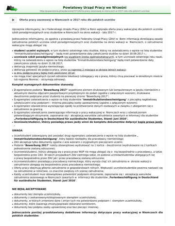 Powiatowy Urząd Pracy we Wrześni http://pupwrzesnia.pl/wydarzenie/217/oferta-pracy-sezonowej-w-niemczech-w-2017-roku-dla-polskich-uczniow Oferta pracy sezonowej w Niemczech w 2017 roku dla polskich uczniów Uprzejmie informujemy, że z Federalnego Urzędu Pracy (ZAV) w Bonn wpłynęła oferta pracy wakacyjnej dla polskich uczniów szkół ponadgimnazjalnych oraz studentów w Niemczech na okres wakacji – lato 2017 r. Jednocześnie informujemy, że zgodnie z przesłaną przez Federalny Urząd Pracy (ZAV) w Bonn informacją określającą zasady zatrudnienia polskich uczniów szkół ponadgimnazjalnych oraz studentów na okres wakacji w Niemczech, o zatrudnienie wakacyjne mogą ubiegać się: ● ● ● ● ● ● studenci uczelni wyższych, w tym studenci ostatniego roku studiów, którzy na zaświadczeniu o wpisie na listę studentów "Immatrikulationsbescheinigung" – będą mieli potwierdzenie daty zakończenia studiów na dzień 30.09.2017 r.; uczniowie szkół ponadgimnazjalnych (za wyjątkiem liceów ogólnokształcących), w tym uczniowie ostatniego roku nauki, którzy na zaświadczeniu o wpisie na listę studentów "Immatrikulationsbescheinigung" będą mieli potwierdzenie daty zakończenia szkoły na dzień 31.08.2017; deklarują znajomość języka niemieckiego; deklarują gotowość do podjęcia pracy, przez co najmniej 2 miesiące w okresie letnich wakacji; w dniu podjęcia pracy będą mieli ukończone 18 lat; nie mogą mieć specjalnych życzeń odnośnie lokalizacji (ubiegający się o pracę, którzy chcą pracować w określonym mieście lub regionie Niemiec – otrzymają odmowę). Komplet wymaganych dokumentów stanowią: ● ● ● ● ● 2 egzemplarze podania "Bewerbung 2017" wypełnione pismem drukowanym lub komputerowym w języku niemieckim z aktualnymi dwoma zdjęciami paszportowymi przyklejonymi do podań (zgodne z załączonym wzorem), drukowane dwustronnie podpisane przez studenta na pierwszej stronie "Bewerbung 2017"; 1 egzemplarz zaświadczenia o wpisie na listę studentów "Immatrikulationsbescheinigung" z pieczątką nagłówkową szkoły/uczelni oraz podpisem i imienną pieczątką osoby upoważnionej (zgodne z załączonym wzorem); 1 egzemplarz oświadczenia wyrażającego zgodę na przetwarzanie danych osobowych w związku z ubieganiem się o zatrudnienie za granicą; 1 egzemplarz oświadczenia zawierającego informacje o pracy wakacyjnej w Niemczech wraz z oświadczeniem potwierdzającym otrzymanie, zapoznanie się i akceptację warunków zatrudnienia zawartych w informacji dla studentów „Ferienbeschäftigung in Deutschland für ausländische Studenten, Stand: Juni 2016". Uczniowie/studenci, którzy posiadają prawo jazdy winni do kompletu dokumentów dołączyć kopię prawa jazdy . UWAGA: ● ● ● ● ● ● ● Uczeń/student zobowiązany jest posiadać drugi egzemplarz zaświadczenia o wpisie na listę studentów „ Immatrikulationsbescheinigung", który będzie niezbędny dla pracodawcy niemieckiego; ZAV akceptuje tylko dokumenty zgodne z w/w wzorami z oryginalnymi pieczęciami uczelni; Podanie "Bewerbung 2017" należy obowiązkowo wydrukować na 1 kartce - dwustronnie (wydrukowane na 2 kartkach jednostronnie zostaną odrzucone); Uczniowie/studenci, którzy ubiegają się o pracę przez WUP nie mogą ubiegać się o nią bezpośrednio u pracodawcy, a także bezpośrednio przez ZAV. W takich przypadkach ZAV zastrzega sobie, że podania uczniów/studentów ubiegających się o pracę bezpośrednio przez ZAV jak i przez pracodawcę zostaną odrzucone; Uczniowie/studenci posiadający pracodawcę niemieckiego, który wyraża chęć ich zatrudnienia w okresie wakacji o zatrudnienie ubiegają się bezpośrednio przez pracodawcę niemieckiego; Oferty pracy obejmują głównie zatrudnienie w gospodarstwach rolnych. Większość uczniów/studentów powinna nastawić się na zatrudnienie w rolnictwie, co znacznie zwiększy ich szansę zatrudnienia; Każdy uczeń/student musi obowiązkowo potwierdzić podpisem otrzymanie, zapoznanie się i akceptację warunków zatrudnienia sezonowego w Niemczech zawartych w informacji dla studentów „Ferienbeschäftigung in Deutschland für ausländische Studenten, Stand: Juni 2016". NIE BĘDĄ AKCEPTOWANE: ● ● ● ● ● dokumenty bez stempla uczelni/szkoły, dokumenty z zeskanowanym/skopiowanym stemplem uczelni/szkoły, dokumenty, w których zmieniono dane i zmian tych nie potwierdzono podpisem i stemplem uczelni/szkoły, dokumenty, które zawierają zmiany/poprawki dokonane korektorem, dokumenty bez podpisu osoby uprawnionej oraz bez pieczęci imiennej. Jednocześnie poniżej przedstawiamy dodatkowe informacje dotyczące pracy wakacyjnej w Niemczech dla polskich studentów: 1. Oferowana praca wakacyjna to najczęściej prace pomocnicze w rolnictwie, przy sprzątaniu budynków, w hotelarstwie i gastronomii, w sieci gastronomicznej, jak również w niewielkim stopniu w przemyśle. 2. Czas pracy, wynagrodzenie oraz pozostałe warunki pracy odpowiadają uregulowaniom taryfowym lub normom przyjętym na danym obszarze. Wynagrodzenie płatne jest przeważnie na koniec miesiąca, dlatego w pierwszych tygodniach uczniowie/studenci powinni mieć wystarczającą ilość pieniędzy na utrzymanie. 3. Uczeń/student powinien zabrać drugi egzemplarz zaświadczenia o wpisie na listę studentów dla pracodawcy, gdyż będzie on niezbędny przy zatrudnieniu i naliczeniu wynagrodzenia. 4. Po przyjeździe do Niemiec uczeń/student ma obowiązek zameldowania się w ciągu 8 dni w administracji gminy lub miasta. 5. Ponieważ uczniowie/studenci nie mają w Niemczech ustawowego ubezpieczenia zdrowotnego, powinni koniecznie zawrzeć umowę ubezpieczeniową w Polsce, w ramach której pokryte zostaną koszty ewentualnej choroby. 6. Koszty dojazdu do miejsca pracy ponosi uczeń/student. Pracodawca nie ma obowiązku zapewnienia uczniowi/studentowi zakwaterowania, ale często pomaga w jego znalezieniu. W branżach takich jak roln