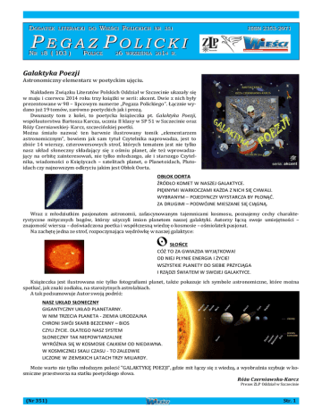 NR 17 (85) PEGAZ POLICKI 16 grudnia 2013 St r.1 D O D A T E K DO OD DA AT TE EK K LLLIIIT T E R A C K D O TE ER RA AC CK KIII D DO O W O C K C H WIIIEEEŚŚŚCCCIII PPO OLLLIIIC CK KIIIC CH H N N R 3 5 1 NR R 3 35 51 1 IIIS S S N 2 3 5 3 2 9 7 1 SS SN N2 23 35 53 3---2 29 97 71 1 PEGAZ POLICKI N NRRR 11188 (( 110033 )) PPO O C E OLLLIIIC CE E 2 2 W R Z E Ś N A 2 0 26 6W WR RZ ZE EŚ ŚN NIIIA A 2 20 01 1444 RRR... Galaktyka Poezji Astronomiczny elementarz w poetyckim ujęciu. Nakładem Związku Literatów Polskich Oddział w Szczecinie ukazały się w maju i czerwcu 2014 roku trzy książki w serii: akcent. Dwie z nich były prezentowane w 98 – lipcowym numerze „Pegaza Polickiego”. Łącznie wydano już 19 tomów, zarówno poetyckich jak i prozą. Dwunasty tom z kolei, to poetycka książeczka pt. Galaktyka Poezji, współautorstwa Bartosza Karcza, ucznia II klasy w SP 51 w Szczecinie oraz Róży Czerniawskiej- Karcz, szczecińskiej poetki. Można śmiało nazwać ten barwnie ilustrowany tomik „elementarzem astronomicznym”, bowiem jak sam tytuł Czytelnika naprowadza, jest to zbiór 14 wierszy, czterowersowych strof, których tematem jest nie tylko nasz układ słoneczny składający się z ośmiu planet, ale też wprowadzający na orbitę zainteresowań, nie tylko młodszego, ale i starszego Czytelnika, wiadomości o Księżycach – satelitach planet, o Planetoidach, Plutoidach czy najnowszym odkryciu jakim jest Obłok Oorta. OBŁOK OORTA ŹRÓDŁO KOMET W NASZEJ GALAKTYCE. PIĘKNYMI WARKOCZAMI KAŻDA Z NICH SIĘ CHWALI. WYBRANYM – POJEDYNCZY WYSTARCZA BY PŁONĄĆ. ZA DRUGIMI – PODWÓJNE MIESZANE SIĘ CIĄGNĄ. Wraz z młodziutkim pasjonatem astronomii, zafascynowanym tajemnicami kosmosu, poznajemy cechy charakterystyczne mitycznych bogów, którzy użyczyli imion planetom naszej galaktyki. Autorzy łączą swoje umiejętności – znajomość wiersza – doświadczona poetka i współczesną wiedzę o kosmosie – ośmiolatek pasjonat. Na zachętę jedna ze strof, rozpoczynająca wędrówkę w naszej galaktyce: SŁOŃCE CÓŻ TO ZA GWIAZDA WYJĄTKOWA! OD NIEJ PŁYNIE ENERGIA I ŻYCIE! WSZYSTKIE PLANETY DO SIEBIE PRZYCIĄGA I RZĄDZI ŚWIATEM W SWOJEJ GALAKTYCE. Książeczka jest ilustrowana nie tylko fotografiami planet, także pokazuje ich symbole astronomiczne, które można spotkać, jak znaki zodiaku, na starożytnych astrolabiach. A tak podsumowuje Autor swoją podróż: NASZ UKŁAD SŁONECZNY GIGANTYCZNY UKŁAD PLANETARNY. W NIM TRZECIA PLANETA - ZIEMIA URODZAJNA CHRONI SWÓJ SKARB BEZCENNY – BIOS CZYLI ŻYCIE. DLATEGO NASZ SYSTEM SŁONECZNY TAK NIEPOWTARZALNIE WYRÓŻNIA SIĘ W KOSMOSIE CAŁKIEM OD NIEDAWNA. W KOSMICZNEJ SKALI CZASU - TO ZALEDWIE LICZONE W ZIEMSKICH LATACH TRZY MILIARDY. Może warto nie tylko młodszym polecić "GALAKTYKĘ POEZJI", gdzie mit łączy się z wiedzą, a wyobraźnia szybuje w kosmiczne przestworza na statku poetyckiego słowa. Róża Czerniawska-Karcz Prezes ZLP Oddział w Szczecinie (Nr 351) Str. 1 26 września 2014 PEGAZ POLICKI Nr 18 (103) St r.2 Poezja czytana podczas spotkania w polickim Atelier, w dniu 22 sierpnia 2014 r. Stephen Crane Z j. ang. przełożył Janusz Krzymiński Robotnicy Na szczycie góry rzesza robotników wymurowała ogromną kulę. Potem zeszli w dolinę i podziwiali swoje dzieło. „Jest wielkie” – mówili, bo kochali je. Ale nagle ono się poruszyło i spadając z impetem wszystkich zmiażdżyło. Tylko nieliczni zdążyli coś krzyknąć. Stephen Crane Z j. ang. przełożył Janusz Krzymiński Człowiek w pościgu Kiedyś zobaczyłem człowieka usiłującego dosięgnąć horyzont. Za każdym nawrotem przyspieszał swego biegu. A kiedy znalazł się w pobliżu mnie krzyknąłem: „To ci się nigdy nie uda!” A on, nie zwalniając odkrzyknął: „Ty też kłamiesz!” Zbigniew Szyrwiel Rozkołysz kajak pośrodku rzeki Dali ci kajak bez przewodnika. Nie umiesz pływać, a wody tyle. I jeszcze pustka. Nie wiesz co robić. Więc czemu chciałeś być jako Ikar… Ty, co to pióro wziął nieopatrznie… Nie wiesz jak zacząć, ani jak skończyć. Opisz… samotność… że tak się boisz… Że twoja miłość… że to cię boli… Rozkołysz serce na wszystko inne. I zapisz wszystko, tak jak to czujesz. Swoje emocje podobne innym, Co nie potrafią powiedzieć o tym. Rozkołysz kajak pośrodku rzeki. Rozkołysz serce na wszystko inne… Krystyna Rodzewicz Kubizm Helena Pilarska Moja struna Patrzę na obraz dużo w nim granatu trochę niebieskiego i czerwonego i tylko kilka czarnych kresek nastrojona tak by żaden dźwięk nie zabrzmiał fałszywie by niczym ani słowem ani gestem nie zadać bólu. Czerwony kwadrat u dołu jakby pękał nieregularnie nierówno i nie całkiem śmiało pociągając jednak za sobą rozłam dużo większy Ta szczelina powstała w granacie niebiesko się mieni Radością? Wolnością? Rozstanie też pozostawia bliznę która powoli zarasta By nie pękła – nie naciągam więcej. Edyta Rauhut Zimna suka Anielica przyszła na świat. Słów nie truła jadem, nie szczędziła uśmiechów, ufała, miłowała bliźnich. choć nie zawsze błękitem Zesłano plagi egipskie, jeźdźców Apokalipsy na żniwa. Cios prosto w twarz. Nadstaw drugi policzek! Anna Jakubczak Bajki Skrzydła poczerniały, Hiob dał Bogu zwycięstwo, ona ofiarowała porażkę. Oko za oko, ząb za ząb… Zostaw na tej stronie, wiesz jak bardzo uwielbiam łabędzie*. Spójrz one mają korony. O! A ten przemienił się z brzydkiego kaczątka.* Powiedz, czy to prawda, że piękno istnieje tylko w bajkach? Chciałabym je kiedyś zobaczyć. Mamuś, a czemu nazywasz mnie Calineczką?* Czy też jestem taka krucha? Proszę zostaw na tej stronie. I jest też mała syrenka,* mogłabym pływać z nią niedaleko raf. Mamuś, dlaczego kończysz już czytać? Czy nie za wcześnie… 26 sierpnia 2013 r. * Tytuły lub odniesienia do bajek H. C. Andersena Anna Jakubczak Groteska w truchcie gubię ogonek a w kłosach str