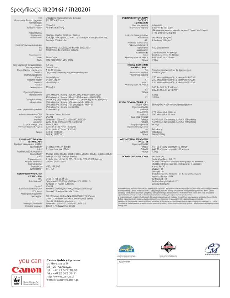 Specyfikacja iR2016i / iR2020i Typ Maksymalny format oryginału Formaty kopii Kaseta Podajnik ręczny Rozdzielczość Kopiowanie Drukowanie Prędkość kopiowania/druku A4 A3 Powiększenie Zoom Stały Czas uzyskania pierwszej kopii Czas nagrzewania Długość pracy kopiowania Dupleks Gramatura papieru Kaseta Podajnik ręczny Dupleks Kaseta Uniwersalna Pojemność papieru Standardowo Podajnik ręczny Opcjonalnie Maks. pojemność papieru Jednostka centralna CPU Pamięć Interfejs Zasilanie Zużycie energii (W) Wymiary (szer./dł./wys.) Waga FUNKCJA WYSYŁANIA (STANDARD) Prędkość skanowania z DADF Czarno-biały Kolor Rozdzielczość skanowania Czarno-biały Kolor Przeznaczenie Książka adresowa Format plików Pojedynczy Wielokrotny KONTROLER WYDRUKU (STANDARD) PDL Rozdzielczość Pamięć Jednostka centralna CPU PCL Fonts Obsługiwane systemy operacyjne Interfejs (Standard) Protokół sieciowy Urządzenie stacjonarne typu Desktop A3, 297 x 432 mm A5 do A3 A5R do A3, Koperty 600dpi x 600dpi, 1200dpi x 600dpi 1200dpi x 600dpi (PCL, UFRII LT), 1200dpi x 1200dpi (UFRII LT), Gradacja 256 kolorów 16 str./min. (iR2016i), 20 str./min. (iR2020i) 10 str./min. dla iR2016i / iR2020i 50 do 200% 50%, 70%,100%,141%, 200% 7,9 sek. Około 25 sek. 1 do 99 arkuszy Opcjonalny automatyczny jednoprzebiegowy 64 do 90g/m2 64 do 128g/m2 64 do 90g/m2 A5 do A3 250 arkuszy x 2 kasety (80g/m2, 500 arkuszy) dla iR2020i 250 arkuszy x 1 kasety (80g/m2, 250 arkuszy) dla iR2016i 80 arkuszy (80g/m2) dla A5R do A4, 50 arkuszy dla A3 (80g/m2) 250 arkuszy x 2 kasety (500 arkuszy) dla iR2020i 250 arkuszy x 3 kasety (750 arkuszy) dla iR2016i 250 arkuszy x 1 kaseta dla iR2016i 1.080 arkuszy Procesor Canon, 192MHz 256MB Ethernet (100Base-TX/10Base-T), USB2.0 220V AC do 240V AC +–10% (50/60Hz) Maks. 1,6kW 622 x 668 x 757 mm (iR2020i) 622 x 668 x 672 mm (iR2016i) 52.0 kg (iR2020i) 46.2 kg (iR2016i) 24 obraz./min. A4 300dpi 8 obraz./min. A4 300dpi 150dpi, 200 x 100dpi, 200dpi, 200 x 400dpi, 300dpi, 400dpi, 600dpi 100dpi, 150dpi, 200dpi, 300dpi E-Mail / Internet FAX (SMTP), PC (SMB, FTP), iWDM Gateway Lokalna (Maks. 500) PODAJNIK ORYGINAŁÓW DADF - P1 (STANDARD) Rozmiar papieru Gramatura papieru Maks. liczba oryginałów A5R do A4 A3: Prędkość skanowania dokumentu (maks.) Kopiowanie Skanowanie Czarno-biały Kolor Wymiary (szer./dł./wys.) Waga MODUŁ Z KASETAMI PAPIERU - J1/K1 Typ Gramatura papieru Pojemność papieru J1 K1 J1i K1 Wymiary (szer./dł./wys.) J1 K1 Waga J1 K1 ZESPÓŁ WYKAŃCZANIA - U1 Liczba półek Pojemność półki Standard A4/A5/A5R A4R/A3 Dwie półki (opcja) Półka A Półka B Pozycja zszywania Pojemność zszywania A4 A3/A4R Waga WEWNĘTRZNY SEPARATOR PRAC - E1 Pojemność półki Półka A Półka B Waga DODATKOWE AKCESORIA JPEG, TIFF, PDF TIFF, PDF UFRII LT, PCL 5e, PCL 6 Odpowiednik 1200dpi x 600dpi (PCL, UFRII LT), 1200dpi x 1200dpi (UFRII LT) 256MB 192MHz (wykorzystuje CPU jednostki centralnej) Roman113 (w tym Barcode Fonts) PCL: Windows 98/Me/NT4.0/2000/XP/2003 Server UFRII LT: Windows 98/Me/2000/XP/2003 Server, Mac OS 10.2.8 albo późniejszy Ethernet (100Base-TX/10Base-T), USB 2.0 TCP/IP (LPD/RAW/ Port 9100) A3 do A5R 52 g/m2 do 105 g/m2 (Skanowanie jednostronne dla papieru 37 g/m2 do 52 g/m2 i 105 g/m2 do 128 g/m2) 50 arkuszy (80 g/m2) 25 arkuszy (80 g/m2) A4 20 obraz./min. 24 obraz./min. A4 300dpi Do 8 obraz./min. A4 300dpi 565 x 489.4 x 122 mm 7,0kg Przednie kasety możliwe do dopasowania 64 do 90g/m2 250 arkuszy (80 g/m2) x 1 kaseta dla iR2016i 250 arkuszy (80 g/m2) x 2 kasety dla iR2020i 250 arkuszy (80 g/m2) x 3 kasety dla iR2016i 580.3 x 569.3 x 116.8 mm 580.3 x 569.3 x 201.8 mm 6,0kg 12,0kg Jedna półka + półka w opcji (wewnętrzna) 770 arkuszy lub 100 mm 380 arkuszy lub 50 mm A4/A5/A5R 200 arkuszy, A4R/A3: 150 arkuszy A4/A5/A5R 200 arkuszy, A4R/A3: 150 arkuszy W rogu 50 arkuszy 30 arkuszy Około 10.0kg A4 100 arkuszy, pozostałe 50 arkuszy A4 250 arkuszy, pozostałe 100 arkuszy 1,5kg Dupleks - A1 Karta faksu Super G3 - T1 iR2016/20 Wysoki cokół (do konfiguracji z 2 kasetami) iR2016/20 Niski cokół (do konfiguracji z 4 kasetami) Kaseta FL - AC1 Zszywki - J1 Stempel - B1 Dodatkowa półka Finiszera - C1 (w opcji dla zespołu wykańczającego - U1) Czytnik kart - E1 Zestaw do czytnika kart - D1 Zasilacz (Standard) Niektóre obrazy stanowią imitację dla przejrzystości wydruku. Wszystkie dane zostały oparte na podstawie standardowych metod testowych firmy Canon. Niniejsza ulotka i specyfikacje produktu zostały opracowane przed premierą produktu. Firma Canon zastrzega sobie prawo do zmian specyfikacji bez uprzedniego powiadomienia. ™ i ®: Wszystkie nazwy firm i/lub produktów są znakami towarowymi i/lub zastrzeżonymi znakami handlowymi odpowiednich producentów w poszczególnych rynkach i/lub krajach. Dla uzyskania najlepszych efektów, firma Canon zaleca użycie nośników Canon Media. Należy zapoznać się z listą kompatybilności nośników (papieru), by sprawdzić, które gatunki papieru/nośnika są zalecane. Ekologiczne metody produkcji sprawiają, że firma Canon spełnia wymagania dyrektywy europejskiej WEEE**. Ołów i substancje niebezpieczne są wykluczone w procesie produkcji. Ponadto urządzenia są zgodne z międzynarodowym programem Energy Star. Conforms to the International Energy Star program as an MFP Twój Partner Canon’s GENUINE logo means quality all-round performance