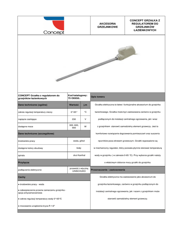 AKCESORIA GRZEJNIKOWE CONCEPT Grzałka z regulatorem do grzejników łazienkowych Dane techniczne (ogólne) zakres regulacji temperatury cieczy napięcie zasilające dostępne moce Kod katalogowy: 75 O93G0.. dostępne kolory obudowy spirala j.m Grzałka elektryczna to łatwe i funkcjonalne akcesorium do grzejnika 0°-65° °C łazienkowego. Grzałka może być zastosowana zarówno w grzejniku 230 V podłączonym do instalacji centralnego ogrzewania, jak i wraz 300, 600, 900 W z grzejnikiem stanowić samodzielny element grzewczy. Jest to komfortowe rozwiązanie dogrzewania pomieszczeń oraz suszenia woda, glikol ręczników poza okresem grzewczym. Grzałki wyposażone są biały w mechaniczny regulator, który pozwala płynnie sterować temperaturą drut Kanthal wody w grzejniku ( w zakresie 0-65 °C). Przy wyborze grzałki należy Przyłącza podłączenie elektryczne Cechy ● środowisko pracy - woda ● zabezpieczenie przeciw zamarzaniu grzejnika opcja antyzamarzaniowa ● zakres regulacji temperatury wody 0°-65°C ● mocowanie urządzenia kryza R 1/2" Opis towaru Wartość Dane techniczne (szczegółowe) środowisko pracy CONCEPT GRZAŁKA Z REGULATOREM DO GRZEJNIKÓW ŁAZIENKOWYCH o właściwym doborze mocy grzałki do grzejnika. przewód z wtyczką UNISCHUKO Przeznaczenie / zastosowania Grzałka elektryczna ma zastosowanie jako akcesorium do grzejnika łazienkowego, zarówno w grzejniku podłączonym do instalacji centralnego ogrzewania, jak i razem z grzejnikiem może stanowić samodzielny element grzewczy.