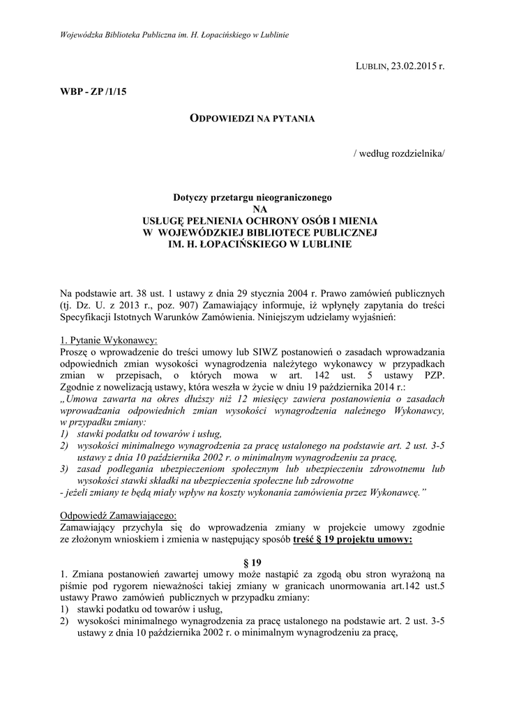 Wojewódzka Biblioteka Publiczna im. H. Łopacińskiego w Lublinie LUBLIN, 23.02.2015 r. WBP - ZP /1/15 ODPOWIEDZI NA PYTANIA / według rozdzielnika/ Dotyczy przetargu nieograniczonego NA USŁUGĘ PEŁNIENIA OCHRONY OSÓB I MIENIA W WOJEWÓDZKIEJ BIBLIOTECE PUBLICZNEJ IM. H. ŁOPACIŃSKIEGO W LUBLINIE Na podstawie art. 38 ust. 1 ustawy z dnia 29 stycznia 2004 r. Prawo zamówień publicznych (tj. Dz. U. z 2013 r., poz. 907) Zamawiający informuje, iŜ wpłynęły zapytania do treści Specyfikacji Istotnych Warunków Zamówienia. Niniejszym udzielamy wyjaśnień: 1. Pytanie Wykonawcy: Proszę o wprowadzenie do treści umowy lub SIWZ postanowień o zasadach wprowadzania odpowiednich zmian wysokości wynagrodzenia naleŜytego wykonawcy w przypadkach zmian w przepisach, o których mowa w art. 142 ust. 5 ustawy PZP. Zgodnie z nowelizacją ustawy, która weszła w Ŝycie w dniu 19 października 2014 r.: „Umowa zawarta na okres dłuŜszy niŜ 12 miesięcy zawiera postanowienia o zasadach wprowadzania odpowiednich zmian wysokości wynagrodzenia naleŜnego Wykonawcy, w przypadku zmiany: 1) stawki podatku od towarów i usług, 2) wysokości minimalnego wynagrodzenia za pracę ustalonego na podstawie art. 2 ust. 3-5 ustawy z dnia 10 października 2002 r. o minimalnym wynagrodzeniu za pracę, 3) zasad podlegania ubezpieczeniom społecznym lub ubezpieczeniu zdrowotnemu lub wysokości stawki składki na ubezpieczenia społeczne lub zdrowotne - jeŜeli zmiany te będą miały wpływ na koszty wykonania zamówienia przez Wykonawcę.” Odpowiedź Zamawiającego: Zamawiający przychyla się do wprowadzenia zmiany w projekcie umowy zgodnie ze złoŜonym wnioskiem i zmienia w następujący sposób treść § 19 projektu umowy: § 19 1. Zmiana postanowień zawartej umowy moŜe nastąpić za zgodą obu stron wyraŜoną na piśmie pod rygorem niewaŜności takiej zmiany w granicach unormowania art.142 ust.5 ustawy Prawo zamówień publicznych w przypadku zmiany: 1) stawki podatku od towarów i usług, 2) wysokości minimalnego wynagrodzenia za pracę ustalonego na podstawie art. 2 ust. 3-5 ustawy z dnia 10 października 2002 r. o minimalnym wynagrodzeniu za pracę, Wojewódzka Biblioteka Publiczna im. H. Łopacińskiego w Lublinie 3) zasad podlegania ubezpieczeniom społecznym lub ubezpieczeniu zdrowotnemu lub wysokości stawki składki na ubezpieczenia społeczne lub zdrowotne - jeŜeli zmiany te będą miały wpływ na koszty wykonania zamówienia przez Wykonawcę. 2. Pytanie Wykonawcy: Czy Zamawiający uwzględnił w budŜecie przewidzianym na realizację zamówienia środki finansowe niezbędne na pokrycie wszystkich jego kosztów, w tym kosztów pracy, o których mowa w art. 90 ust. 1 pkt. 1 ustawy PZP? Odpowiedź Zamawiającego: W odpowiedzi informujemy, Ŝe zapisy Specyfikacji Istotnych Warunków Zamówienia odnoszące się do kwestii raŜąco niskiej ceny są zgodne z przepisami PZP. Zamawiający jako jednostka finansów publicznych określając kwotę planowaną na sfinansowanie zamówienia działa w ramach zasad dotyczących tej sfery finansowania wydatków publicznych i wydatkowanie środków przeznaczonych na przyjęte do realizacji cele nastąpi z dochowaniem obowiązujących norm prawnych. 3. Pytanie Wykonawcy: Proszę o modyfikację treści SIWZ w kryterium oceny ofert w pozycji doświadczenie Wykonawcy na poniŜszy zapis: Warunek ten zostanie spełniony, jeŜeli Wykonawca wykaŜe, Ŝe w okresie ostatnich trzech lat przed upływem terminu składania ofert, a jeŜeli okres prowadzenia działalności jest krótszy w tym okresie wykonał, a w przypadku świadczeń okresowych lub ciągłych wykonuje z zachowaniem okresu ciągłości (stałości) co najmniej dwie (2) usługi, polegające na stałej, bezpośredniej ochronie osób i mienia, zgodnie z planem ochrony uzgodnionym z Komendantem Wojewódzkim/Stołecznym Policji o wartości minimum 1.000.000 zł (słownie: jeden milion złotych) brutto kaŜda oraz załączy dokumenty potwierdzające, Ŝe usługi zostały wykonane lub są wykonywane naleŜycie. Opis kryteriów, którymi Zamawiający będzie się kierował przy wyborze oferty 1. Przy wyborze oferty najkorzystniejszej Zamawiający zastosuje kryterium. Cena –waga 80% Doświadczenie –waga 20% Zamawiający dokona oceny złoŜonych ofert, zgodnie z następującymi zasadami: Kryterium „Cena” zostanie ocenione na podstawie podanej przez wykonawcę w ofercie łącznej ceny brutto oferty. Ocena punktowa w ramach kryterium ceny zostanie dokonana zgodnie ze wzorem: C=CminCbadx70pkt gdzie: Cmin –oznacza najniŜszą zaproponowaną cenę, Cbad –oznacza cenę zaproponowaną w badanej ofercie, Wojewódzka Biblioteka Publiczna im. H. Łopacińskiego w Lublinie C –oznacza liczbę punktów przyznanych badanej ofercie. Kryterium „Doświadczenie” Ocenie będą podlegały usługi spełniające warunek określony w rozdziale …., potwierdzone dokumentami potwierdzającymi, Ŝe te usługi zostały wykonane naleŜycie. Zamawiający dokona oceny powyŜszego kryterium w oparciu o złoŜony załącznik nr ….. a) za wykonanie dwóch dodatkowych usług polegających na ochronie osób i mienia w budynku uŜyteczności publicznej (innych niŜ wskazane w celu spełnienia warunku udziału w postępowaniu określonego w rozdziale … ) Wykonawca otrzyma 10 punktów; b) za wykonanie czterech dodatkowych usług polegających na ochronie osób i mienia w budynku uŜyteczności publicznej (innych niŜ wskazane w celu spełnienia warunku udziału w postępowaniu określonego w rozdziale …........) Wykonawca otrzyma 15 punktów; c) za wykonanie pięciu i więcej dodatkowych usług polegających na ochronie osób i mienia w budynku uŜyteczności publicznej (innych niŜ wskazane w celu spełnienia warunku udziału w postępowaniu określonego w rozdziale …......) Wykonawca otrzyma 20 punktów; Odpowiedź Zamawiającego: Zamawiający podtrzymuje zapisy Specyfikacji Istotnych Warunków Zamówienia. Zmiany doko