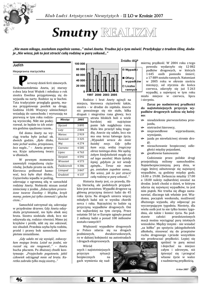 Klub Ludzi Artystycznie Niewyżytych – II LO w Krośnie 2007 Smutny REALIZM „Nie mam nikogo, zostałam zupełnie sama...” mówi Aneta. Trudno jej o tym mówić. Przełykając z trudem ślinę, dodaje „Nie wiesz, jak to jest stracić całą rodzinę w parę sekund...” Niepoprawna marzycielka P ierwszy dzień ferii zimowych. Siedemnastoletnia Aneta, jej starszy o dwa lata brat Wojtek i młodsza o rok siostra Ewelina przygotowują się do wyjazdu na narty. Rodzice są w kuchni. Tata tradycyjnie przegląda gazetę, mama przygotowuje posiłek na drogę. Godzina 10.00. Wszyscy uśmiechnięci wsiadają do samochodu i wyruszają na pierwszą w tym roku rodzinMiesiąc ną wycieczkę. Nikt nie podejrzewał, że będzie to ich ostat- Styczeń nia godzina spędzona razem... Luty Od domu Anety na wy- Marzec ciąg trzeba było jechać ok. dwóch godzin. „Było ślisko, Kwiecień tata jechał wolno, przepisowo, Maj lecz nagle...” – Aneta przery- Czerwiec wa. Kryje załzawioną twarz Lipiec w dłoniach. Sierpień W pewnym momencie Wrzesień zauważyli rozpędzoną ciężarówkę. Jechała prosto na nich. Październik Kierowca próbował hamo- Listopad wać, lecz było zbyt ślisko... Grudzień Ciężarówka wpadła w poślizg, uderzając z ogromną siłą w samochód rodziny Anety. Niebieski nissan został zmieciony z jezdni. „Zobaczyłam przerażone twarze Eweliny i Wojtka, krzyk mamy, potem już tylko ciemność i głucha cisza...” Samochód zatrzymał się, uderzając w przydrożne drzewo. Gdy Aneta odzyskała przytomność, nie było obok niej brata. Siostra siedziała obok, lecz nie odzywała się, rodzice również. Mimo jej krzyków i próśb, nikt się nie odezwał, nie obudził. Przednia szyba była rozbita, przód i prawy bok samochodu kompletnie zmiażdżone. „Gdy udało mi się wysiąść, zobaczyłam mojego brata. Leżał na jezdni, nie ruszał się, nie reagował...” – Aneta bucha płaczem. Po dłuższej chwili kontynuuje: „Przyjechało pogotowie, jakiś człowiek odciągnął mnie od brata. Karetka zabrała tylko moją siostrę...” Źródło: KGP mierną prędkość. W 2004 roku z tego powodu wydarzyło się 12 082 80 000 Wypadki padków drogowych, w których 1 645 osób poniosło śmierć, 60 000 a 17 889 zostało rannych. Natomiast Ofiary 40 000 w 2005 roku w okresie sześciu w ypadków miesięcy, od stycznia do końca 20 000 Liczba czerwca, zdarzyły się już 5 263 rannych 0 wypadki, a najwięcej w tym roku 1997 2000 2003 2005 miało miejsce w czerwcu, lipcu Rodzice i brat Anety zginęli na i sierpniu. miejscu, kierowca ciężarówki także, Zaraz po nadmiernej prędkości siostra - w drodze do szpitala. Anecie do najistotniejszych przyczyn wynic poważnego się nie stało, kilka padków drogowych zalicza się kolejdrapań i niegroźna rana głowy, lecz no: utrata bliskich boli o wiele 2005 nieudzielenie pierwszeństwa przebardziej niż najcięższe jazdu, 3 895 panie lub najgłębsza rana. nietrzeźwi kierowcy, Mało kto przeżył taką trage2 804 nieprawidłowe wyprzedzanie, dię. Anecie się udało, lecz nie 2 919 wymijanie, ma ona teraz łatwego życia. jazda po niewłaściwej stronie dro3 325 „Wypadek wraca do mnie gi, 4 274 każdej nocy. Gdy tylko niezachowanie bezpiecznej odlekam oczy, widzę tragiczny 4 585 głości między pojazdami, obraz tamtego dnia. Nie sądzę, 4 763 gwałtowne hamowanie żebym kiedykolwiek mogła się 100 000 Judith 4 592 od tego uwolnić. Może byłoby lepiej, gdybym ja też wtedy 4 386 zginęła... Teraz nie mam go, zostałam zupełnie sama... 3 847 Nie wiesz, jak to jest stracić 4 137 całą rodzinę w parę sekund...” Historia Anety jest, co prawda, fikcją literacką, ale podobnych przypadków jest mnóstwo. Wypadki drogowe są główną przyczyną śmierci ludzi do 45 roku życia. Na drogach umiera więcej młodych ludzi niż w wyniku chorób serca i raka. Najczęściej to ludzie są przyczyną wypadków drogowych. Oni też najbardziej na tym cierpią. Przez ostatnie 50 lat w Europie zginęło ponad 2 miliony ludzi a ponad 100 milionów zostało rannych!!! Większość wypadków drogowych w Polsce zdarza się na drogach jezdniowych, dwukierunkowych, ro w dalszej kolejności na autostradach i drogach ekspresowych. 4 573 Wśród szych i najistotniejszych przyczyn sytuacji bezpiecznych na gach wymienia się nad- Codziennie przez polskie drogi przejeżdżają miliony samochodów. Najniebezpieczniejszą porą dnia, w ciągu której odnotowuje się najwięcej wypadków, są godziny między godz. 14.00 a 19.00. Zwłaszcza między 17.00 a 18.00 należy najbardziej uważać na drodze. Jeżeli chodzi o dzień, w którym zdarza się najwięcej wypadków, to jest nim piątek. Nie trzeba się długo zastanawiać, dlaczego tak właśnie jest. Wiadomo, początek weekendu, możliwość dłuższego wyjazdu, aby odpocząć po wyczerpującym tygodniu. Niestety, dla wielu osób jest to nie tylko koniec tygodnia, ale także i koniec życia. Na podstawie całości przedstawionych macji można wyciągnąć parę istotnych wniosków. Między innymi - nie wsiadać „za kółko” po spożyciu jakiegokolwiek alkoholu, stosować się do przepisów ruchu drogowego i przede wszystkim nie przekraczać prędkości. Lepiej się spóźnić te parę minut i dojechać na miejsce całym i zdrowym, niż śpieszyć się i przegrać własne życie w walce z nadmierną prędkością. © klan 2007 46