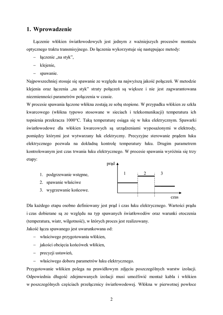 1. Wprowadzenie Łączenie włókien światłowodowych jest jednym z ważniejszych procesów montażu optycznego traktu transmisyjnego. Do łączenia wykorzystuje się następujące metody: łączenie „na styk”, klejenie, spawanie. Najpowszechniej stosuje się spawanie ze względu na najwyższą jakość połączeń. W metodzie klejenia oraz łączenia „na styk” straty połączeń są większe i nie jest zagwarantowana niezmienności parametrów połączenia w czasie. W procesie spawania łączone włókna zostają ze sobą stopione. W przypadku włókien ze szkła kwarcowego (włókna typowo stosowane w sieciach i telekomunikacji) temperatura ich topnienia przekracza 1000C. Taką temperaturę osiąga się w łuku elektrycznym. Spawarki światłowodowe dla włókien kwarcowych są urządzeniami wyposażonymi w elektrody, pomiędzy którymi jest wytwarzany łuk elektryczny. Precyzyjne sterowanie prądem łuku elektrycznego pozwala na dokładną kontrolę temperatury łuku. Drugim parametrem kontrolowanym jest czas trwania łuku elektrycznego. W procesie spawania wyróżnia się trzy etapy: prąd 1 1. podgrzewanie wstępne, 2 3 2. spawanie właściwe 3. wygrzewanie końcowe. czas Dla każdego etapu osobno definiowany jest prąd i czas łuku elektrycznego. Wartości prądu i czas dobierane są ze względu na typ spawanych światłowodów oraz warunki otoczenia (temperatura, wiatr, wilgotność), w których proces jest realizowany. Jakość łącza spawanego jest uwarunkowana od: właściwego przygotowania włókien, jakości obcięcia końcówek włókien, precyzji ustawień, właściwego doboru parametrów łuku elektrycznego. Przygotowanie włókien polega na prawidłowym zdjęciu poszczególnych warstw izolacji. Odpowiednia długość zdejmowanych izolacji musi umożliwić montaż kabla i włókien w poszczególnych częściach przełącznicy światłowodowej. Włókna w pierwotnej powłoce 2 (powłoka akrylowa) powinny być na tyle długie, aby swobodnie sięgały do spawarki światłowodowej (typowo ok. 2 m). Przygotowanie końcówek włókien do procesu spawania wymaga zdjęcia powłoki pierwotnej (ok. 3 cm). ~ 3 cm włókno bez powłoki pierwotnej włókno w powłoce pierwotnej Rys.1. Koniec włókna w powłoce pierwotne przygotowywanego do spawania Oczyszczone z drobin brudu jest obcinane przez specjalistyczny nóż zapewniający prostopadłość płaszczyzny końca włókna do jego osi. Odchylenie od prostopadłości utrudnia precyzyjne pozycjonowanie włókien trzymanych przez uchwyty spawarki i zarazem wpływa na jakość połączenia. Długość włókna bez powłoki pierwotnej po obcięciu powinna być dopasowana do rozmiarów uchwytów pozycjonujących spawarki. Obcięte końcówki włókien trzymane w uchwytach spawarki są pozycjonowane w trzech płaszczyznach XYZ (spotyka się rozwiązania z kontrolą dwóch płaszczyzn YZ). Jeżeli końcówki włókien podczas montażu w uchwytach zostały zabrudzone – przykleiły się drobiny kurzu, możliwe jest ich oczyszczenie przez chwilowe zapalenie łuku elektrycznego (prespaw). Czyste, precyzyjnie obcięte końcówki włókien są zbliżane do możliwie minimalnej szczeliny, co pozwala na dokładne współosiowe ułożenie obu włókien zarówno w płaszczyźnie X jak i Y. Przy zbliżaniu i pozycjonowaniu nie należy dopuszczać do zderzenia włókien czołami, które prowadzi do powstawania mikropęknięć i odprysków na czołowej powierzchni włókien. W konsekwencji podczas spawania ukruszone drobiny szkła w temperaturze topnienia będą parować deformując stapiane włókna. W procesie spawania – w pierwszym etapie – włókna ulegają podgrzaniu do temperatury powodującej ich uplastycznienie. W ostatniej sekundzie procesu podgrzewania włókna zostają do siebie dosunięte na tyle, aby czołami się dotknęły. W chwili rozpoczęcia procesu spawania właściwego – gwałtowny wzrost temperatury łuku topi czoła włókien – końce włókien stapiają się i jednocześnie są do siebie dosuwane w celu wyeliminowania efektu przewężenia w miejscu połączenia. Efekt przewężenia jest spowodowany częściowym odparowaniem szkła kwarcowego ulegającemu stopieniu. Dosuwanie włókien musi odbywać się pod stałą kontrolą, aby nie doprowadzić do przegrubienia, które wystąpi, jeżeli zbyt 3 mocno włókna zostaną dosunięte do siebie. Z chwilą rozpoczęcia procesu wygrzewania końcowego wszelkie manipulacje przesuwu włókien już nie są dokonywane. Jeżeli podczas spawania właściwego wystąpiły deformacje spowodowane odparowywaniem okruchów szkła lub zanieczyszczeń jak również efektem przewężenia (przegrubienia), dopuszcza się powtórzenie procesu spawania bez zrywania włókna. Ponowienie procesu spawania powinno wyeliminować powstałe deformacje. Należy jednak mieć na uwadze, że powtórzenie całego procesu będzie powodowało dalsze dyfundowanie atomów domieszki z obszaru rdzenia włókna do obszaru płaszcza, co w konsekwencji spowoduje wzrost tłumienności połączenia. Powstały jednorodny odcinek włókna bez powłoki pierwotnej wymaga zaizolowania specjalną osłonką termokurczliwą, która jednocześnie osłania ten fragment włókna przed absorpcją jonów OH oraz wzmacnia go mechanicznie. Długość osłonki musi być ponad dwukrotnie większa od długości końcówek włókien przygotowanych do spawania. Istotne jest, aby osłonka założona na jednorodny odcinek pospawanych włókien obejmowała fragment powłoki pierwotnej z obu stron tego odcinka (Rys.2.). Stopienie osłony na włóknie kończy proces trwałego połączenia włókien. włókno w powłoce pierwotnej włókno bez powłoki pierwotnej osłonka termokurczliwa Rys.2. Izolacja połączenia pospawanych włókien osłonką termokurczliwą. Pospawane włókna umieszcza się w specjalnej do tego celu przeznaczonej kopercie wyposażonej w grzebień uchwytów na osłonki spawów. Do koperty mocowane są włókna w 