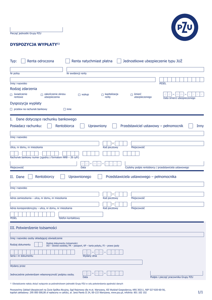 Pieczęć jednostki Grupy PZU DYSPOZYCJA WYPŁATY1) Typ: Renta odroczona Renta natychmiast płatna Nr polisy Jednostkowe ubezpieczenie typu JUŻ Nr ewidencji renty Imię i nazwisko PESEL Rodzaj zdarzenia świadczenie rentowe zakończenie okresu ubezpieczenia wykup kapitalizacja renty śmierć ubezpieczonego d d – m m – r r r r Data śmierci ubezpieczonego Dyspozycja wypłaty przelew na rachunek bankowy inne I. Dane dotyczące rachunku bankowego Posiadacz rachunku: Rentobiorca Uprawniony Przedstawiciel ustawowy – pełnomocnik Inny Imię i nazwisko – Ulica, nr domu, nr mieszkania Kod pocztowy Miejscowość Rachunek bankowy numer (zgodny z formatem NRB – 26 cyfr) d d – m m – r Miejscowość r r r Data II. Dane Rentobiorcy Uprawnionego Czytelny podpis rentobiorcy / przedstawiciela ustawowego Przedstawiciela ustawowego – pełnomocnika Imię i nazwisko – Adres zamieszkania – ulica, nr domu, nr mieszkania Kod pocztowy Adres korespondencyjny – ulica, nr domu, nr mieszkania Kod pocztowy PESEL Miejscowość – Miejscowość Telefon kontaktowy III.Potwierdzenie tożsamości Imię i nazwisko osoby składającej oświadczenie Rodzaj dokumentu Rodzaj dokumentu tożsamości: DO – dowód osobisty, PA – paszport, KP – karta pobytu, PJ – prawo jazdy d d – m m – r Seria i nr dokumentu r r r r r r Wydany dnia Wydany przez Jednocześnie potwierdzam własnoręczność podpisu osoby. 1) Oświadczenie d d – m m – r Data Podpis i pieczęć pracownika Grupy PZU należy złożyć wyłącznie za pośrednictwem jednostki Grupy PZU w celu potwierdzenia zgodności danych Powszechny Zakład Ubezpieczeń na Życie Spółka Akcyjna, Sąd Rejonowy dla m.st. Warszawy, XII Wydział Gospodarczy, KRS 30211, NIP 527-020-60-56, kapitał zakładowy: 295 000 000,00 zł wpłacony w całości, al. Jana Pawła II 24, 00-133 Warszawa, www.pzu.pl, infolinia: 801 102 102 XXXX/0000 1/1