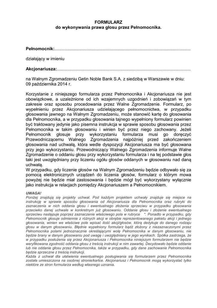 FORMULARZ do wykonywania prawa głosu przez Pełnomocnika. Pełnomocnik:................................................................................................................ działający w imieniu Akcjonariusza:.............................................................................................................. na Walnym Zgromadzeniu Getin Noble Bank S.A. z siedzibą w Warszawie w dniu: 09 października 2014 r. Korzystanie z niniejszego formularza przez Pełnomocnika i Akcjonariusza nie jest obowiązkowe, a uzależnione od ich wzajemnych uzgodnień i zobowiązań w tym zakresie oraz sposobu procedowania przez Walne Zgromadzenie. Formularz, po wypełnieniu przez Akcjonariusza udzielającego pełnomocnictwa, w przypadku głosowania jawnego na Walnym Zgromadzeniu, może stanowić kartę do głosowania dla Pełnomocnika, a w przypadku głosowania tajnego wypełniony formularz powinien być traktowany jedynie jako pisemna instrukcja w sprawie sposobu głosowania przez Pełnomocnika w takim głosowaniu i winien być przez niego zachowany. Jeżeli Pełnomocnik głosuje przy wykorzystaniu formularza musi go doręczyć Przewodniczącemu Walnego Zgromadzenia najpóźniej przed zakończeniem głosowania nad uchwałą, która wedle dyspozycji Akcjonariusza ma być głosowana przy jego wykorzystaniu. Przewodniczący Walnego Zgromadzenia informuje Walne Zgromadzenie o oddaniu głosu przy wykorzystaniu formularza i na tej podstawie głos taki jest uwzględniany przy liczeniu ogółu głosów oddanych w głosowaniu nad daną uchwałą. W przypadku, gdy liczenie głosów na Walnym Zgromadzeniu będzie odbywało się za pomocą elektronicznych urządzeń do liczenia głosów, formularz o którym mowa powyżej nie będzie miał zastosowania i będzie mógł być wykorzystany wyłącznie jako instrukcja w relacjach pomiędzy Akcjonariuszem a Pełnomocnikiem. UWAGA! Poniżej znajdują się projekty uchwał. Pod każdym projektem uchwały znajduje się miejsce na instrukcję w sprawie sposobu głosowania od Akcjonariusza dla Pełnomocnika oraz rubryki do zaznaczenia w nich oddania głosu i ewentualnego złożenia sprzeciwu w przypadku głosowania przeciwko danej uchwale w konkretnym już głosowaniu. Oddanie głosu i złożenie ewentualnego sprzeciwu następuje poprzez zaznaczenie właściwego pola w rubryce *. Ponadto w przypadku, gdy Pełnomocnik głosuje odmiennie z różnych akcji w obrębie reprezentowanego pakietu akcji i jednego głosowania, winien we właściwe pole wpisać ilość akcji/głosów, którą dedykuje do danego rodzaju głosu w danym głosowaniu. Błędnie wypełniony formularz bądź złożony z niezaznaczonymi przez Pełnomocnika polami jednoznacznie określającymi wolę Pełnomocnika w danym głosowaniu, nie będzie brany w danym głosowaniu pod uwagę i uwzględniany w jego wynikach. Spółka zastrzega, że w przypadku posłużenia się przez Akcjonariusza i Pełnomocnika niniejszym formularzem nie będzie weryfikowana zgodność oddania głosu z treścią instrukcji w nim zawartej. Decydowało będzie oddanie lub nie oddanie głosu przez Pełnomocnika, także w przypadku, gdy dane zachowanie Pełnomocnika będzie sprzeczne z treścią instrukcji. Każda z uchwał dla ułatwienia ewentualnego posługiwania się formularzem przez Pełnomocnika została umieszczona na osobnej stronie/kartce. Akcjonariusz i Pełnomocnik mogą wykorzystać tylko niektóre ze stron formularza według własnego uznania. Uchwała Nr 1 w sprawie wyboru Przewodniczącego Walnego Zgromadzenia §1. Na podstawie przepisu art. 409 § 1 ustawy Kodeks Spółek Handlowych (Dz.U. z 2000 r., nr 94, poz. 1037 ze zm.), [dalej „Kodeks Spółek Handlowych” lub „KSH”], Walne Zgromadzenie wybiera na Przewodniczącego Walnego Zgromadzenia Pana/Panią ................ §2. Uchwała wchodzi w życie z dniem podjęcia Instrukcja Akcjonariusza dla Pełnomocnika: Oddanie głosu: *ZA Oddanie głosu: *PRZECIW Oddanie głosu: *WSTRZYMUJĘ SIĘ Liczba akcji: Liczba akcji: Liczba akcji: ........................................ ........................................ ........................................ Liczba głosów: Liczba głosów: Liczba głosów: ........................................ ........................................ ........................................ ZGŁASZAM SPRZECIW Akcjonariusz:................................................................................................................................................................ podpis/y Pełnomocnik:............................................................................................................................................................... podpis/y Uchwała Nr 2 w sprawie przyjęcia porządku obrad Walnego Zgromadzenia §1. Walne Zgromadzenie przyjmuje porządek obrad, ustalony i ogłoszony w na stronie internetowej Spółki w dniu [•] września 2014 r., w poniższym brzmieniu: 1. Otwarcie obrad. 2. Wybór Przewodniczącego. 3. Stwierdzenie prawidłowości zwołania Nadzwyczajnego Walnego Zgromadzenia oraz jego zdolności do podejmowania uchwał. 4. Przyjęcie porządku obrad. 5. Podjęcie uchwał w sprawie zmiany Statutu Banku. 6. Podjęcie uchwały w sprawie powołania członka Rady Nadzorczej Banku. 7. Podjęcie uchwały w sprawie ustalenia zasad i wysokości wynagradzania Rady Nadzorczej Banku. 8. Zamknięcie obrad. §2. Uchwała wchodzi w życie z dniem podjęcia. Instrukcja Akcjonariusza dla Pełnomocnika: Oddanie głosu: *ZA Oddanie głosu: *PRZECIW Oddanie głosu: *WSTRZYMUJĘ SIĘ Liczba akcji: Liczba akcji: Liczba akcji: ........................................ ........................................ ........................................ Liczba głosów: Liczba głosów: Liczba głosów: ........................................ ........................................ ........................................ ZGŁASZAM SPRZECIW Akcjonariusz:..............................................