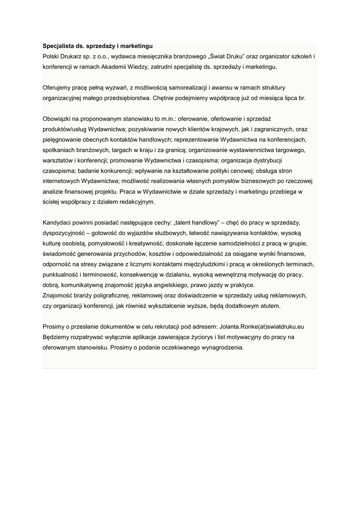 Specjalista ds. sprzedaży i marketingu Polski Drukarz sp. z o.o., wydawca miesięcznika branżowego „Świat Druku” oraz organizator szkoleń i konferencji w ramach Akademii Wiedzy, zatrudni specjalistę ds. sprzedaży i marketingu. Oferujemy pracę pełną wyzwań, z możliwością samorealizacji i awansu w ramach struktury organizacyjnej małego przedsiębiorstwa. Chętnie podejmiemy współpracę już od miesiąca lipca br. Obowiązki na proponowanym stanowisku to m.in.: oferowanie, ofertowanie i sprzedaż produktów/usług Wydawnictwa; pozyskiwanie nowych klientów krajowych, jak i zagranicznych, oraz pielęgnowanie obecnych kontaktów handlowych; reprezentowanie Wydawnictwa na konferencjach, spotkaniach branżowych, targach w kraju i za granicą; organizowanie wystawiennictwa targowego, warsztatów i konferencji; promowanie Wydawnictwa i czasopisma; organizacja dystrybucji czasopisma; badanie konkurencji; wpływanie na kształtowanie polityki cenowej; obsługa stron internetowych Wydawnictwa; możliwość realizowania własnych pomysłów biznesowych po rzeczowej analizie finansowej projektu. Praca w Wydawnictwie w dziale sprzedaży i marketingu przebiega w ścisłej współpracy z działem redakcyjnym. Kandydaci powinni posiadać następujące cechy: „talent handlowy” – chęć do pracy w sprzedaży, dyspozycyjność – gotowość do wyjazdów służbowych, łatwość nawiązywania kontaktów, wysoką kulturę osobistą, pomysłowość i kreatywność, doskonałe łączenie samodzielności z pracą w grupie, świadomość generowania przychodów, kosztów i odpowiedzialność za osiągane wyniki finansowe, odporność na stresy związane z licznymi kontaktami międzyludzkimi i pracą w określonych terminach, punktualność i terminowość, konsekwencję w działaniu, wysoką wewnętrzną motywację do pracy, dobrą, komunikatywną znajomość języka angielskiego, prawo jazdy w praktyce. Znajomość branży poligraficznej, reklamowej oraz doświadczenie w sprzedaży usług reklamowych, czy organizacji konferencji, jak również wykształcenie wyższe, będą dodatkowym atutem. Prosimy o przesłanie dokumentów w celu rekrutacji pod adresem: Jolanta.Ronke(at)swiatdruku.eu Będziemy rozpatrywać wyłącznie aplikacje zawierające życiorys i list motywacyjny do pracy na oferowanym stanowisku. Prosimy o podanie oczekiwanego wynagrodzenia.