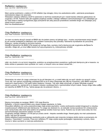 Reflektor zastepczy Autor: Irek K100 - 2007/01/04 22:37 _____________________________________ Mam zamiar podmienic u siebie w K100 reflektor (typ okragly), ktory ma uszkodzone szklo - pekniecie powodujace zachodzenie wilgoci do wewnatrz. Widzialem ciekawe reflektory (Golf II) wykonane w technice swobodnych pol i nawet bardzo zblizone gabarytowo do oryginalu z K100. Pytanie tylko jak wyglada projekcja swiatla z takiego reflektora samochodowego? Czy zakladajac go do moto bede w stanie wyregulowac jego pochylenie tak zeby jeszcze prawidlowo oswietlal droge nie oslepiajac przy okazji innych juzerow? Ktos ma doswiadczenia? ============================================================================ Odp:Reflektor zastepczy Autor: Rafa³ Ponikowski - 2007/01/06 00:02 _____________________________________ Ja mam na stanie okr±g³± lampê od BMW ale nie jestem pewny od jakiego typu , musisz zwymiarowaæ swoj± lampê i je¿eli rozmiar podejdzie to bêdziesz mia³ problem rozwi±zany bez potrzeby ³adowania wynalazków do porz±dnej maszyny. Lampa od golfa to nie brzmi dumnie. Kiedy¶ w³adowa³em do BMW k75s lampê od ma³ego fiata, wymiary mia³a identyczne jak oryginalna ale ¶wieci³a cienutko. Zdaje siê ¿e inna ilo¶æ luksów by³a jej przypisana ni¿ motocyklowej.:whistle: ============================================================================ Odp:Reflektor zastepczy Autor: ron - 2007/01/06 11:39 _____________________________________ rafal, nie chodzi o to ze brzmi niegodnie, podobno np przeplywomierz powietrza z golfa jest identyczny jak w kasecie. na bloku silnika w passacie mam symbole vw i audi, w nowych volvo sa czesci renault itd... ============================================================================ Odp:Reflektor zastepczy Autor: Rafa³ Ponikowski - 2007/01/06 19:32 _____________________________________ Generalnie nie wiem do czego zmierzasz bo je¿eli klarujesz mi ¿e marki takie jak vw audi i skoda czy renault i volvo ³±cz± siê i tym samym wymieniaj± podzespo³ami to ja to wiem doskonale ale co¶ nie s³ysza³em ¿eby BMW motorrad nawi±za³o wspó³pracê z VW (golf) celem badania i rozwoju. Tak wiêc dalej utrzymujê ¿e lepiej ³adowaæ orygina³ nawet u¿ywany ni¿ zamiennik a co dopiero mówiæ o podzespo³ach z samochodów innych marek. Swoj± drog± kilka czê¶ci od malucha do BMW R 2V te¿ ³adnie pasuje ale nie polecam nikomu. ;) ============================================================================ Odp:Reflektor zastepczy Autor: Irek K100 - 2007/01/06 20:12 _____________________________________ Niemcy korzystaja ze swojego: BMW i VW maja Boscha. Reflektor, o ktorym wspominalem przy okazji mojego zapytania, to Hella. Wszystkie reflektory do ruchu prawostronnego maja prawa asymetrie. Liczba cechowania swiatel drogowych w obydwu rozpatrywanych reflektorach jest identyczna. To czego sie obawiam to, ze wskutek roznej wysokosci ich umieszczenia oraz roznej liczby (dla moto tylko jeden) ich projekcja swiatla moze byc rozna. Pytanie czy na tyle rozna zeby nie moc samochodowego poprawnie ustawic na moto. Oryginalny okragly reflektor z K100 jest po prostu cienki - kiepsko oswietla droge. Nawet gdyby nie mial uszkodzenia szyby i tak bym go wywalil. Zaleta reflektora wykorzystujacego swobodne pola w odblysniku jest znacznie mniejsza strefa cienia w porownaniu do klasyka z "bieznikiem" z przodu. Poza tym reflektory FF maja czysta szybe (poliweglan najczesciej) z przodu, ktora mozna b. latwo wymienic w razie jej uszkodzenia. ============================================================================ ARCHIWUM FoRUM BOXER-MOTOR - MOTOCYKLE BMW sklep BOXER-PARTS.eu MamboBoard czê¶ci i akcesoria Forum Component version: 1.4 Stable Generated: 3 March, 2017, 23:28 Odp:Reflektor zastepczy Autor: Rivendall - 2007/01/13 19:26 _____________________________________ Witam! Mam BMW K100 bez lampy, te¿ zastanawia³em siê nad zamiennikiem. S±dz±c po Twoich wpisach masz spore do¶wiadczenie w tej materii. Czy mo¿esz mi co¶ doradziæ? ============================================================================ Odp:Reflektor zastepczy Autor: Irek K100 - 2007/01/13 21:32 _____________________________________ To zalezy jakie K100 masz. Jesli jest to maszyna z prostokatnym reflektorem (czyli wszystko oprocz Classic/Basic) to dobrze jest przeszperac popularne serwisy aukcyjne. Gesto tam od reflektorow prostokatnych glownie od "japonii". Jesli tak jak ja masz wersje Classic/Basic (okragly reflektor) to poczekaj na wlasnie przeprowadzane przeze mnie testy reflektora samochodowego. Po zamontowaniu na moto i wyregulowaniu zgodnie z zaleceniami serwisowki, zamierzam udac sie do stacji diagnostycznej w celu zweryfikowania "na zywca" wynikow niniejszego eksperymentu. Postaram sie opublikowac rezultaty. ============================================================================ Odp:Reflektor zastepczy Autor: Rivendall - 2007/01/16 22:22 _____________________________________ No to mamy ten sam model! I ten sam problem... Czekam z niecierpliwo¶ci± na wyniki Twoich badañ (do wiosny siê wyrobisz?) ============================================================================ Odp:Reflektor zastepczy Autor: Irek K100 - 2007/01/16 23:08 _____________________________________ Wiosna, zima, zima, lato... Hmmm.. teraz to juz najstarsi Grecy nie wiedza czego sie spodziewac. Chyba prosciej bedzie operowac datami: 9.IV mam termin stawienia sie na ... noo, nie WKU oczywiscie, tylko badania moto na rownie posepnej komisji :-) ============================================================================ ARCHIWUM FoRUM BOXER-MOTOR - MOTOCYKLE BMW sklep BOXER-PARTS.eu MamboBoard czê¶ci i akcesoria Forum Component version: 1.4 Stable Generated: 3 March, 2017, 23:28
