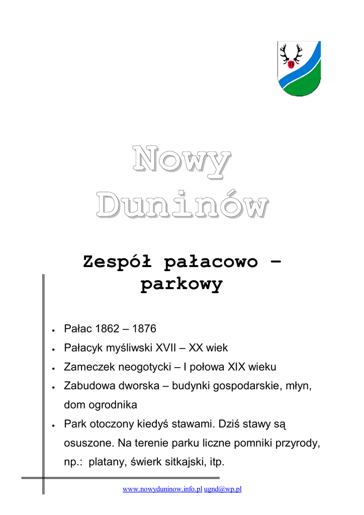 Nowy Duninów Zespół pałacowo – parkowy • Pałac 1862 – 1876 • Pałacyk myśliwski XVII – XX wiek • Zameczek neogotycki – I połowa XIX wieku • Zabudowa dworska – budynki gospodarskie, młyn, dom ogrodnika • Park otoczony kiedyś stawami. Dziś stawy są osuszone. Na terenie parku liczne pomniki przyrody, np.: platany, świerk sitkajski, itp. www.nowyduninow.info.pl [email protected] Pałacyk myśliwski XVII- XX w (ostatnia przebudowa lata 30 –te) Zdjęcie – październik 2004 r. Zespół pałacowo – parkowy. Pałacyk myśliwski XVII- XX w (ostatnia przebudowa lata 30 –te). Zdjęcie z lat 90 - tych www.nowyduninow.info.pl [email protected] Pałacyk myśliwski XVII- XX w Zdjęcie z lat 90 - tych Pałacyk myśliwski XVII- XX w (ostatnia przebudowa lata 30 –te) www.nowyduninow.info.pl [email protected] Pałac 1862 – 1876 Zdjęcie październik 2004r Pałac 1862 – 1876 Zdjęcie archiwalne – lata 30 www.nowyduninow.info.pl [email protected] Pałac 1862 – 1876 Zdjęcie – październik 2004 Pałac 1862 – 1876 Zdjęcie – październik 2004 www.nowyduninow.info.pl [email protected] Zameczek neogotycki – widok z portu Zdjęcie 2004 r. Zespół Pałacowo – Parkowy. Stawy wokół zameczku neogotyckiego. Zdjęcie archiwalne www.nowyduninow.info.pl [email protected]