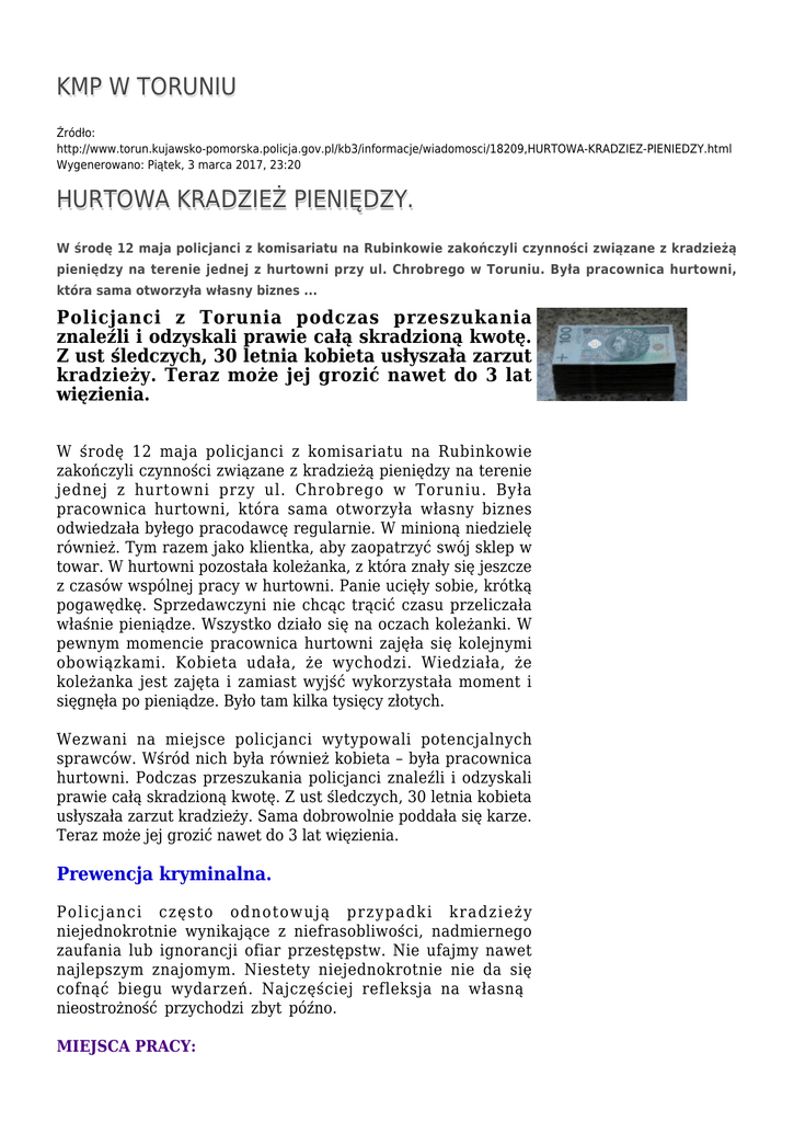KMP W TORUNIU HURTOWA KRADZIEŻ PIENIĘDZY.