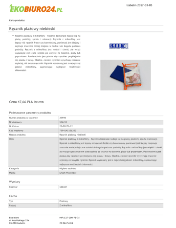 Izabelin 2017-03-03 Karta produktu: Ręcznik plażowy niebieski Ręcznik plażowy z mikrofibry - Ręcznik doskonale nadaje się na plażę, podróży, sportu i rekreacji. Ręcznik z mikrofibry jest lepszy niż ręcznik frotte czy bawełniany, ponieważ jest lżejszy i zajmuje znacznie mniej miejsca w torbie lub bagażu podczas podróży. Ręcznik z mikrofibry jest miękki i cienki, ale wciąż wysuszysz nim ciało szybko po wizycie na basenie, plaży lub prysznicem. Powierzchnia jest płaska aby zapobiec przyklejaniu się piasku i trawy. Gładkie, cienkie ręczniki wysychają znacznie szybciej, niż zwykłe ręczniki. Ręcznik wykonany jest z najwyższej jakości mikrofibry, zapewniając najlepsze możliwości chłonności. Cena 47,66 PLN brutto Podstawowe parametry produktu Numer produktu w systemie 29998 Nr dostawcy 1062-B Nr Celcen 22-00171-12 Kod kreskowy 7394145106202 Nazwa produktu Ręcznik plażowy niebieski Opis Ręcznik plażowy z mikrofibry - Ręcznik doskonale nadaje się na plażę, podróży, sportu i rekreacji. Ręcznik z mikrofibry jest lepszy niż ręcznik frotte czy bawełniany, ponieważ jest lżejszy i zajmuje znacznie mniej miejsca w torbie lub bagażu podczas podróży. Ręcznik z mikrofibry jest miękki i cienki, ale wciąż wysuszysz nim ciało szybko po wizycie na basenie, plaży lub prysznicem. Powierzchnia jest płaska aby zapobiec przyklejaniu się piasku i trawy. Gładkie, cienkie ręczniki wysychają znacznie szybciej, niż zwykłe ręczniki. Ręcznik wykonany jest z najwyższej jakości mikrofibry, zapewniając najlepsze możliwości chłonności. Kategoria Higiena osobista Marka Smart Microfiber Wymiary Rozmiar 180x87 Cecha Typ Plażowy Rodzaj Z mikrofibry Eko biuro ul Krasińskiego 23a 05-080 Izabelin NIP: 527-000-75-75 22 864 54 84 Izabelin 2017-03-03 Karta katalogowa produktu cd. Ręcznik plażowy niebieski Produkt Ręcznik Kolor Kolor Niebieski Serdecznie zapraszamy do współpracy Eko biuro zespół. Eko biuro ul Krasińskiego 23a 05-080 Izabelin NIP: 527-000-75-75 22 864 54 84