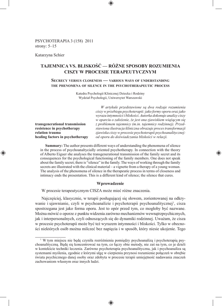 Psychoterapia 3 (158) 2011 strony: 5–15 Katarzyna Schier Tajemnica vs. bliskość — różne sposoby rozumienia ciszy w procesie terapeutycznym Secrecy versus closeness — various ways of understanding the phenomena of silence in the psychotherapeutic process Katedra Psychologii Klinicznej Dziecka i Rodziny Wydział Psychologii, Uniwersytet Warszawski transgenerational transmission resistence in psychotherapy relation trauma healing factors in psychotherapy W artykule przedstawione są dwa rodzaje rozumienia ciszy w przebiegu psychoterapii: jako formy oporu oraz jako wyrazu intymności i bliskości. Autorka dokonuje analizy ciszy w oparciu o założenie, że jest ona zjawiskiem wiążącym się z problemem tajemnicy (m.in. tajemnicy rodzinnej). Przedstawiona ilustracja kliniczna obrazuje proces transformacji zjawiska ciszy w procesie psychoterapii psychoanalitycznej: od oporu do doświadczania bliskości w relacji. Summary: The author presents different ways of understanding the phenomena of silence in the process of psychoanaltycially oriented psychotherapy. In connection with the theory of Alberto Eiguer she analyses the transgenerational transmission of the family secret and its consequences for the psychological functioning of the family members. One does not speak about the family secret; there is “silence” in the family. The ways of working through the family secrets are illustrated with the clinical material – a vignette from a therapy of a young woman. The analysis of the phenomena of silence in the therapeutic process in terms of closeness and intimacy ends the presentation. This is a different kind of silence; the silence that cures. Wprowadzenie W procesie terapeutycznym CISZA może mieć różne znaczenia. Najczęściej, klasycznie, w terapii posługującej się słowem, zorientowanej na odkrywanie i ujawnianie, czyli w psychoanalizie i psychoterapii psychoanalitycznej1, cisza spostrzegana jest jako forma oporu. Jest to opór przed tym, co mogłoby być nazwane. Można mówić o oporze z punktu widzenia zarówno mechanizmów wewnątrzpsychicznych, jak i interpersonalnych, czyli odnoszących się do dynamiki rodzinnej. Uważam, że cisza w procesie psychoterapii może być też wyrazem intymności i bliskości. Tylko w obecności niektórych osób można milczeć bez napięcia i w sposób, który niesie ukojenie. Tego W tym miejscu nie będę czyniła rozróżnienia pomiędzy psychoanalizą i psychoterapią psychoanalityczną. Będę się koncentrować na tym, co łączy obie metody, nie zaś na tym, co je dzieli w kontekście techniki leczenia. Zarówno psychoterapia psychoanalityczna, jak i psychoanaliza są systemami myślenia, zgodnie z którymi ulgę w cierpieniu przynosi rozumienie połączeń w obrębie świata psychicznego danej osoby oraz zdobyta w procesie terapii umiejętność nadawania znaczeń zachowaniom własnym oraz innych ludzi. 1 6 Katarzyna Schier rodzaju cisza staje się elementem relacji terapeutycznej, który leczy. W tej pracy pragnę przedstawić te dwa rodzaje rozumienia ciszy w przebiegu psychoterapii. Cisza jako opór przed myśleniem Zygmunt Freud przyjmował, że jednym z zadań procesu leczenia jest spowodowanie, aby tam, gdzie było id, znalazło się ego, lub też mówiąc inaczej — aby to, co było nieświadome, stało się świadomym. Zdaniem Bjørna Killingmo [1]: Wszystkie formy obrony psychicznej (mechanizmy obronne) w terapii reprezentują opór. Jest on jednak pojęciem szerszym niż obrona. Obejmuje on też inne czynniki utrudniające terapię [s. 116]. Opór może być świadomy i nieświadomy, choć najczęściej wyraźne rozgraniczenie nie jest możliwe. Świadomy opór występuje wtedy, kiedy pacjent tłumi (odpędza) myśli lub przeżycia, gdyż przyznanie się do nich przed terapeutą budzi przykre uczucia [...] Choć ta forma oporu jest świadoma, to [...] uczucie wstydu powstaje z powodu czynników nieświadomych [s. 123]. Kiedy pacjent uruchamia opór? Kogo lub co wewnętrznie chroni nie mówiąc czy wręcz na jakiś temat nie myśląc? Syn Johna Bowlby’ego, twórcy teorii przywiązania, zwrócił uwagę na to, że większość ludzi pragnie zachować w umyśle dobry obraz opiekunów, a także relacji z nimi z okresu dzieciństwa [2]. To ważna strategia psychiczna, pozwalająca dziecku przetrwać nawet w obliczu trudnych lub traumatycznych doświadczeń w kontakcie z rodzicami. Richard Bowlby cytuje ojca, który mówił: Poczucie siebie jest silnie zależne od kilku bliskich związków przywiązania, które mamy albo mieliśmy w naszym życiu. Szczególnie dotyczy to relacji z osobami, które nas wychowywały. Te silne więzi, bez względu na to, czy były ufne czy lękowe [...], mają przemożne znaczenie dla nas i musimy chronić ich idealizowany obraz za wszelką cenę. Może one nie znaczą wiele, ale są wszystkim, co mamy! [3, s. viii]. W psychoanalizie od lat toczą się spory o to, jakie znaczenie w procesie powstawania zaburzeń odgrywa świat wewnętrzny pacjenta, a jakie rzeczywistość zewnętrzna i/lub jej odbicie w jego umyśle. Jest to podstawowy dylemat, w którym poszukuje się odpowiedzi na pytanie o to, czy znaczący jest konflikt w obrębie struktury psychicznej, wynikający np. z obrony w sytuacji silnych nacisków popędowych, czy też deficyt strukturalny, czyli niewystarczający rozwój określonych struktur, np. zdolności do regulacji emocji lub niemożności posługiwania się zasadami moralnymi, uwarunkowany przebiegiem wczesnych relacji dziecka z jego opiekunami? [4]. Zyskująca ostatnio coraz większą popularność klasyfikacja chorób psychicznych, odwołująca się do teorii psychoanalitycznych — PDM (Psychodynamic diagnostic manual) [5], stanowi swoisty kompromis w tym względzie. Zdaniem autorów tego podręcznika osobowość i jej zaburzenia kształtują się w wyniku współdziałania wielu różnych czynników. Są to: predyspozycje biologiczne, wiek, postępy rozwojowe, is