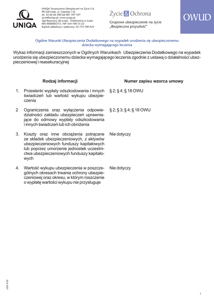 UNIQA Towarzystwo Ubezpieczeń na Życie S.A. 90-520 Łódź, ul. Gdańska 132 tel. 42 66 66 500 lub 801 597 597 [email protected], www.uniqa.pl Sąd Rejonowy dla Łodzi - Śródmieścia w Łodzi KRS 0000005751, NIP 554-100-15-22 Kapitał zakładowy i wpłacony: 42 774 700 PLN Życie & Ochrona Grupowe ubezpieczenie na życie „Bezpieczna przyszłość” OWUD Ogólne Warunki Ubezpieczenia Dodatkowego na wypadek urodzenia się ubezpieczonemu dziecka wymagającego leczenia Wykaz informacji zamieszczonych w Ogólnych Warunkach Ubezpieczenia Dodatkowego na wypadek urodzenia się ubezpieczonemu dziecka wymagającego leczenia zgodnie z ustawą o działalności ubezpieczeniowej i reasekuracyjnej UDL-450 v.2 - 2015.12.22 - KACZOROWSKA Ewa - WERSJA NIE PRZEZNACZONA DO OBSŁUGI UBEZPIECZEŃ Rodzaj informacji Numer zapisu wzorca umowy 1. Przesłanki wypłaty odszkodowania i innych świadczeń lub wartość wykupu ubezpieczenia § 2; § 4; § 18 OWU 2 Ograniczenia oraz wyłączenia odpowiedzialności zakładu ubezpieczeń uprawniające do odmowy wypłaty odszkodowania i innych świadczeń lub ich obniżenia § 2; § 3; § 4; § 18 OWU 3. Koszty oraz inne obciążenia potrącane ze składek ubezpieczeniowych, z aktywów ubezpieczeniowych funduszy kapitałowych lub poprzez umorzenie jednostek uczestnictwa ubezpieczeniowych funduszy kapitałowych Nie dotyczy 4. Wartość wykupu ubezpieczenia w poszczególnych okresach trwania ochrony ubezpieczeniowej oraz okresu, w którym roszczenie o wypłatę wartości wykupu nie przysługuje Nie dotyczy 1 2 §1 Postanowienia ogólne Niniejsze Ogólne Warunki Ubezpieczenia Dodatkowego (OWUD) na wypadek urodzenia się Ubezpieczonemu dziecka wymagającego leczenia stosuje się w umowach grupowego ubezpieczenia na życie „Bezpieczna przyszłość” zawieranych pomiędzy UNIQA TU na Życie S.A., a Ubezpieczającym (Umowa podstawowa) w zakresie rozszerzonym. Terminy pisane w niniejszych OWUD wielką literą mają znaczenie nadane im w Ogólnych Warunkach Grupowego ubezpieczenia na życie „Bezpieczna przyszłość” (OWU), o ile w OWUD nie zostały zdefiniowane odmiennie. 3. Ubezpieczeniem dodatkowym na podstawie OWUD obejmuje się wszystkich Ubezpieczonych objętych ochroną z tytułu Umowy podstawowej. 4. Umowa ubezpieczenia dodatkowego zawierana jest na okres 12 miesięcy i trwa przez okres na jaki zawarto Umowę podstawową. Postanowienia § 6 ust. 2 OWU stosuje się odpowiednio. 5. Ochrona ubezpieczeniowa z tytułu ubezpieczenia dodatkowego trwa w Okresie ochrony ubezpieczeniowej z tytułu Umowy podstawowej. §2 6. Ochrona ubezpieczeniowa z tytułu umowy ubezpieczenia dodatkowego ustaje: 1) z dniem rozwiązania Umowy podstawowej, 2) z upływem okresu, na jaki zawarto umowę ubezpieczenia dodatkowego. Zakres ubezpieczenia i wysokość świadczeń §4 1. Zakres ochrony ubezpieczeniowej z tytułu Umowy podstawowej zostaje na podstawie niniejszych OWUD rozszerzony o urodzenie się dziecka żywego, którego rodzicem jest Ubezpieczony, które przy urodzeniu otrzymało nie więcej niż 6 punktów w skali Apgar, w okresie trwania Ochrony ubezpieczeniowej z tytułu niniejszej umowy ubezpieczenia dodatkowego („Urodzenie się dziecka wymagającego leczenia”). Postępowanie po zaistnieniu zdarzenia ubezpieczeniowego 2. Za Urodzenie się dziecka wymagającego leczenia uznaje się również przysposobienie przez Ubezpieczonego dziecka, które urodziło się w okresie trwania Ochrony ubezpieczeniowej z tytułu niniejszej umowy ubezpieczenia dodatkowego i które przy urodzeniu otrzymało nie więcej niż 6 punktów w skali Apgar. 3. W celu ustalenia prawa do świadczenia lub jego wysokości, przy ustalaniu punktacji w skali Apgar bierze się pod uwagę ocenę dokonaną po 5 minutach od chwili urodzenia się dziecka. 4. Świadczeniem wypłacanym z tytułu Urodzenia się dziecka wymagającego leczenia jest kwota w wysokości stanowiącej wskazany w Polisie procent Sumy ubezpieczenia, jeżeli dziecko to otrzymało 5 lub 6 punktów w skali Apgar albo dwukrotność tej kwoty, jeżeli dziecko to otrzymało nie więcej niż 4 punkty w skali Apgar. 5. Niniejsza umowa ubezpieczenia dodatkowego nie wchodzi w zakres ubezpieczenia indywidualnie kontynuowanego, wskazanego w § 22 OWU. 1. Świadczenie z tytułu Urodzenia się dziecka wymagającego leczenia wypłacane jest Ubezpieczonemu na podstawie wniosku o wypłatę świadczenia. 2. Do wniosku o wypłatę świadczenia Ubezpieczony powinien załączyć akt urodzenia dziecka oraz poświadczoną przez szpital kopię karty informacyjnej z leczenia szpitalnego dziecka, wraz z informacją o liczbie punktów w skali Apgar, które dziecko otrzymało przy urodzeniu. 3. Jeżeli dziecko urodziło się poza granicami Rzeczpospolitej Polskiej, akt urodzenia powinien być potwierdzony przez polską placówkę dyplomatyczną, a na życzenie UNIQA TU na Życie S.A. przetłumaczony na język polski przez tłumacza przysięgłego. 4. Postanowienia § 18 OWU stosuje się odpowiednio z wyłączeniem ust. 3 i 6. §5 Składka 1. Wysokość Składki wyznaczana jest zgodnie z taryfą obowiązującą dla niniejszych OWUD w dniu złożenia Wniosku o zawarcie umowy ubezpieczenia. §3 2. Składka opłacana jest łącznie ze Składką z Umowy podstawowej przez Ubezpieczającego, na zasadach określonych w OWU. Zawarcie umowy ubezpieczenia dodatkowego §6 1. Umowa ubezpieczenia dodatkowego zawierana jest na podstawie niniejszych OWUD wraz z Umową podstawową, jako jej rozszerzenie. Postanowienia końcowe 2. Umowę ubezpieczenia dodatkowego zawiera się na podstawie pisemnego wniosku oraz dokumentów złożonych przez Ubezpieczającego i Ubezpieczonego zgodnie z postanowieniami OWU. 1. Za zgodą stron do umowy ubezpieczenia dodatkowego mogą być wprowadzone postanowienia dodatkowe lub odmienne od ustalonych w niniejszych OWUD. 2. W zakresie nieuregulowanym w niniejszych OWUD stosuje się postanowienia OWU oraz obowiązujące przepisy prawa. 3. Niniejsze Ogólne