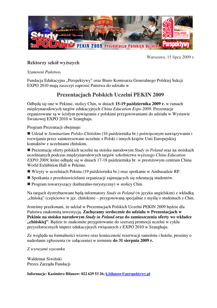 Warszawa, 15 lipca 2009 r. Rektorzy szkół wyższych Szanowni Państwo, Fundacja Edukacyjna „Perspektywy” oraz Biuro Komisarza Generalnego Polskiej Sekcji EXPO 2010 mają zaszczyt zaprosić Państwa do udziału w Prezentacjach Polskich Uczelni PEKIN 2009 Odbędą się one w Pekinie, stolicy Chin, w dniach 15-19 października 2009 r. w ramach międzynarodowych targów edukacyjnych China Education Expo 2009. Prezentacje organizowane są w ścisłym powiązaniu z polskimi przygotowaniami do udziału w Wystawie Światowej EXPO 2010 w Szanghaju. Program Prezentacji obejmuje: Udział w Seminarium Polsko-Chińskim (16 października br.) poświęconym nawiązywaniu i rozwijaniu przez zainteresowane uczelnie z Polski i innych krajów Unii Europejskiej kontaktów z uczelniami chińskim. Prezentację oferty polskich uczelni na stoisku narodowym Study in Poland oraz na stoiskach uczelnianych podczas międzynarodowych targów szkolnictwa wyższego China Education EXPO 2009, które odbędę się w dniach 17-18 października br. w prestiżowym centrum China World Exhibition Hall w Pekinie. Wizyty w uczelniach Pekinu (19 października br.) oraz spotkanie w Ambasadzie RP. Spotkania z przedstawicielami organizacji zajmujących się rekrutacją studentów. Program towarzyszący (kulturalno-turystyczny) w stolicy Chin. Na targach dystrybuowane będą informatory Study in Poland (w języku angielskim) z wkładką „chińską” (częściowo w jęz. chińskim) – przygotowaną specjalnie z myślą o studentach z Chin. Jesteśmy przekonani, że udział w Prezentacjach Polskich Uczelni PEKIN 2009 będzie dla Państwa znakomitą inwestycją. Zachęcamy serdecznie do udziału w Prezentacjach w Pekinie na stoisku narodowym Study in Poland oraz do zamieszczenia oferty we wkładce „chińskiej”. Będzie to znakomite przygotowanie do szerszej promocji uczelni w cyklu przyszłorocznych imprez edukacyjnych związanych z EXPO 2010 w Szanghaju. Ze względu na formalności wizowe oraz konieczność rezerwacji samolotu i hotelu, prosimy o nadesłanie zgłoszenia (w załączeniu) w terminie do 31 sierpnia 2009 r. Z wyrazami szacunku Waldemar Siwiński Prezes Zarządu Fundacji Informacje: Kazimierz Bilanow: 022 629 53 26; [email protected] Prezentacje Polskich Uczelni – PEKIN 2009 w ramach China Education Expo 2009 Pekin, 15-19.10.2009 ZGŁOSZENIE UCZESTNICTWA Nazwa uczelni: ............................................................................................................................. Ulica: ............................................................. Miejscowość: ....................................................... Osoba odpowiedzialna: ................................................................................................................ tel. kontaktowy: .......................................................e-mail........................................................... Zgłaszamy wyjazd następujących osób: 1. Imię i nazwisko (wg paszportu) .............................................................................................. Pełniona funkcja ..................................................................................................................... e-mail ................................................................................tel. kom......................................... adres zam...........................................................................data ur........................................... numer paszportu .............................................................. PESEL …...................................... 2. Imię i nazwisko (wg paszportu) ….......................................................................................... Pełniona funkcja ..................................................................................................................... e-mail ............................................................................... tel. kom......................................... adres zam...........................................................................data ur........................................... numer paszportu .............................................................. PESEL …...................................... Zamawiamy prezentację uczelni we wkładce „chińskiej” do katalogu Study in Poland (w jęz. angielskim i chińskim, kolor, format A4, nakład 3000 egz.) Upoważniamy Fundację Edukacyjną Perspektywy do wystawienia faktury VAT bez podpisu odbiorcy. ................................................ .............................................. data, miejscowość pieczęć i podpis -------------------------------------------------------------------------------------------------------------1. Koszt uczestnictwa jednej osoby: a) z uczelni uczestniczących w programie „Study in Poland”: b) z uczelni nie uczestniczących w programie „Study in Poland”: 7100 zł + 22% VAT 8600 zł + 22% VAT Obejmuje: przelot samolotem na trasie Warszawa-Pekin-Warszawa, transfery lotnisko-hotel-lotnisko, wizę i ubezpieczenie, pokój 1-osobowy ze śniadaniem, ekspozycję materiałów uczelni na wspólnym stoisku „Study in Poland”, udział w seminariach i konferencjach, udział w programie towarzyszącym. Uwaga: wylot z Warszawy do Pekinu powrót z Pekinu do Warszawy 14 października 2009 r. (środa) 20 października 2009 r. (wtorek) 2. Prezentacja we wkładce chińskiej do informatora Study in Poland (1 str.): 1500 zł + 22% VAT Termin nadsyłania zgłoszeń: do 31 sierpnia 2009 r., fax 022 629 16 17 Termin nadsyłania materiałów do wkładki: do 15 września 2009 r., e-mail: [email protected] Informacje: dr Kazimierz Bilanow, tel. 022 629 53 26, 022 622 64 10, e-mail: [email protected]