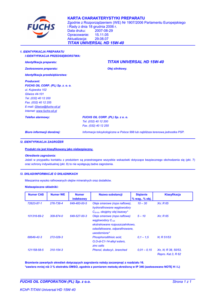 KARTA CHARAKTERYSTYKI PREPARATU Zgodnie z Rozporządzeniem (WE) Nr 1907/2006 Parlamentu Europejskiego i Rady z dnia 18 grudnia 2006 r. Data druku: 2007-08-29 Opracowanie: 15.11.05 Aktualizacja: 29.08.07 TITAN UNIVERSAL HD 15W-40 1. IDENTYFIKACJA PREPARATU I IDENTYFIKACJA PRZEDSIĘBIORSTWA: Identyfikacja preparatu: TITAN UNIVERSAL HD 15W-40 Zastosowane preparatu: Olej silnikowy. Identyfikacja przedsiębiorstwa: Producent: FUCHS OIL CORP. (PL) Sp. z. o. o. ul. Kujawska 102 Gliwice 44-101 Tel. (032) 40 12 200 Fax. (032) 40 12 255 E-mail: [email protected] Internet: www.fuchs-oil.pl Telefon alarmowy: FUCHS OIL CORP. (PL) Sp. z o. o. Tel. (032) 40 12 200 Fax. (032) 40 12 255 Biuro informacji doraźnej: Informacja toksykologiczna w Polsce 998 lub najbliŜsza terenowa jednostka PSP. !2. IDENTYFIKACJA ZAGROśEŃ Produkt nie jest klasyfikowany jako niebezpieczny. Określenie zagroŜenia: JeŜeli w przypadku kontaktu z produktem są przestrzegane wszystkie wskazówki dotyczące bezpiecznego obchodzenia się (pkt. 7) oraz ochrony indywidualnej (pkt. 8) to nie występują Ŝadne zagroŜenia. !3. SKŁAD/INFORMACJE O SKŁADNIKACH Mieszanina wysoko rafinowanych olejów mineralnych oraz dodatków. Niebezpieczne składniki: Numer CAS Numer WE Numer indeksowy 72623-87-1 276-738-4 649-483-00-5 101316-69-2 309-874-0 649-527-00-3 68649-42-3 272-028-3 121158-58-5 310-154-3 Nazwa substancji StęŜenie % wag., % obj. Oleje smarowe (ropa naftowa), hydrorafinowane węglowodory C20-50, obojętny olej bazowy* Oleje smarowe (ropa naftowa) węglowodory C>25 ekstrahowane rozpuszczalnikowo, odasfaltowane, odparafinowane, uwodornione* Phosphorodithioic acid, O,O-di-C1-14-alkyl esters, zinc salts Phenol, dodecyl-, branched Klasyfikacja 10 – 30 Xn; R 65 5 – 10 Xn; R 65 0,1 – 1,5 N; R 51/53 0,01 – 0,15 Xn, N; R 38, 50/53, Repro. Kat.3, R 62 Brzmienie zawartych określeń dotyczących zagroŜenia naleŜy zaczerpnąć z rozdziału 16. *zawiera mniej niŜ 3 % ekstraktu DMSO, zgodnie z pomiarem metodą określoną w IP 346 (zastosowano NOTĘ H i L) FUCHS OIL CORPORATION (PL) Sp. z o.o. KChP-TITAN Universal HD 15W-40 Strona 1 z 1 KARTA CHARAKTERYSTYKI PREPARATU Zgodnie z Rozporządzeniem (WE) Nr 1907/2006 Parlamentu Europejskiego i Rady z dnia 18 grudnia 2006 r. Data druku: 2007-08-29 Opracowanie: 15.11.05 Aktualizacja: 29.08.07 TITAN UNIVERSAL HD 15W-40 4. PIERWSZA POMOC Wskazówki ogólne: Zanieczyszczoną produktem odzieŜ naleŜy natychmiast usunąć. Nie wkładać do kieszeni czyściwa nasączonego produktem. NaraŜenie przez drogi oddechowe: Zapewnić dopływ świeŜego powietrza; w razie dolegliwości wezwać lekarza. NaraŜenie przez kontakt ze skórą: Zanieczyszczoną skórę natychmiast przemyć duŜą ilością wody z mydłem. JeŜeli wystąpi podraŜnienie, zasięgnąć porady lekarza. NaraŜenie przez kontakt z oczami: Zanieczyszczone oczy, przemyć dostateczną ilością wody rozdzielając osobno powieki, później zasięgnąć porady lekarza. NaraŜenie przez drogi pokarmowe: W przypadku wystąpienia zaburzeń zasięgnąć porady lekarza. 5. POSTĘPOWANIE W PRZYPADKU POśARU Odpowiednie środki gaśnicze: Woda (rozpylony strumień wody). Piana (piana odporna na działanie alkoholi). Środki gaśnicze proszkowe. Dwutlenek węgla i piasek.. DuŜy poŜar zwalczać przy uŜyciu rozproszonych strumieni wodnych lub piany odpornej na działanie alkoholi. Środki gaśnicze dostosować odpowiednio do sytuacji. Środki gaśnicze, które nie mogą być uŜywane ze względów bezpieczeństwa: Silny strumień wody. Niebezpieczne produkty spalania: Mogą tworzyć się niebezpieczne gazy tlenek węgla i dwutlenek węgla. Specjalny sprzęt ochronny dla straŜaków: Stosować indywidualne środki ochrony dróg oddechowych. 6. POSTĘPOWANIE W PRZYPADKU NIEZAMIERZONEGO UWOLNIENIA DO ŚRODOWISKA Indywidualne środki ostroŜności: Zapewnić dostateczną wentylację. UŜywać środki ochrony indywidualnej. Przechowywać z dala od źródeł zapłonu. Produkt powoduje wysokie zagroŜenie w przypadku, kiedy zostanie wylany/rozlany. Środki ostroŜności w zakresie ochrony środowiska: Przechowywać z dala od ścieków, powierzchni wodnych, wód powierzchniowych, gleby. Zapobiegać zanieczyszczeniu wody poprzez właściwe usuwanie. Metody oczyszczania (usuwania): Zebrany produkt usunąć zgodnie z aktualnymi przepisami. Stosować materiały wiąŜące WiąŜe się z ziemią okrzemkową, piaskiem, trocinami oraz chemicznymi materiałami wiąŜącymi. FUCHS OIL CORPORATION (PL) Sp. z o.o. KChP-TITAN Universal HD 15W-40 Strona 2 z 2 KARTA CHARAKTERYSTYKI PREPARATU Zgodnie z Rozporządzeniem (WE) Nr 1907/2006 Parlamentu Europejskiego i Rady z dnia 18 grudnia 2006 r. Data druku: 2007-08-29 Opracowanie: 15.11.05 Aktualizacja: 29.08.07 TITAN UNIVERSAL HD 15W-40 !7. POSTĘPOWANIE Z PREPARATEM I JEGO MAGAZYNOWANIE Postępowanie z preparatem: Stosować typowe środki ostroŜności w postępowaniu z chemikaliami. Stosować wyłącznie w dobrze wentylowanych pomieszczeniach. Nie jeść i nie pić oraz nie palić tytoniu podczas stosowania produktu. Nie podgrzewać produktu do temperatury bliskiej temperaturze zapłonu. Unikać tworzenia się aerozoli. Magazynowanie: Wymogi dotyczące pomieszczeń magazynowych i pojemników: Przechowywać pojemnik szczelnie zamknięty w suchym pomieszczeniu. Przechowywać w chłodnym miejscu. Zastosować środki ostroŜności zapobiegające wyładowaniom elektrostatycznym. Przechowywać z dala od źródeł zapłonu i otwartego ognia. Wskazówki dotyczące składowania razem z innymi produktami: Nie przechowywać razem z Ŝywnością , napojami i paszami dla zwierząt. Podstawy prawne: Rozporządzenia Ministra Pracy i Polityki Socjalnej z dnia 26 września 1997r. w sprawie ogólnych przepisów bezpieczeństwa i higieny pracy (Dz. U. Nr 169 poz. 1650 z późn. zm.). Rozporządzenie Ministra Zdrowia z dnia 14 marca 2003 r. w sprawie sposobu oznakowania miejsc, rurociągów oraz pojemników i zbiorników słuŜ