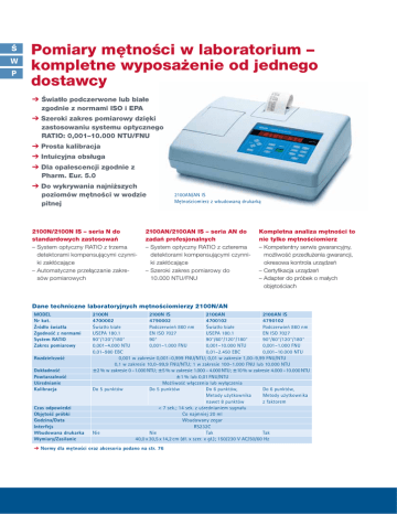 Ś W P Pomiary mętności w laboratorium – kompletne wyposażenie od jednego dostawcy ➔ Światło podczerwone lub białe zgodnie z normami ISO i EPA ➔ Szeroki zakres pomiarowy dzięki zastosowaniu systemu optycznego RATIO: 0,001–10.000 NTU/FNU ➔ Prosta kalibracja ➔ Intuicyjna obsługa ➔ Dla opalescencji zgodnie z Pharm. Eur. 5.0 ➔ Do wykrywania najniższych poziomów mętności w wodzie pitnej 2100N/2100N IS – seria N do standardowych zastosowań – System optyczny RATIO z trzema detektorami kompensującymi czynniki zakłócające – Automatyczne przełączanie zakresów pomiarowych 2100AN/AN IS Mętnościomierz z wbudowaną drukarką 2100AN/2100AN IS – seria AN do zadań profesjonalnych – System optyczny RATIO z czterema detektorami kompensującymi czynniki zakłócające – Szeroki zakres pomiarowy do 10.000 NTU/FNU Kompletna analiza mętności to nie tylko mętnościomierz – Kompetentny serwis gwarancyjny, możliwość przedłużenia gwarancji, okresowa kontrola urządzeń – Certyfikacja urządzeń – Adapter do próbek o małych objętościach Dane techniczne laboratoryjnych mętnościomierzy 2100N/AN MODEL Nr kat. Źródło światła Zgodność z normami System RATIO Zakres pomiarowy Rozdzielczość Dokładność Powtarzalność Uśrednianie Kalibracja Czas odpowiedzi Objętość próbki Godzina/Data Interfejs Wbudowana drukarka Wymiary/Zasilanie 2100N 2100N IS 2100AN 2100AN IS 4700002 4790002 4700102 4790102 Światło białe Podczerwień 860 nm Światło białe Podczerwień 860 nm USEPA 180.1 EN ISO 7027 USEPA 180.1 EN ISO 7027 90°/120°/180° 90° 90°/60°/120°/180° 90°/60°/120°/180° 0,001–4.000 NTU 0,001–1.000 FNU 0,001–10.000 NTU 0,001–1.000 FNU 0,01–980 EBC 0,01–2.450 EBC 0,001–10.000 NTU 0,001 w zakresie 0,001–0,999 FNU/NTU; 0,01 w zakresie 1,00–9,99 FNU/NTU 0,1 w zakresie 10,0–99,9 FNU/NTU; 1 w zakresie 100–1.000 FNU lub 10.000 NTU ± 2 % w zakresie 0 –1.000 NTU; ± 5 % w zakresie 1.000 – 4.000 NTU; ± 10 % w zakresie 4.000 –10.000 NTU ± 1 % lub 0,01 FNU/NTU Możliwość włączenia lub wyłączenia Do 5 punktów Do 5 punktów Do 6 punktów, Do 6 punktów, Metody użytkownika Metody użytkownika nawet 8 punktów z faktorem < 7 sek.; 14 sek. z uśrednianiem sygnału Co najmniej 20 ml Wbudowany zegar RS232C Nie Nie Tak Tak 40,0 x 30,5 x 14,2 cm (dł. x szer. x gł.); 150/230 V AC/50/60 Hz ➔ Normy dla mętności oraz akcesoria podano na str. 76 Ś W P Wzorce STABL CAL oraz akcesoria do pomiarów mętności ➔ Trwałe, stabilizowane roztwory wzorcowe w butelkach lub zaplombowanych kuwetach ➔ Gotowe do użycia; bez konieczności rozcieńczania ➔ Bez konieczności przygotowywania Dwie proste metody: Umieść w przyrządzie kuwety wielokrotnego użytku lub zastosuj roztwór wzorcowy z butelek. pierwotnego roztworu formazyny ➔ Dla opalescencji zgodnie z Pharm. Eur. 5.0 Wzorce oraz akcesoria STABL CAL do pomiarów mętności i opalescencji Wzorce STABL CAL: Gotowy do użycia stabilizowany, pierwotny wzorzec formazyny, zachowujący stabilność przez 2 lata po przygotowaniu Zestawy do kalibracji 2100AN/2100AN IS Zestaw kuwet STABL CAL: < 0,1; 20; 200; 1.000; 4.000; 7.500 NTU/FNU Zestaw butelek STABL CAL 100 ml: < 0,1; 20; 200; 1.000; 4.000; 7.500 NTU/FNU Zestaw butelek STABL CAL 500 ml: < 0,1; 20; 200; 1.000; 4.000; 7.500 NTU/FNU Zestawy do kalibracji 2100N/2100N IS Zestaw kuwet STABL CAL: < 0,1; 20; 200; 1.000; 4.000 NTU/FNU Zestaw butelek STABL CAL 100 ml: < 0,1; 20; 200; 1.000; 4.000 NTU/FNU Zestaw butelek STABL CAL 500 ml: < 0,1; 20; 200; 1.000; 4.000 NTU/FNU Zestawy do kalibracji 2100P/2100P ISO Zestaw kuwet STABL CAL: < 0,1; 20; 100; 800 NTU/FNU Zestaw butelek STABL CAL 100 ml: < 0,1; 20; 100; 800 NTU/FNU Zestaw butelek STABL CAL 500 ml: < 0,1; 20; 100; 800 NTU/FNU Zestaw wzorców STABL CAL do monitorowania niskich poziomów mętności, w tym 4 butelki 100 ml: 0,10; 0,30; 0,50; 1,00 NTU/FNU, olej silikonowy, ściereczka do czyszczenia kuwet, instrukcja; stabilne przez 6 miesięcy Zestaw zawiesin wzorcowych I, II, III, IV zgodnie z Pharm. Eur. 5.0, 2100AN/AN IS z certyfikatem Zestaw kuwet STABL CAL: < 0,1; 3; 6; 18; 30 NTU/FNU Zestaw butelek STABL CAL 100 ml: < 0,1; 3; 6; 18; 30 NTU/FNU Zawiesina podstawowa do pomiarów opalescencji zgodnie z Pharm. Eur. 5.0, 2100AN/AN IS Butelka STABL CAL 100 ml: 4.000 NTU/FNU Butelka STABL CAL 500 ml: 4.000 NTU/FNU AKCESORIA DODATKOWE Kuwety okrągłe 13 mm, opak./494 Zatyczka do kuwet okrągłych LYY621 opak./1 Kuwety zapasowe z nakrętką, opak./6, dla 2100AN/2100AN IS (również dla metod wizualnych zgodnie z Pharm. Eur. 5.0) Kuwety zapasowe z nakrętką, opak./6, dla 2100P/2100P ISO Zestaw kuwet przepływowych, ręczny, dla niskich ciśnień Zestaw kuwet przepływowych, dla wysokich ciśnień Adapter na kuwety okrągłe 12 na 13 mm Adapter na kuwety okrągłe 16 mm Adapter na kuwety okrągłe 19 mm Olej silikonowy, butelka 15 ml Ściereczka do czyszczenia kuwet Zestaw odgazowujący próbkę Papier do drukarki 2100AN, opak./5 rolek Zasilacz 2100P/P ISO, 230 V AC/6 V DC NR KAT. 2659505 2659510 2659500 2662105 2662110 2662100 2659405 2659410 2659400 2714600 2897100 2897200 2896642 246142 246149 LYY621 EYG044 2084900 2434706 4744900 4745100 3033400 3033500 3033600 126936 2687300 4397500 4709000 4608000