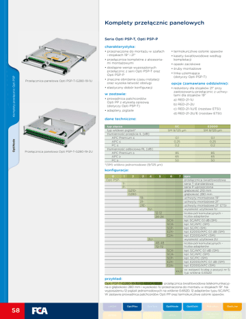 Komplety przełącznic panelowych Seria Opti PSP-T, Opti PSP-P OptiNode OptiNode Komplety przełącznic Opti PSP charakterystyka: • przeznaczone do montażu w szafach i stojakach 19" i 21" • przełącznice kompletne z akcesoriami montażowymi • dostępne wersje wyposażonych przełącznic z serii Opti PSP-T oraz Opti PSP-P Przełącznica panelowa Opti PSP-T-G280-19-1U • znaczne obniżenie czasu instalacji oraz wysoka łatwość obsługi • elastyczny dobór konfiguracji w zestawie: • prowadnica patchcordów Opti PP z etykietą opisową (dotyczy Opti PSP-T) • termokurczliwe osłonki spawów • kasety światłowodowe według kompletacji • opaski zaciskowe • śruby montażowe • linka uziemiająca (dotyczy Opti PSP-T) opcje (zamawiane oddzielnie): • reduktory dla stojaków 21" przy zastosowaniu przełącznic z uchwytami dla stojaków 19" a) RED-21-1U b) RED-21-2U c) RED-21-1U/E (rozstaw ETSI) d) RED-21-2U/E (rozstaw ETSI) • adaptery, pigtaile dane techniczne: Przełącznica panelowa Opti PSP-T-G280-19-2U typ złącza typ włókien pigtaili* tłumienność przejścia IL [dB] APC Premium ≤ APC ≤ PC ≤ tłumienność odbiciowa RL [dB] APC Premium ≥ APC ≥ PC ≥ SC SM 9/125 μm E2000 SM 9/125 μm 0,1 0,25 0,2 0,1 0,25 0,2 85 65 50 85 65 50 *(SM) włókno jednomodowe (9/125 µm) konfiguracje: 0 Opti PSP- 1 TP- 2 3 4 5 6 G210G280192121E1U12-12 24-24 SCXSCASCPE2XE2A2U48-48 72-72 SCXSCASCPE2XE2A- 7 opis przełącznica światłowodowa seria T standardowa seria P uproszczona głębokość 210 mm głębokość 280 mm uchwyty montażowe 19” uchwyty montażowe 21” uchwyty montażowe 21” ETSI wysokość użytkowa 1U liczba pól komutacyjnych liczba adapterów kpl. SC/APC 0,1 dB (SM) kpl. SC/APC (SM) kpl. SC/PC (SM) kpl. E2000/APC 0,1 dB (SM) kpl. E2000/APC (SM) wysokość użytkowa 2U liczba pól komutacyjnych liczba adapterów kpl. SC/APC 0,1 dB (SM) kpl. SC/APC (SM) kpl. SC/PC (SM) kpl. E2000/APC 0,1 dB (SM) kpl. E2000/APC (SM) xx wstawić liczbę z pozycji nr 5; xxJ2 typ włókna G.652D przykład: Opti PSP-T-G280-19-1U-12-12SCA-12J2 – przełącznica światłowodowa telekomunikacyjna o głębokości 280 mm i wysokości 1U przeznaczona do montażu w stojakach 19". Na wyposażeniu 12 pigtaili jednomodowych na włóknie G.652D, 12 adapterów typu SC/APC. W zestawie prowadnica patchcordów Opti PP oraz termokurczliwe osłonki spawów. 58 xWDM OptiPlex OptiTest OptiNode OptiDukt MikroKan OptiLine OPGW FibAir FTTA xPON OptiHome MDU OptiHome SDU OptiHome FITH